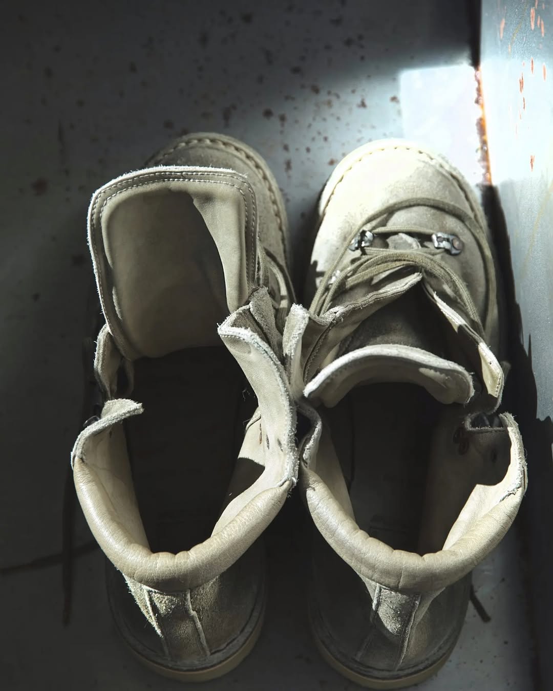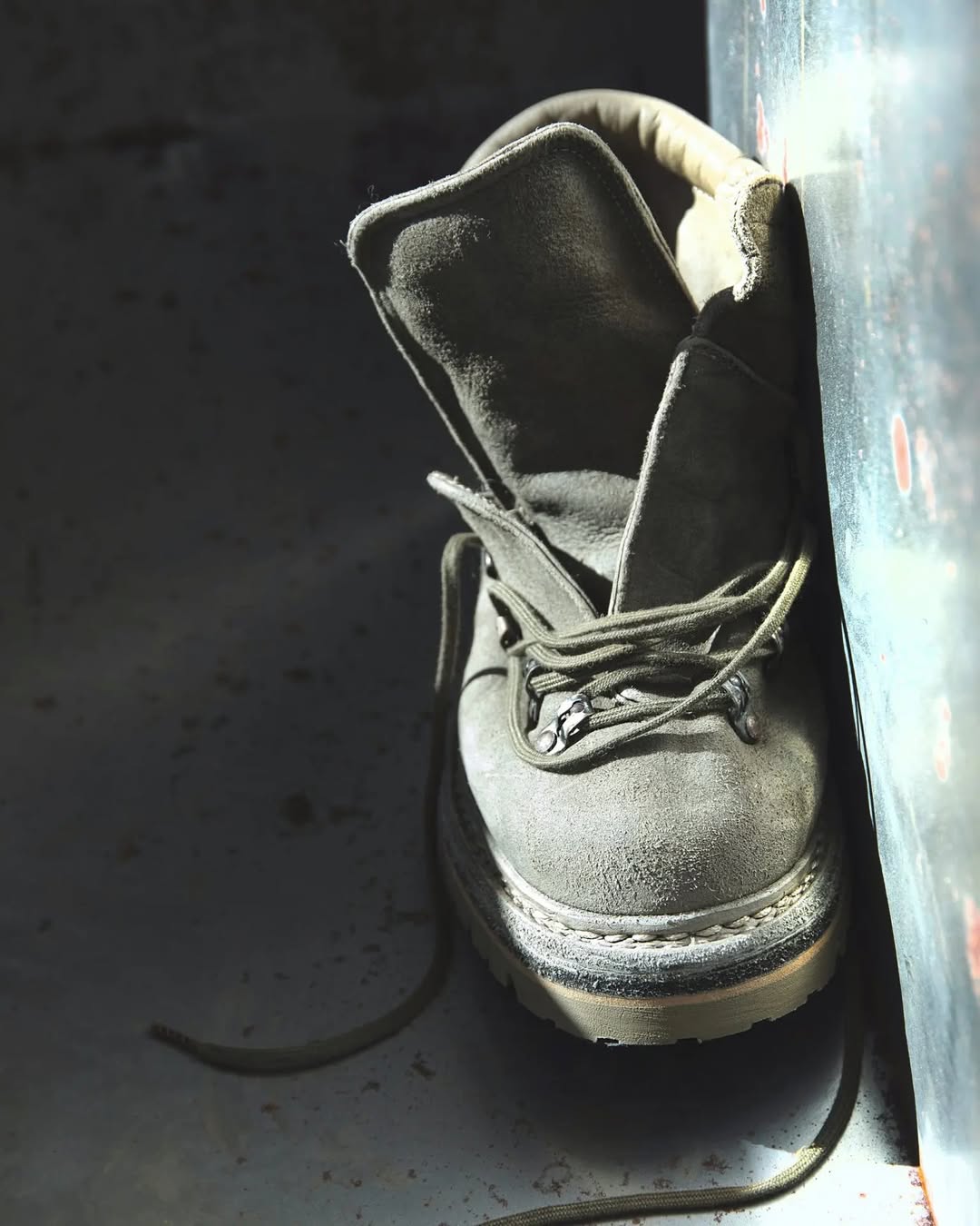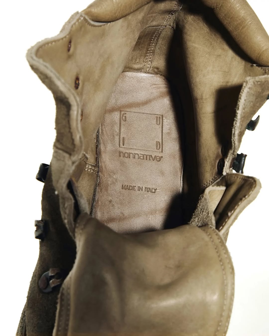 这双新推出的 HIKING BOOTS 在结构上延续传统登山靴的轮廓,但通过反绒皮材质的使用,削弱了原有的粗犷感,转而呈现出一种更加内敛、偏日系的气质。低饱和的 Vintage Khaki 色调经过 Guidi 标志性的翻滚染色工艺处理,搭配做旧处理的金属鞋眼与挂钩呈现出丰富纹理。