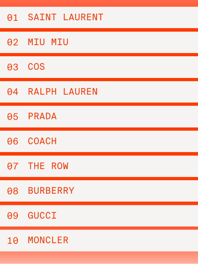 位于榜单头部的品牌无需过多介绍,更值得关注的或许是 BURBERRY 和 GUCCI。这两个品牌在本季榜单中的排名均上升 5 位,分别位列第 8 和第 9 名,表明了品牌通过档案重塑、严谨的设计语言对接当代流行的成功。同时,这背后有着非常典型的产品逻辑。