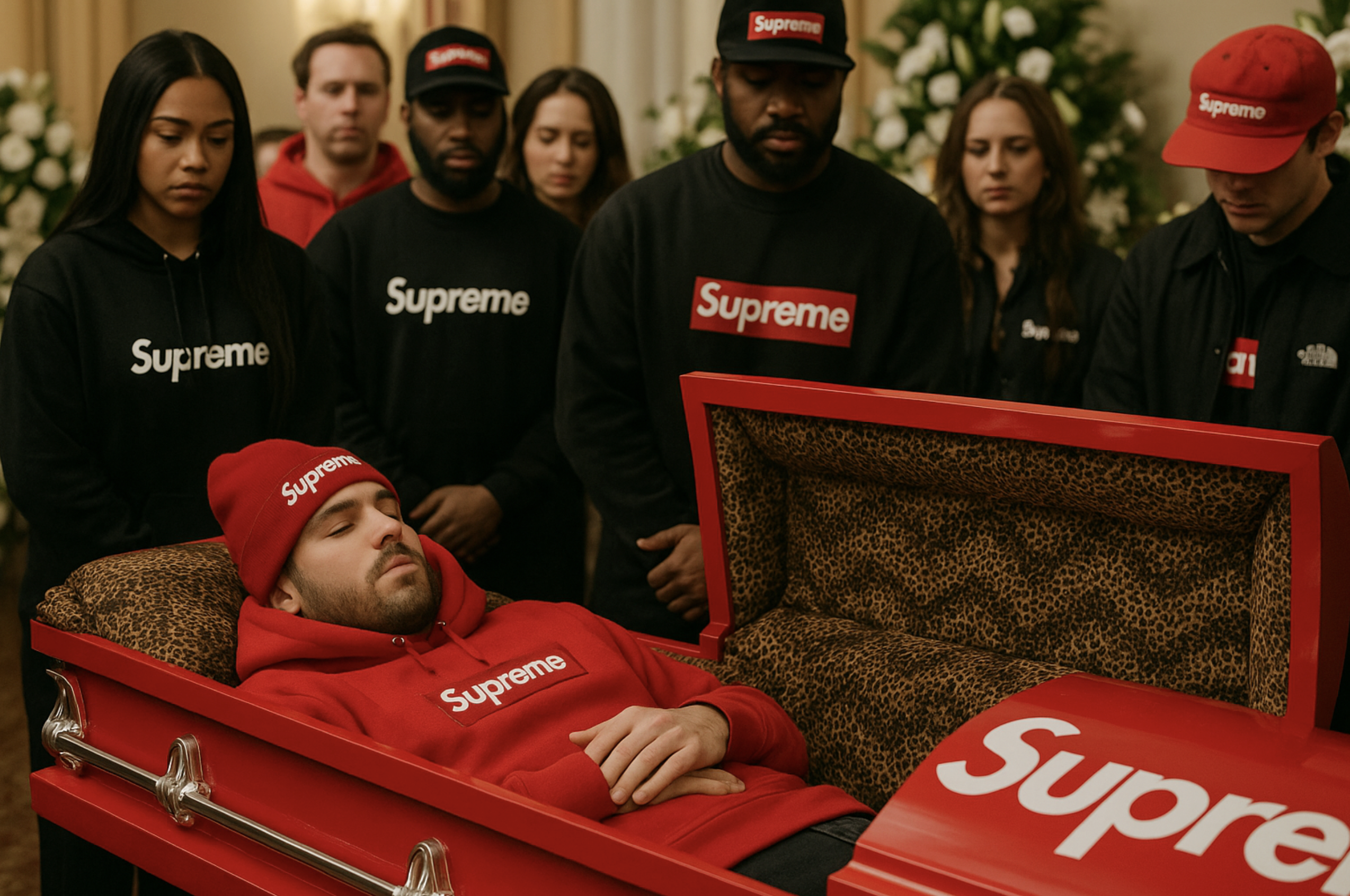 当然,争议也不可避免。有人会说这是对死亡的轻佻消费,是道德层面的越界;也有人会认为,这恰恰是 Supreme 最核心的价值——把系统性禁忌变成商品,再把商品变成话题。这是一种把荒诞推向极端的姿态:当潮流已经什么都能卖的时候,它是在冒犯你呢,还是在启发你?