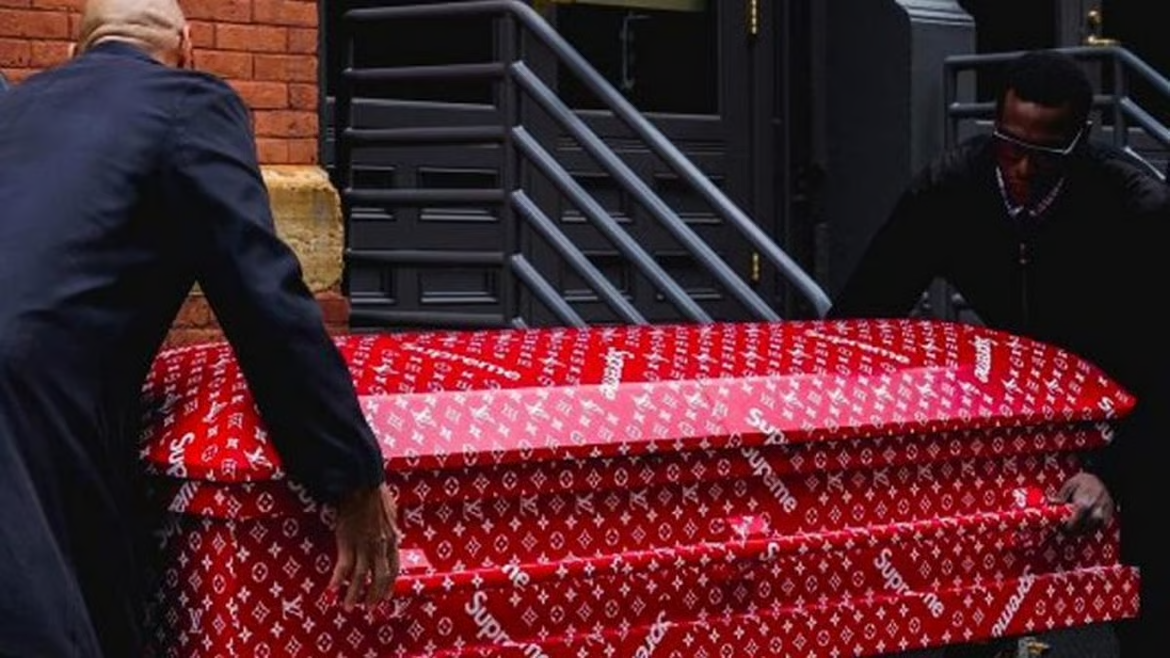 这口棺材几乎可以说是近几年「最Supreme」的一件单品。当曝光图刚出现,社媒上的讨论就已经失控——因为它把「死亡」这种无论是潮流文化还是主流文化都长期回避的终极议题,用一种刻意美化或娱乐化的形式,直接搬进了发售清单。