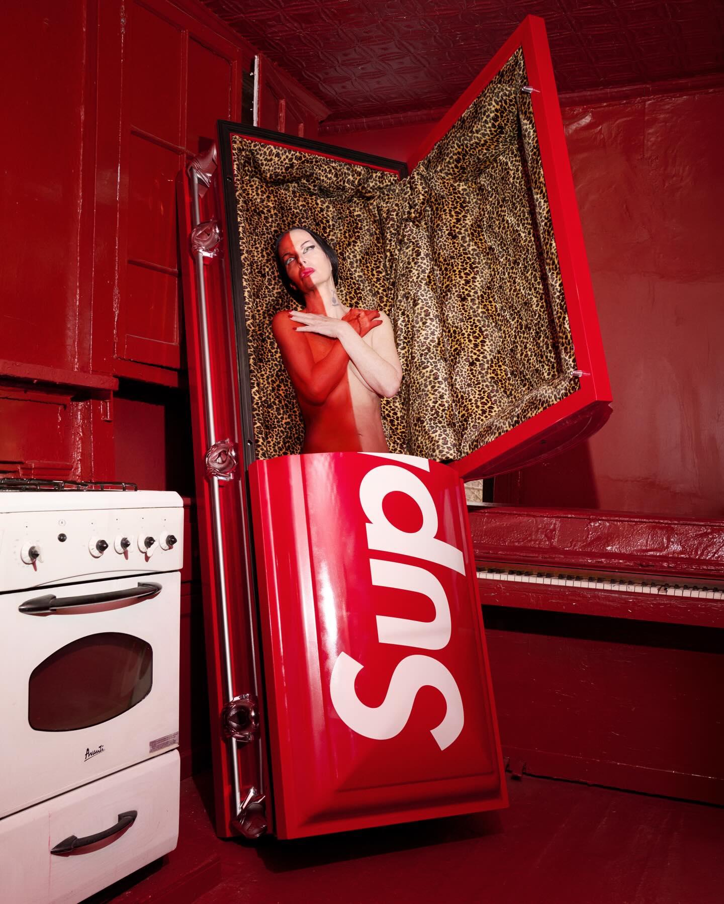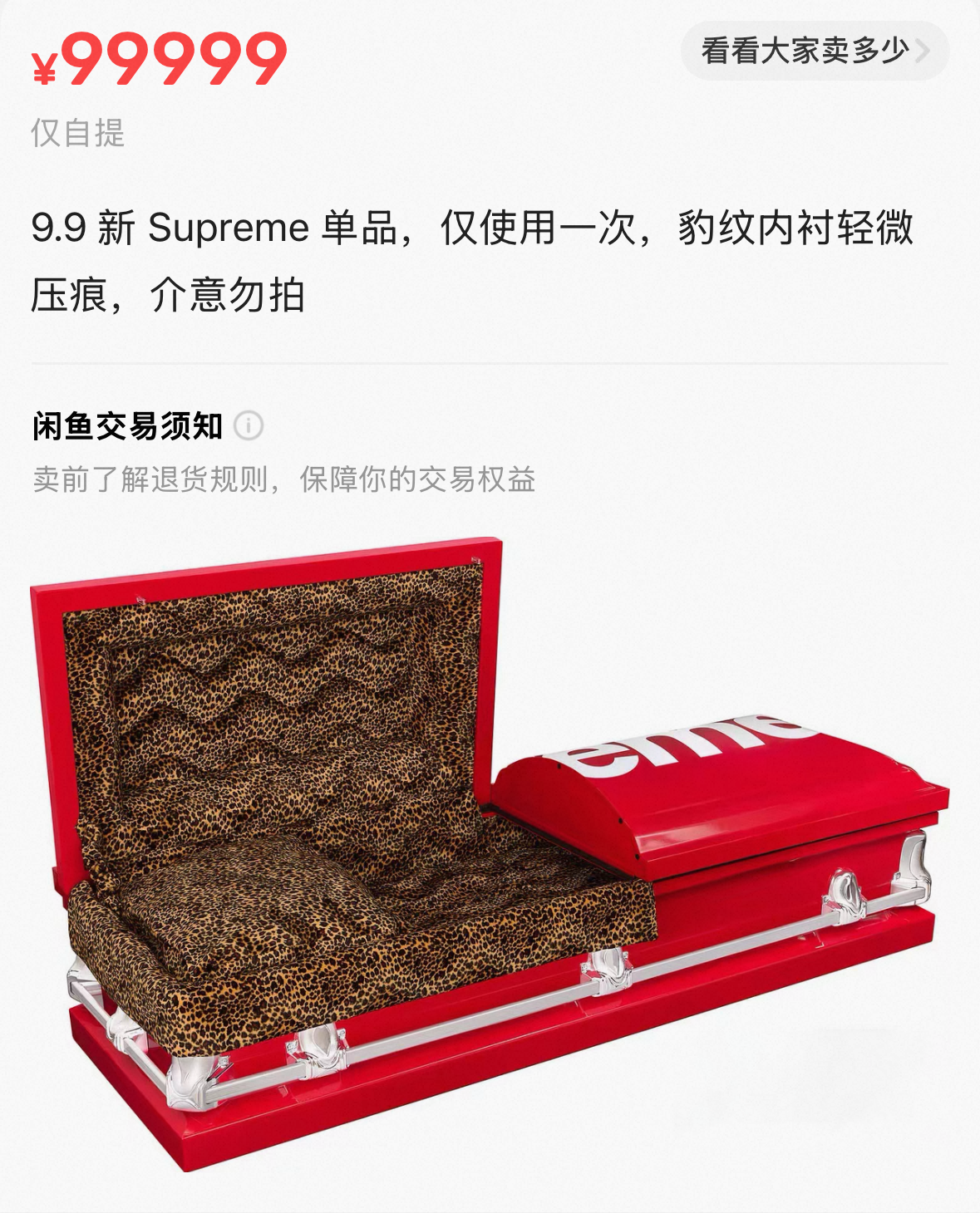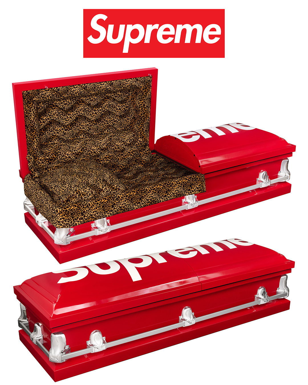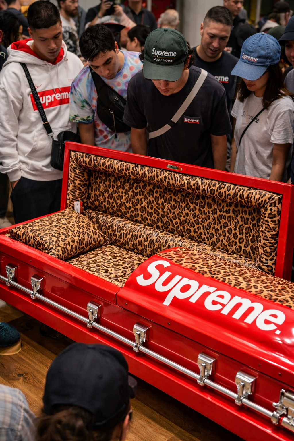 回看 Supreme 历来的周边单品,从砖头、氧气瓶、灭火器到工具箱,包括这次的棺材、ATM机和拳击台,Supreme 一直在把「非潮流物件」强行纳入潮流系统,用荒诞对抗功能主义,用反消费的姿态制造更极致的消费冲动,而棺材把这条逻辑推到了一个无法再被忽视的临界点。当我看到棺材的豹纹内衬时,我真的有种想进去躺一下睡个午觉的感觉。