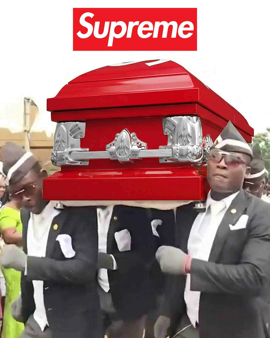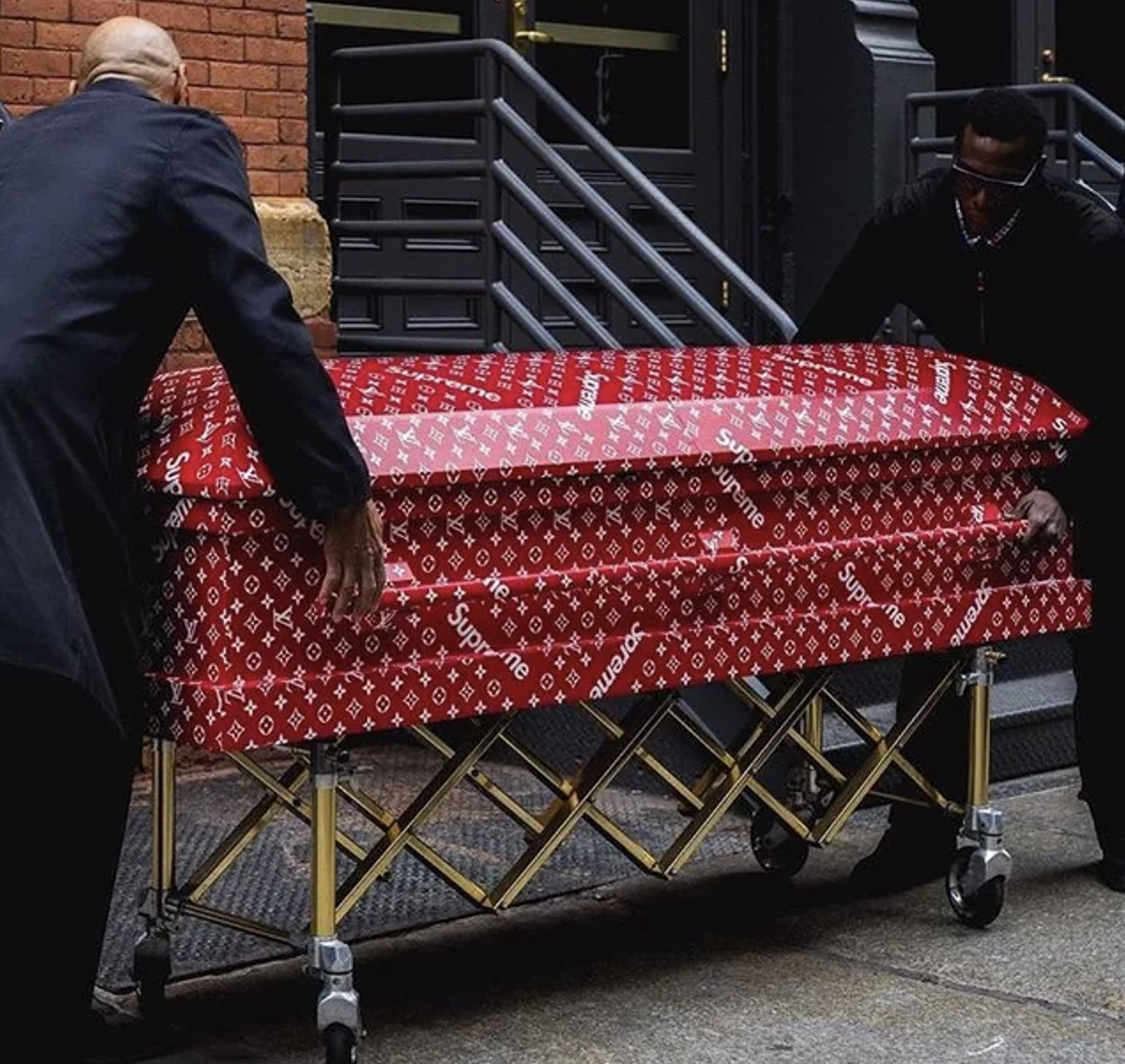 说来也更是抽象:Supreme 的主打色是红色,而在中国语境中,死亡属于「白事」,这样的组合算不算「红白喜事」?再加上「见棺发财」这样的民间说法,感觉和中国文化颇有联系?多年前看到网友自制的 LOUIS VUITTON x Supreme 棺材时,就有想过 Supreme 别真给这玩意做出来卖吧?但转念又觉得怎么会有这个「胆量」…事实证明真没什么敢不敢,只有想不想。