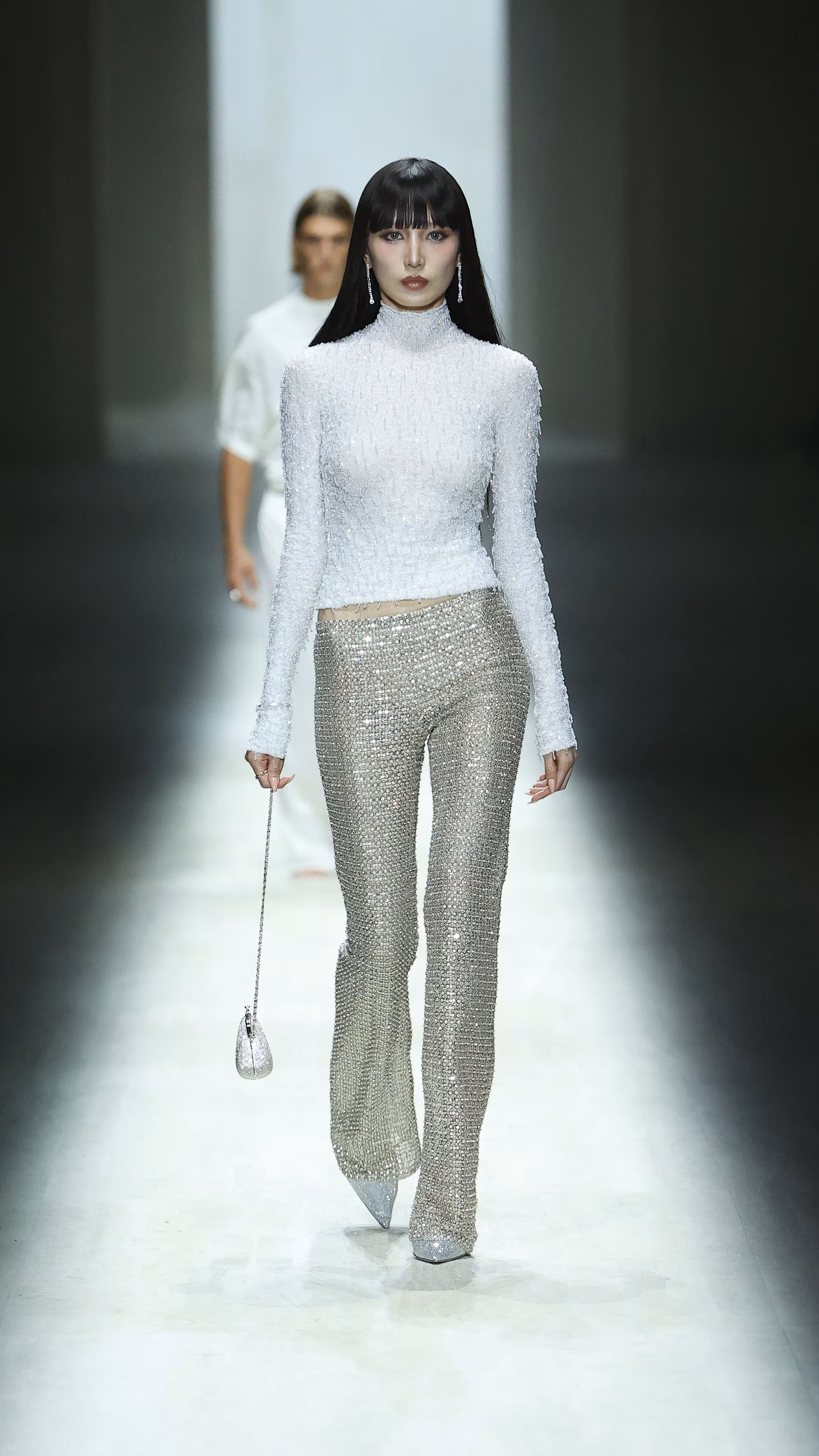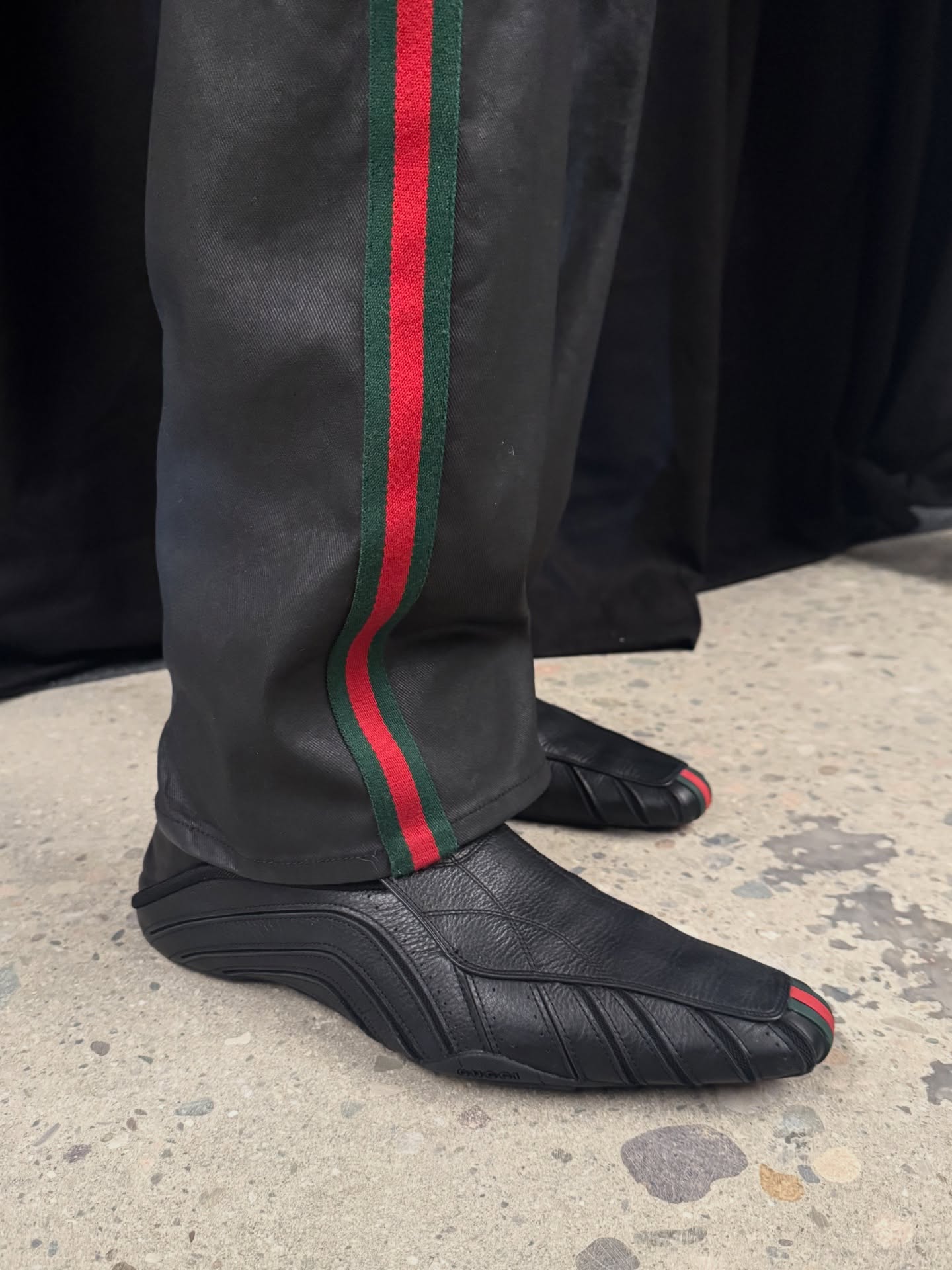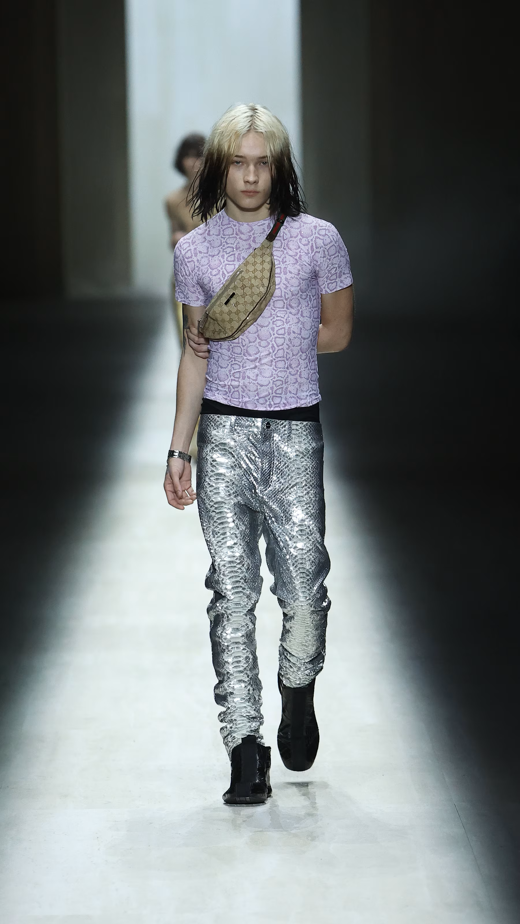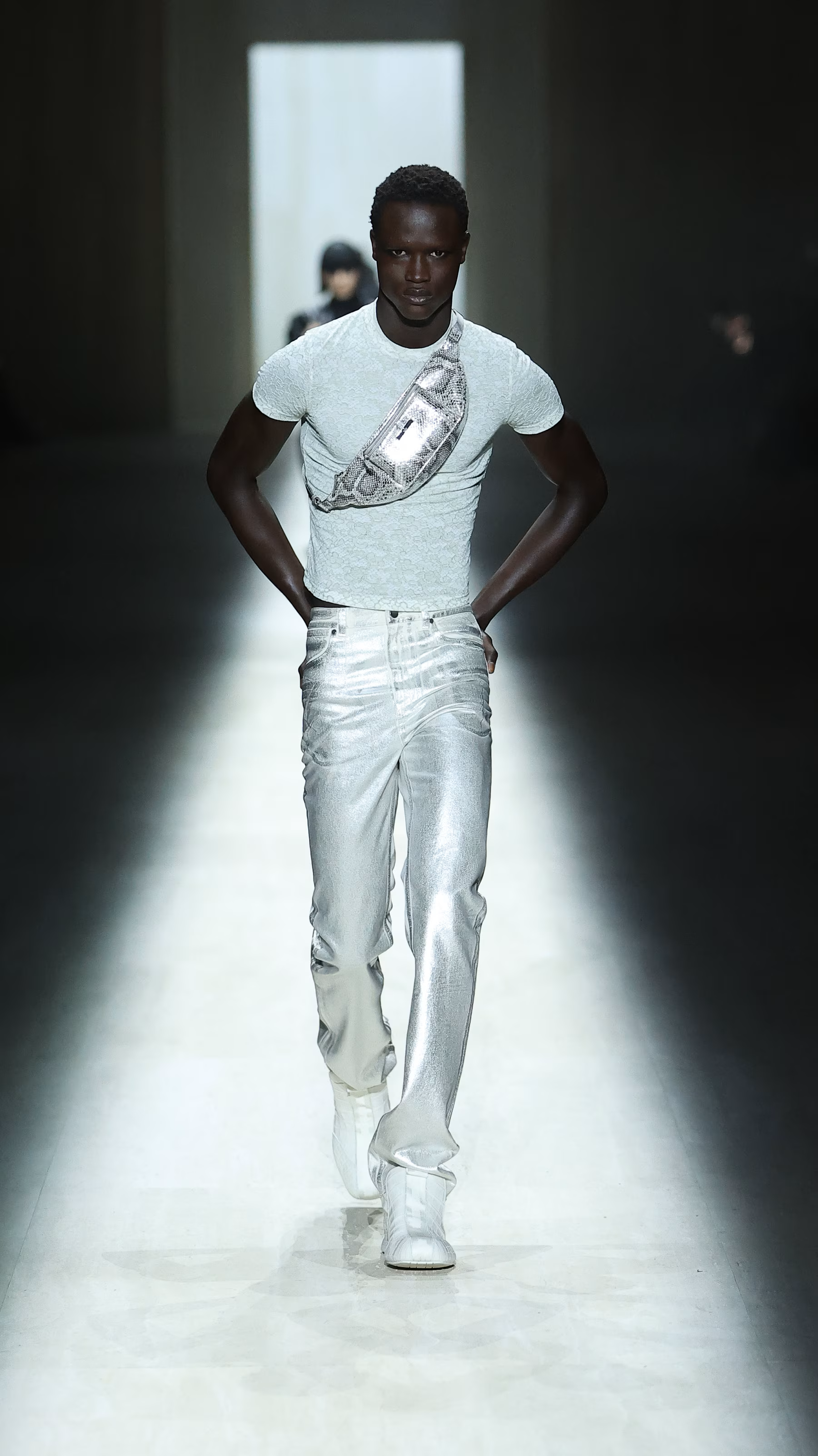 虽然 Demna 仍然找到一丝空隙释放他的时尚幽默感:模特 Fakemink 在 T 台上停下脚步看手机的瞬间,逗笑了不少现场观众,也在社媒平台上被疯狂转载。但值得注意的是,Demna 在这一季中,并未延续他在 Balenciaga 时期那种不断挑战审美边界、制造冲突与不适感的姿态。