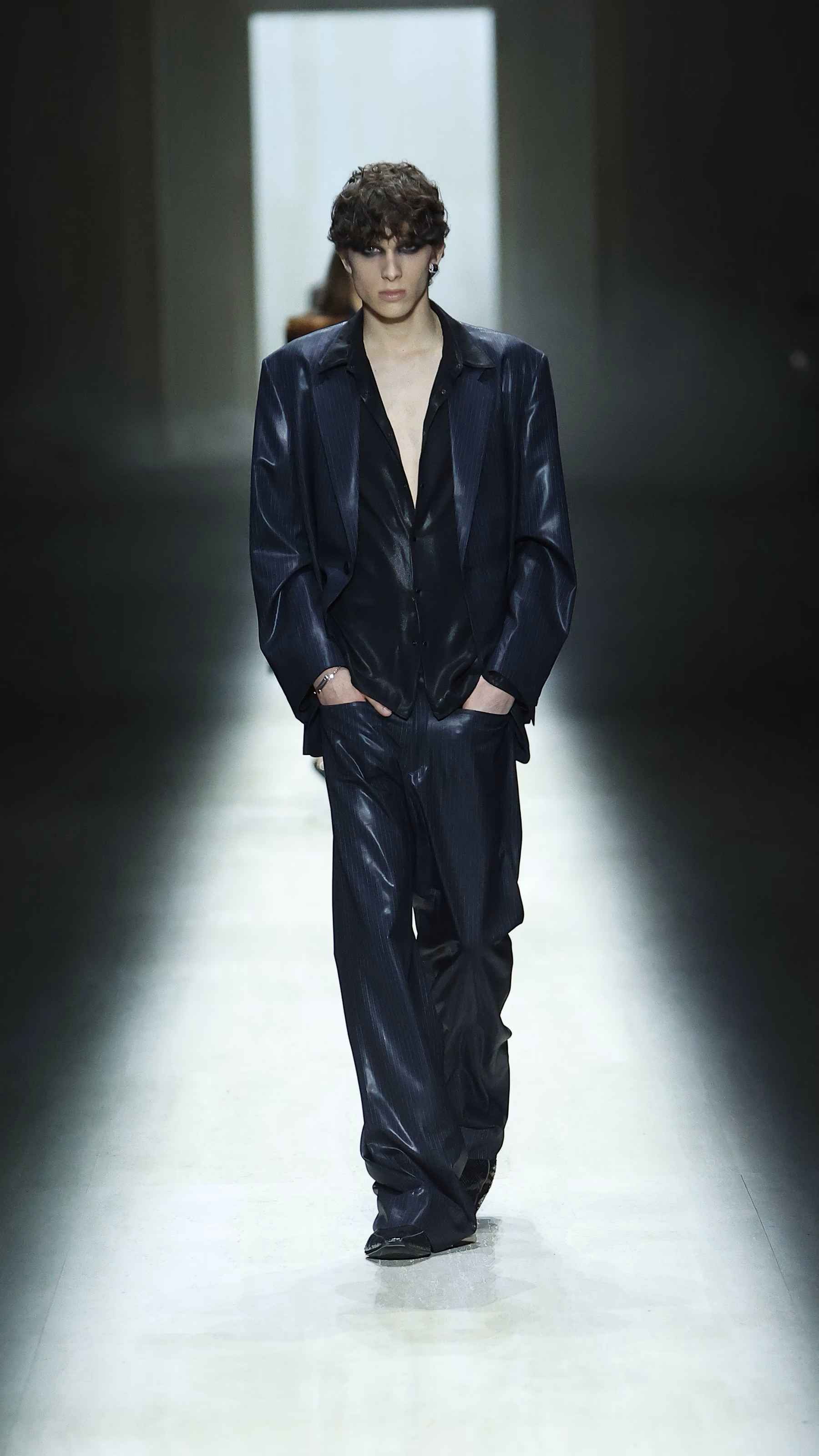大廓形消失,强结构与夸张比例被系统性收回;取而代之的是更贴近身体的修身剪裁,以及对比例、线条与材质的高度控制。