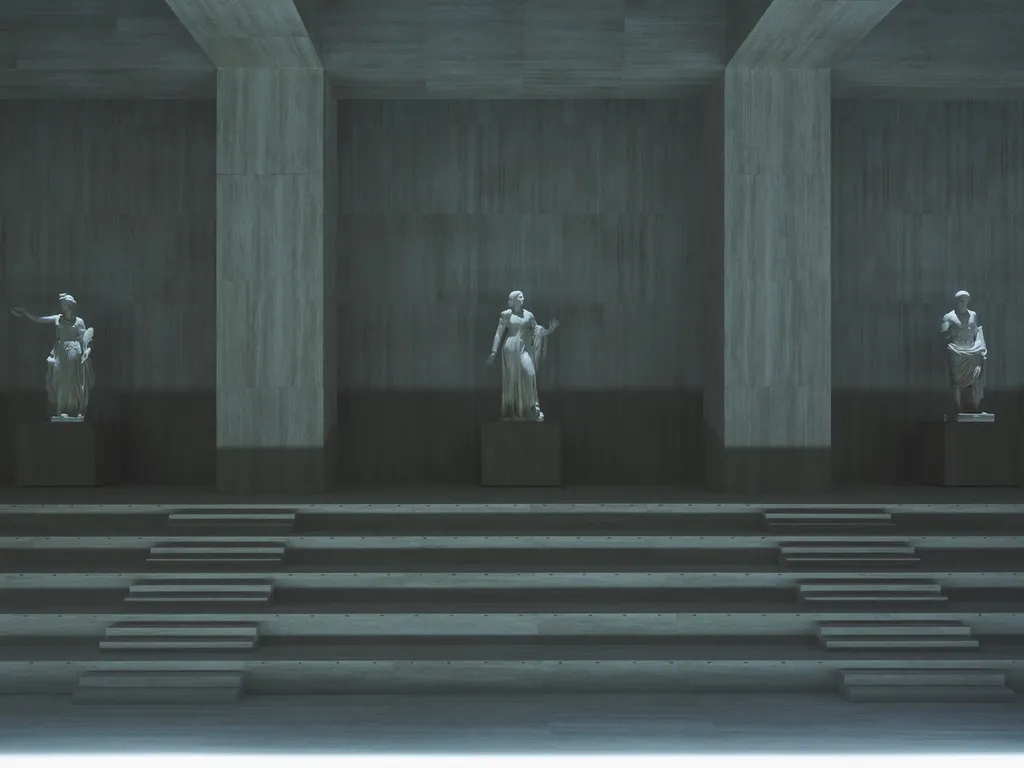 除了商业机制本身,秀场空间的选择同样服务于这一「重回中心」的目标。通过类美术馆式的空间设置与古典雕塑复制品的引入,Demna 在视觉层面重新唤起了 GUCCI 与意大利文化之间的深层关联。这种处理并不追求戏剧化的震撼,而是强调一种文化层面的稳定感与延续性。