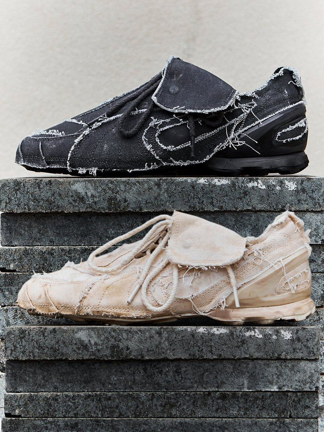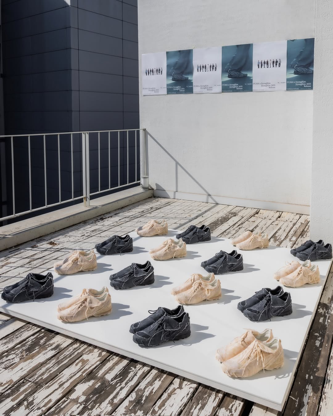在以 PUMA VS1 为基础的鞋款之上,通过毛边、裸露缝线等手法强化「未完成」感,同时模糊了鞋款原本的结构轮廓。此外双方还将重点放在了时间与自然因素的介入上,以日晒漂白工艺与非标准化的染色方式,让每一双鞋在色泽与表面状态上都呈现出细微差异。