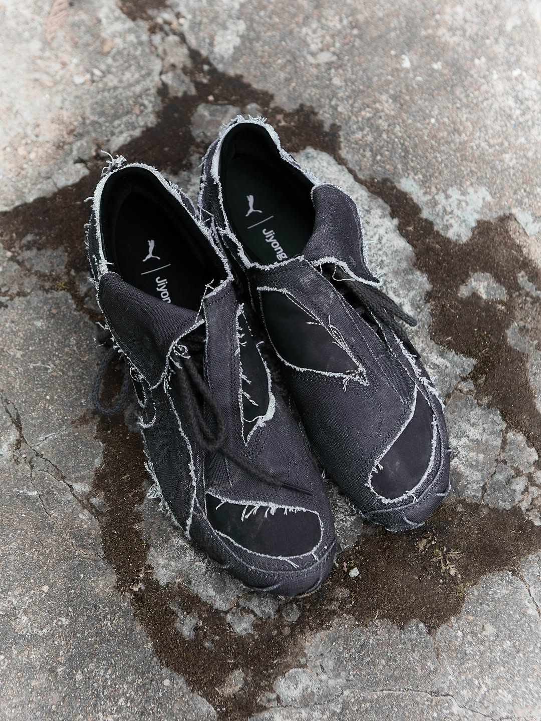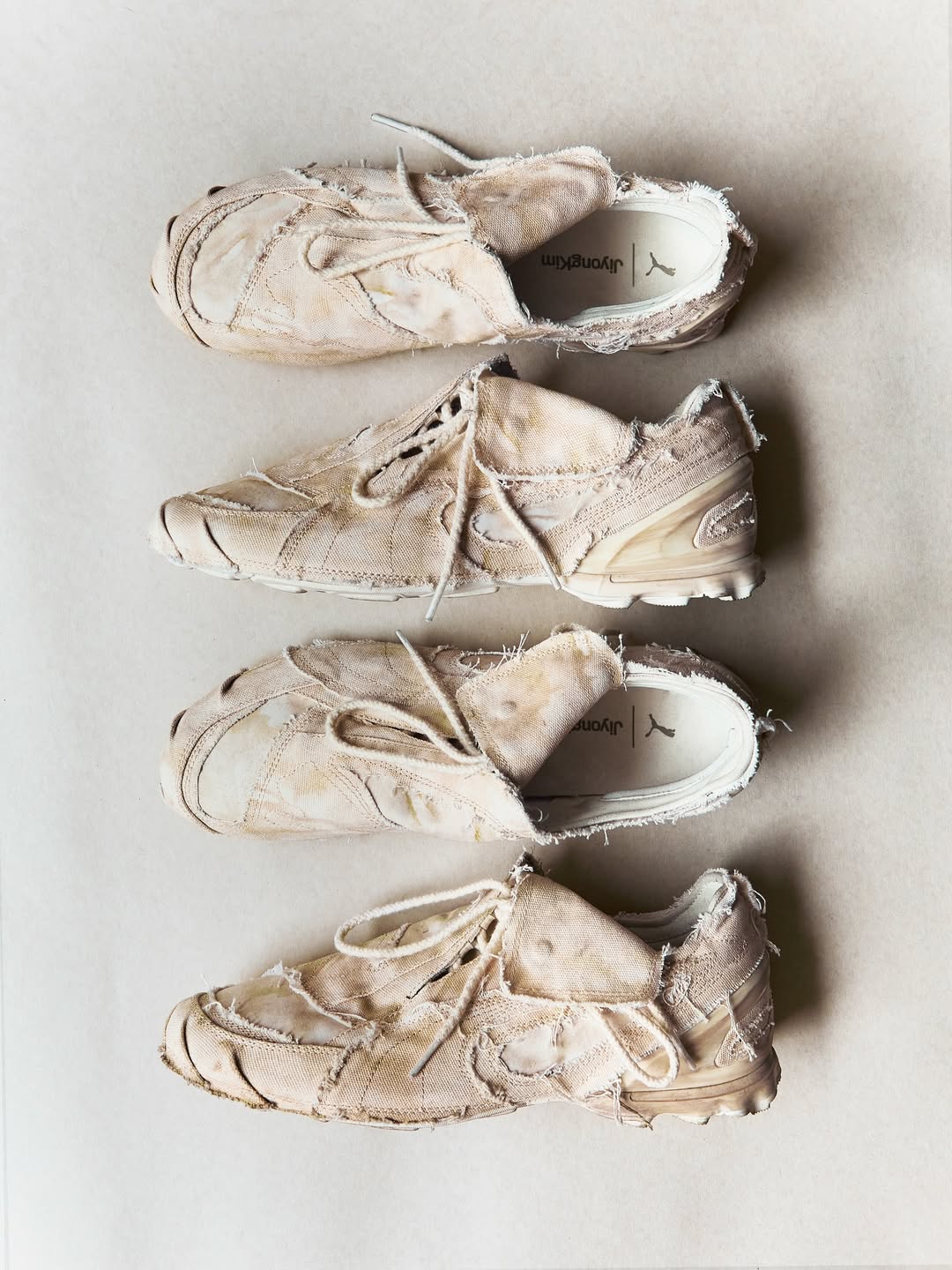 韩国设计师品牌 JiyongKim 近年来在国际时装舞台上崭露头角,而其标志性的「日晒(Sun-bleached)」染色工艺也成为其最具辨识度的视觉符号。在此次与 PUMA 的联名系列中,品牌便将这种元素注入到了鞋履的设计之中。