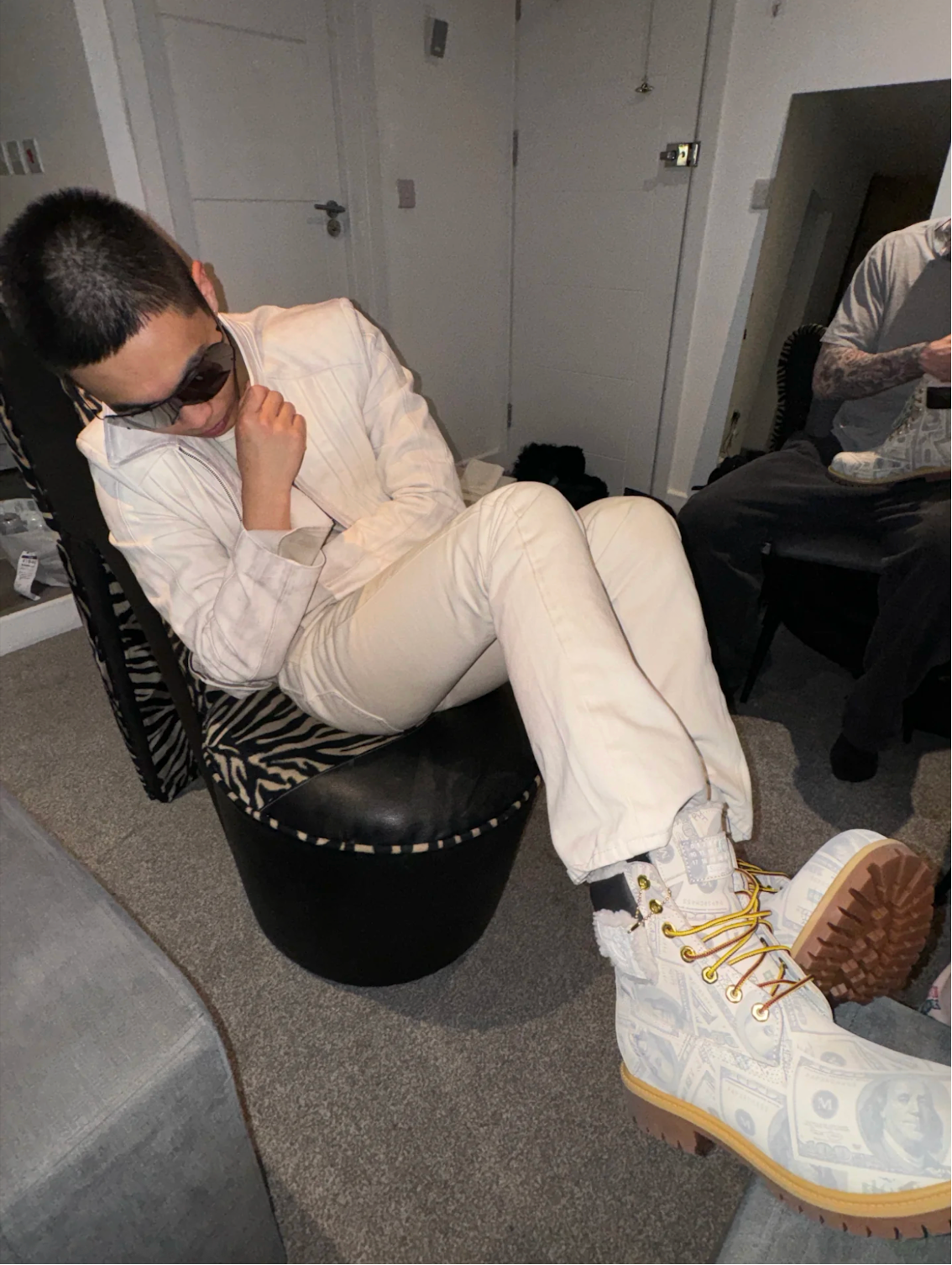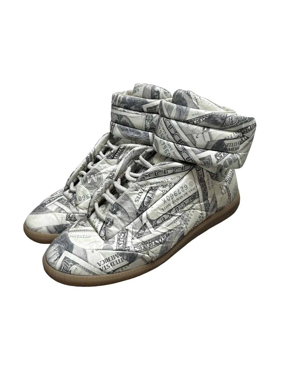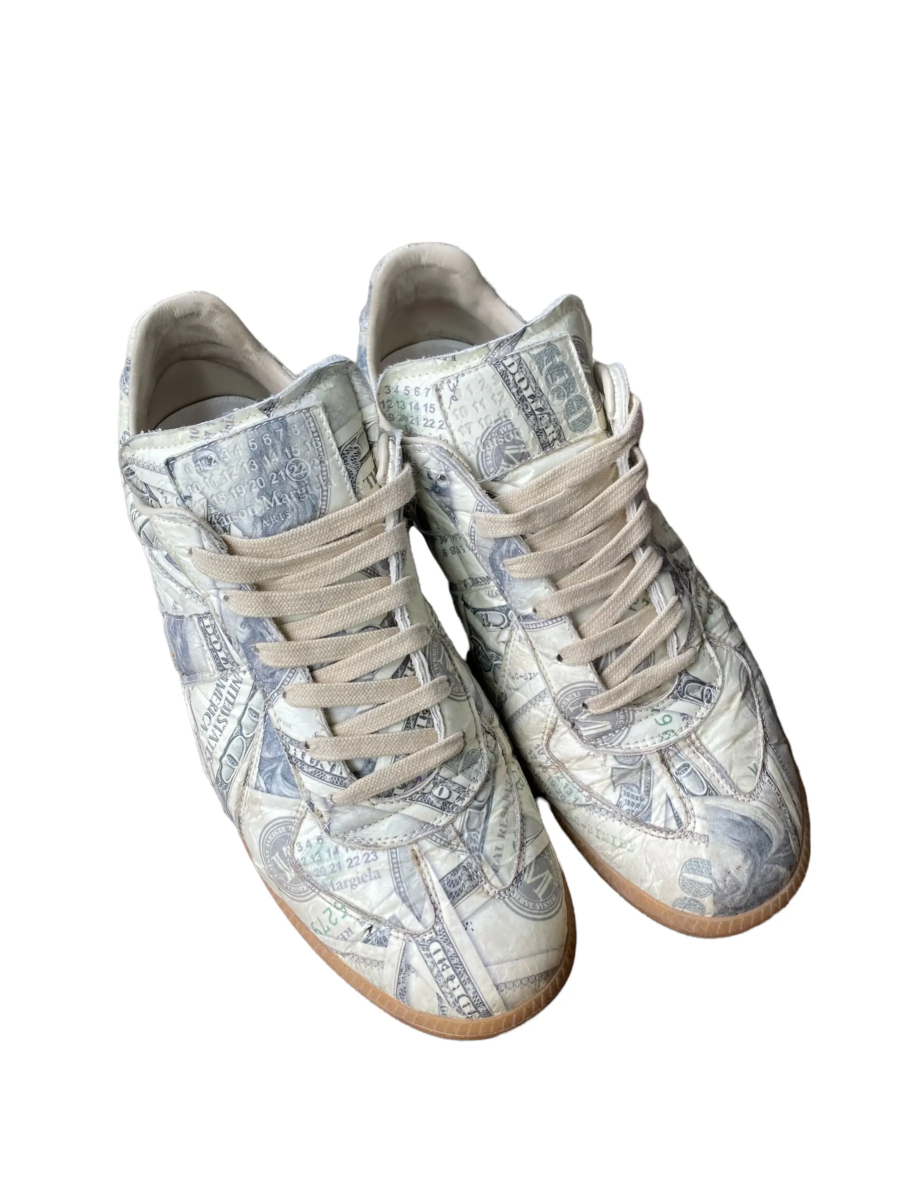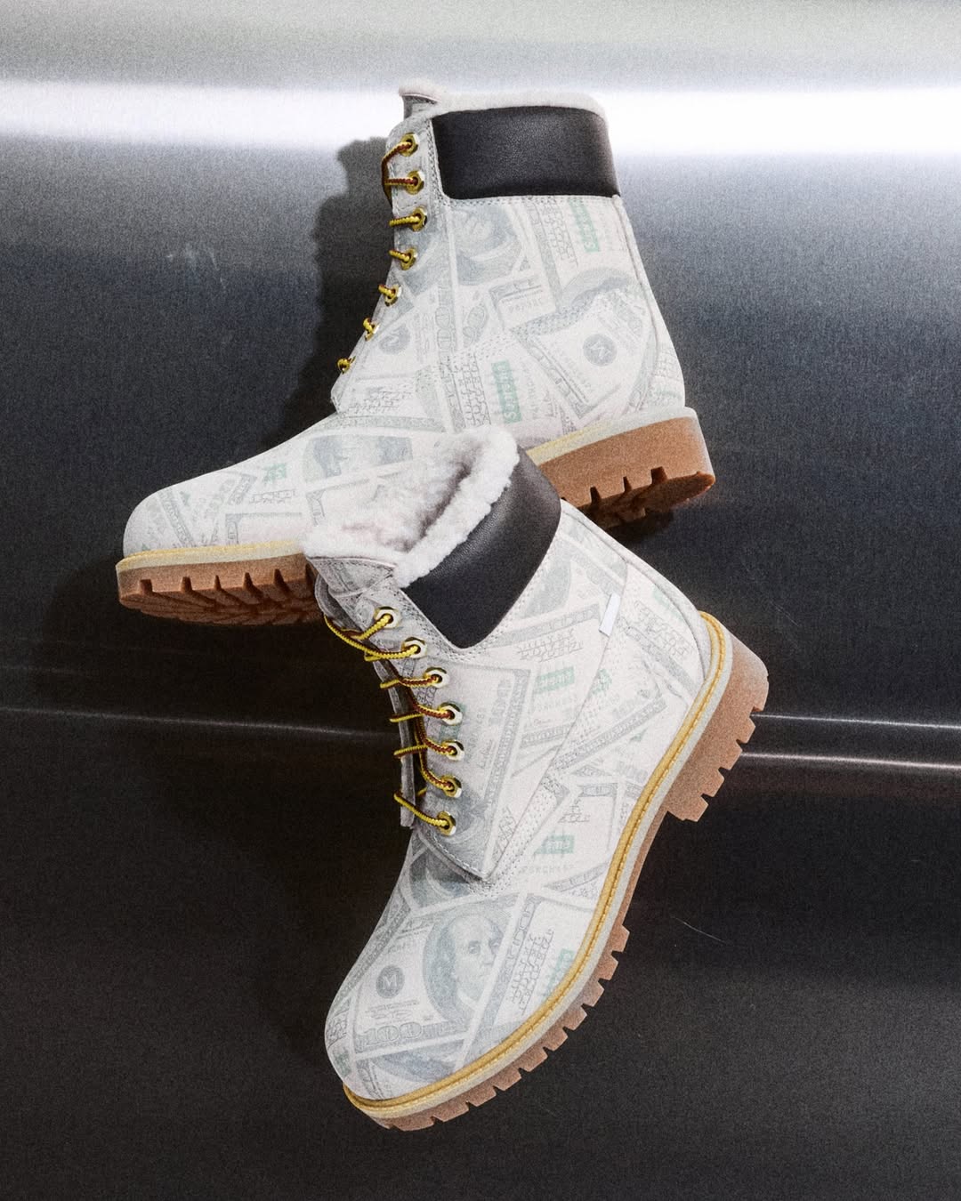 这一美学脉络在后面的 Future High Top 和 Replica 系列鞋款中得到延续,均以美钞覆盖的设计呈现。有趣的是,回顾 2024 年双方首度合作时引发热议的「收据钱包」,会发现其实本质上也是差不多的逻辑。