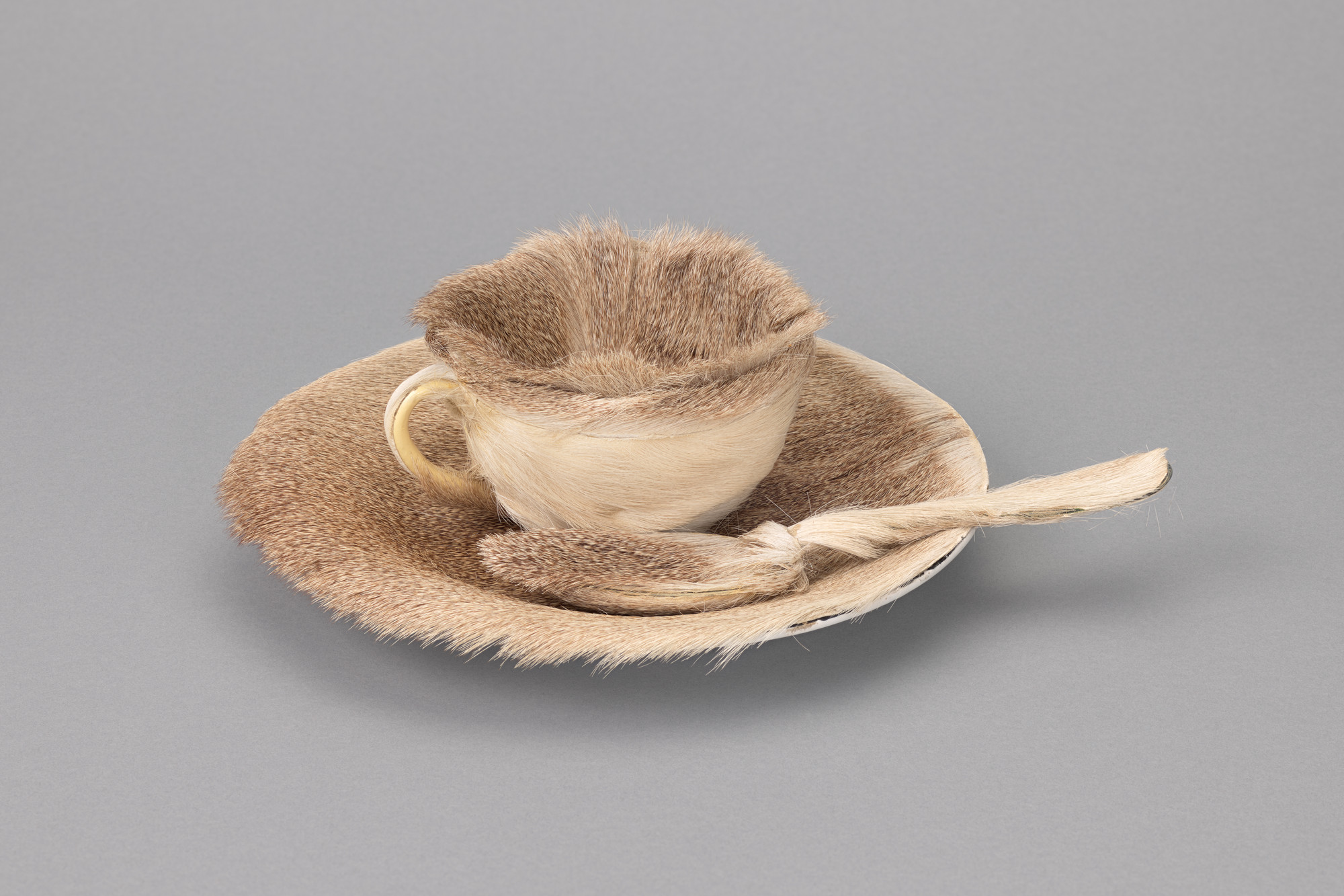 回看这套 Everlast 拳击手套和沙袋毛茸茸的表面,和 Meret Oppenheim 1936 年的作品《Object》也有一定相似度。这种在原本物件上,几乎不可能出现的材质所带来的感觉就像:触感独特,视觉上也极具吸引力,但如果作为物件本身进行使用,反而会感到某种不适。