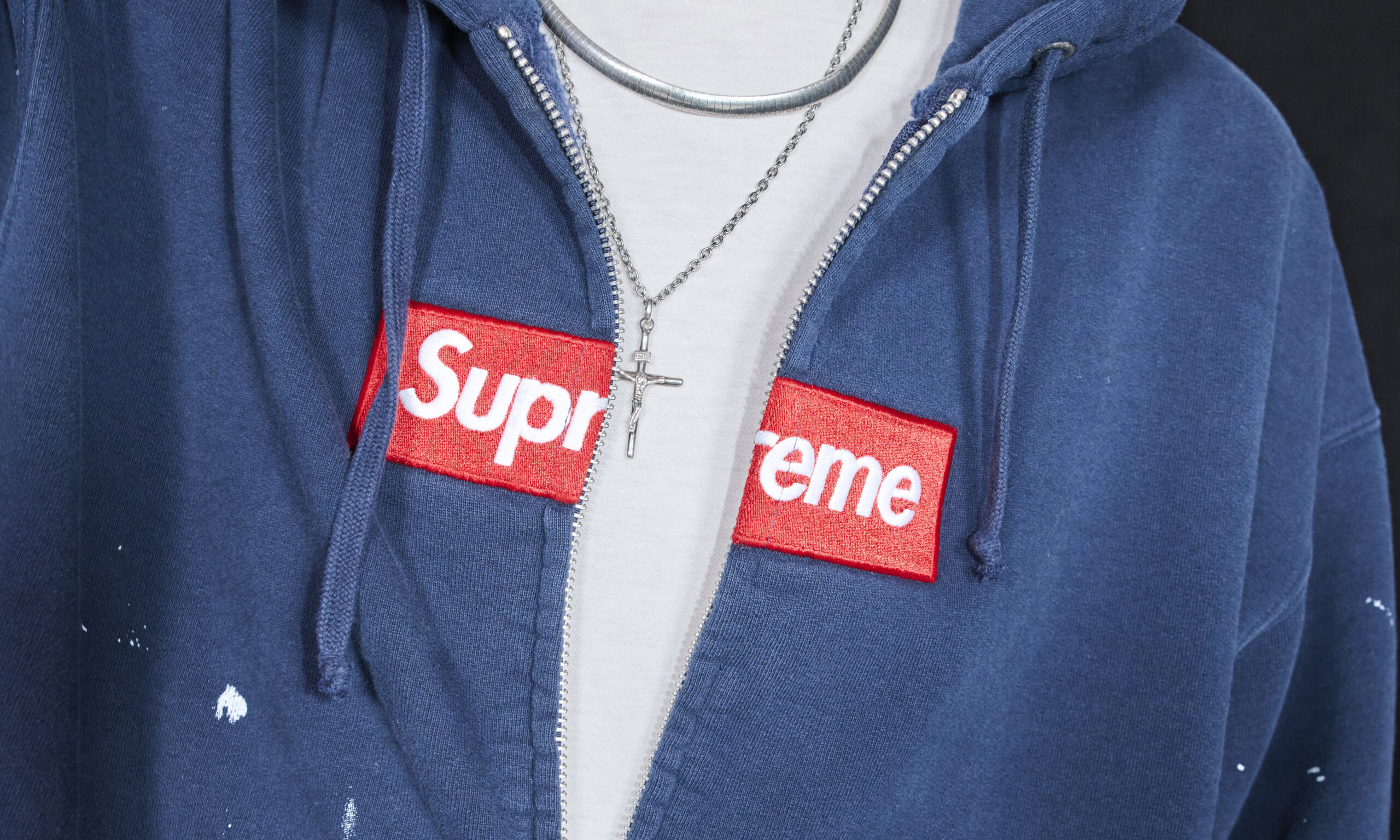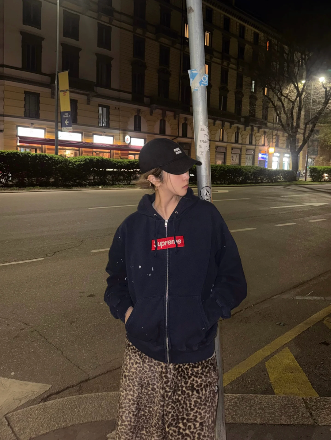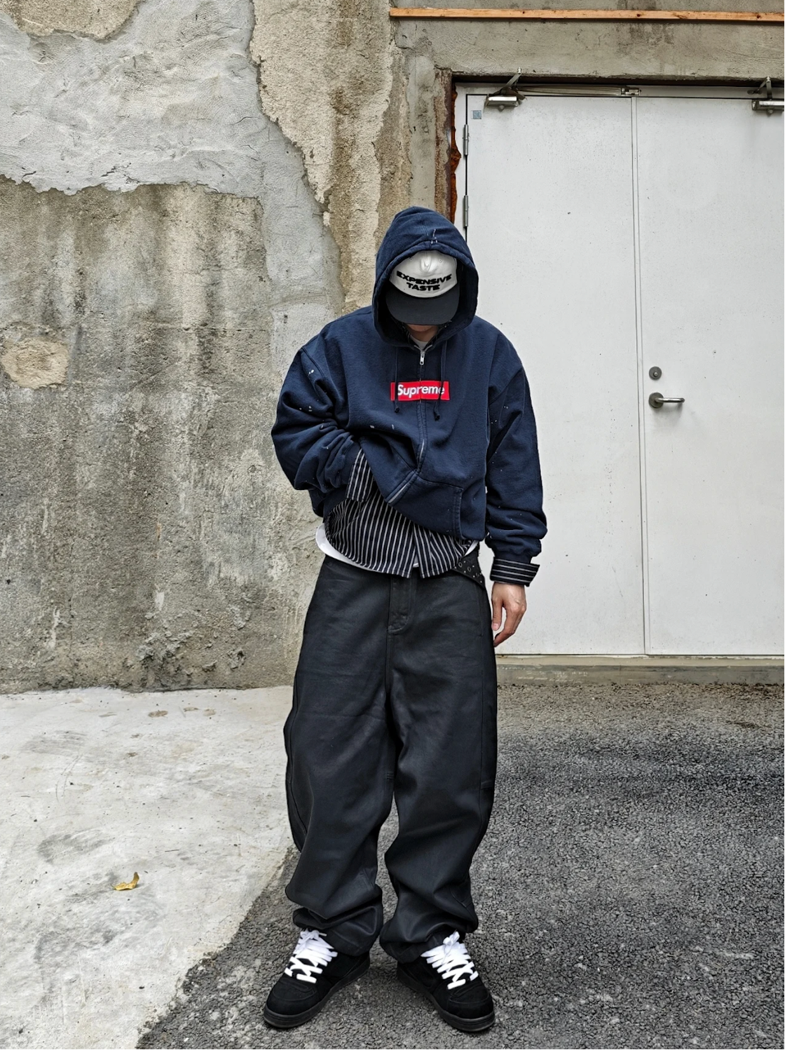 首先说的也是社交平台穿搭展示率最高的 Box Logo 帽衫,油漆喷溅效果源于 Martin Margiela 对白色油漆的痴迷。但更吸引人的也许是 Supreme 多年未动过刀的 Box Logo,这次合作中品牌标志被帽衫拉链一分为二。