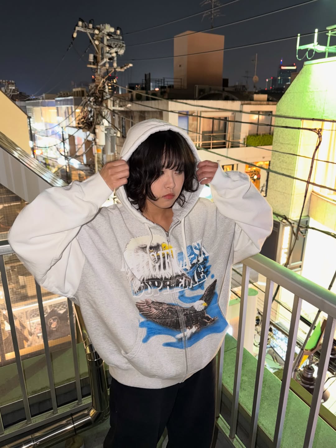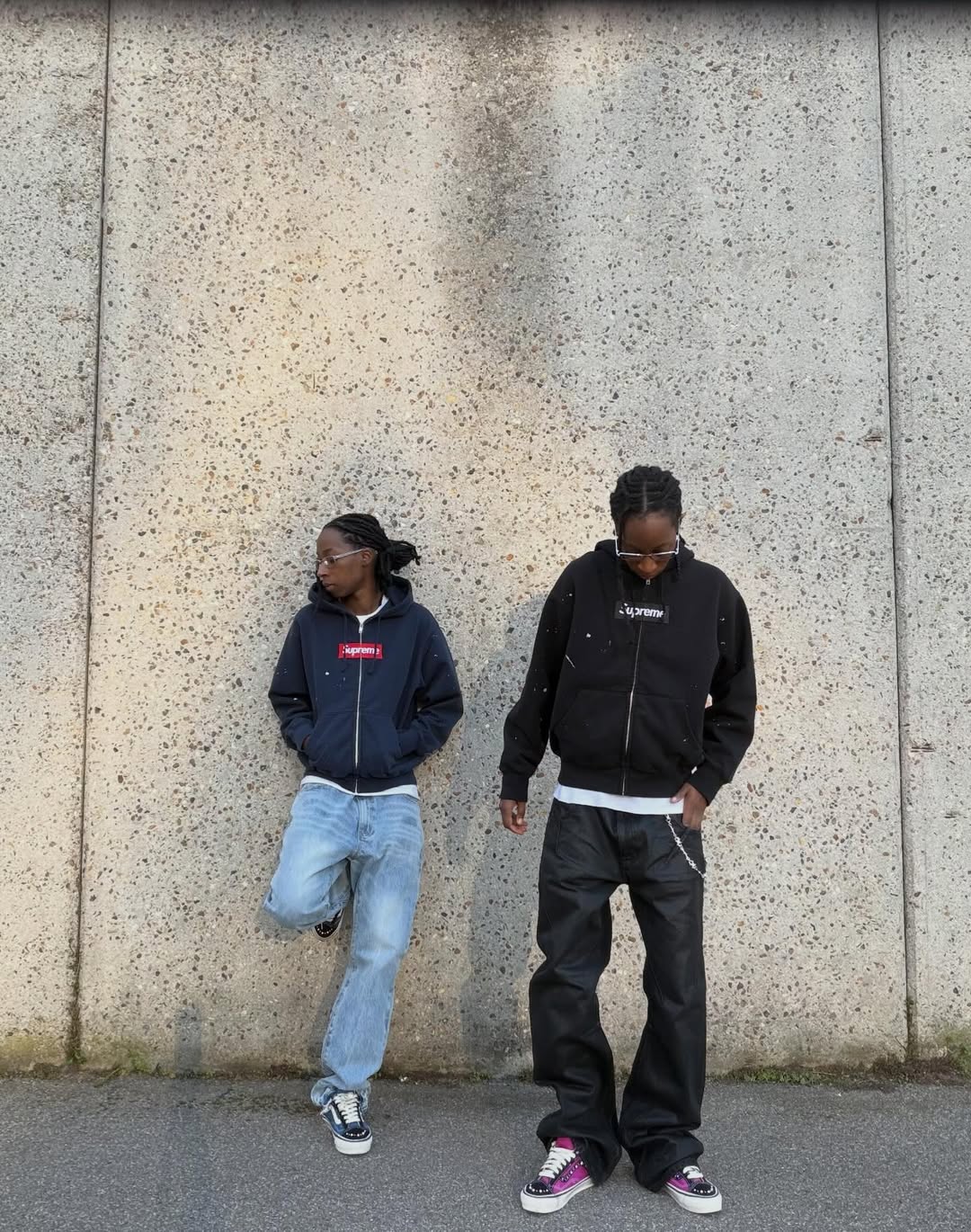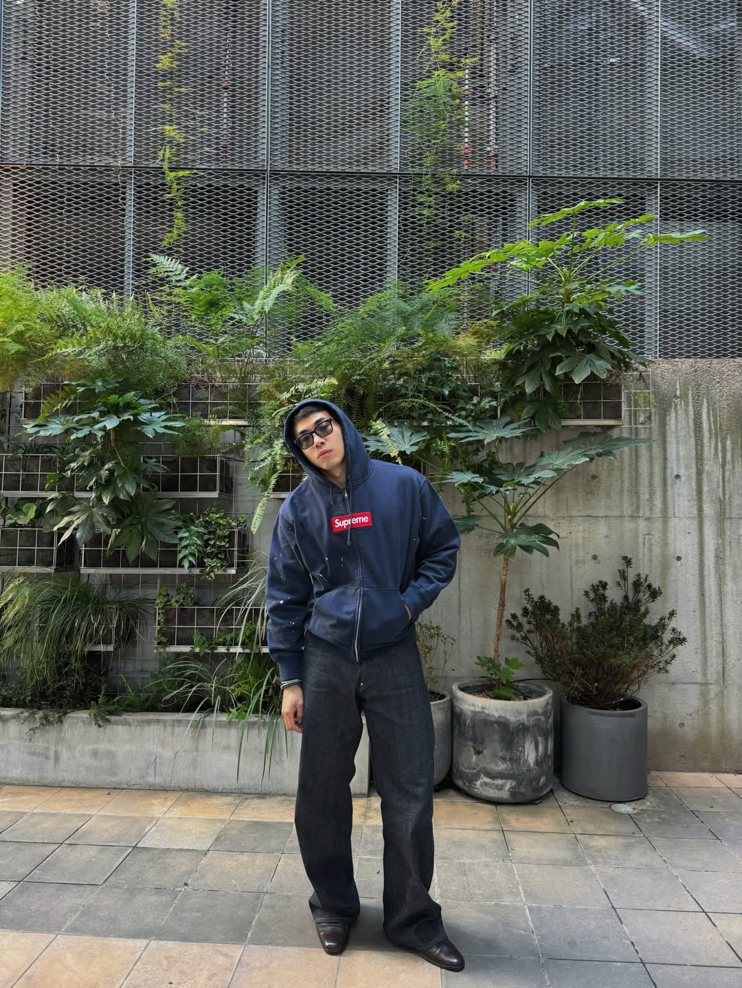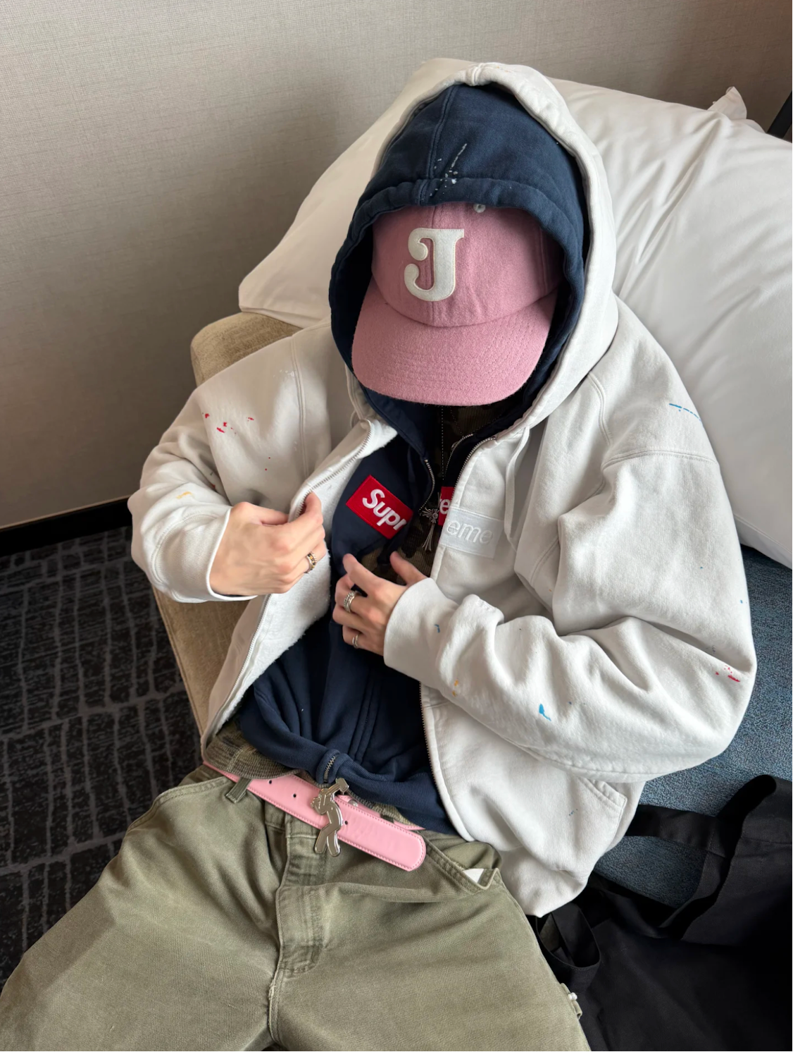 首先说的也是社交平台穿搭展示率最高的 Box Logo 帽衫,油漆喷溅效果源于 Martin Margiela 对白色油漆的痴迷。但更吸引人的也许是 Supreme 多年未动过刀的 Box Logo,这次合作中品牌标志被帽衫拉链一分为二。