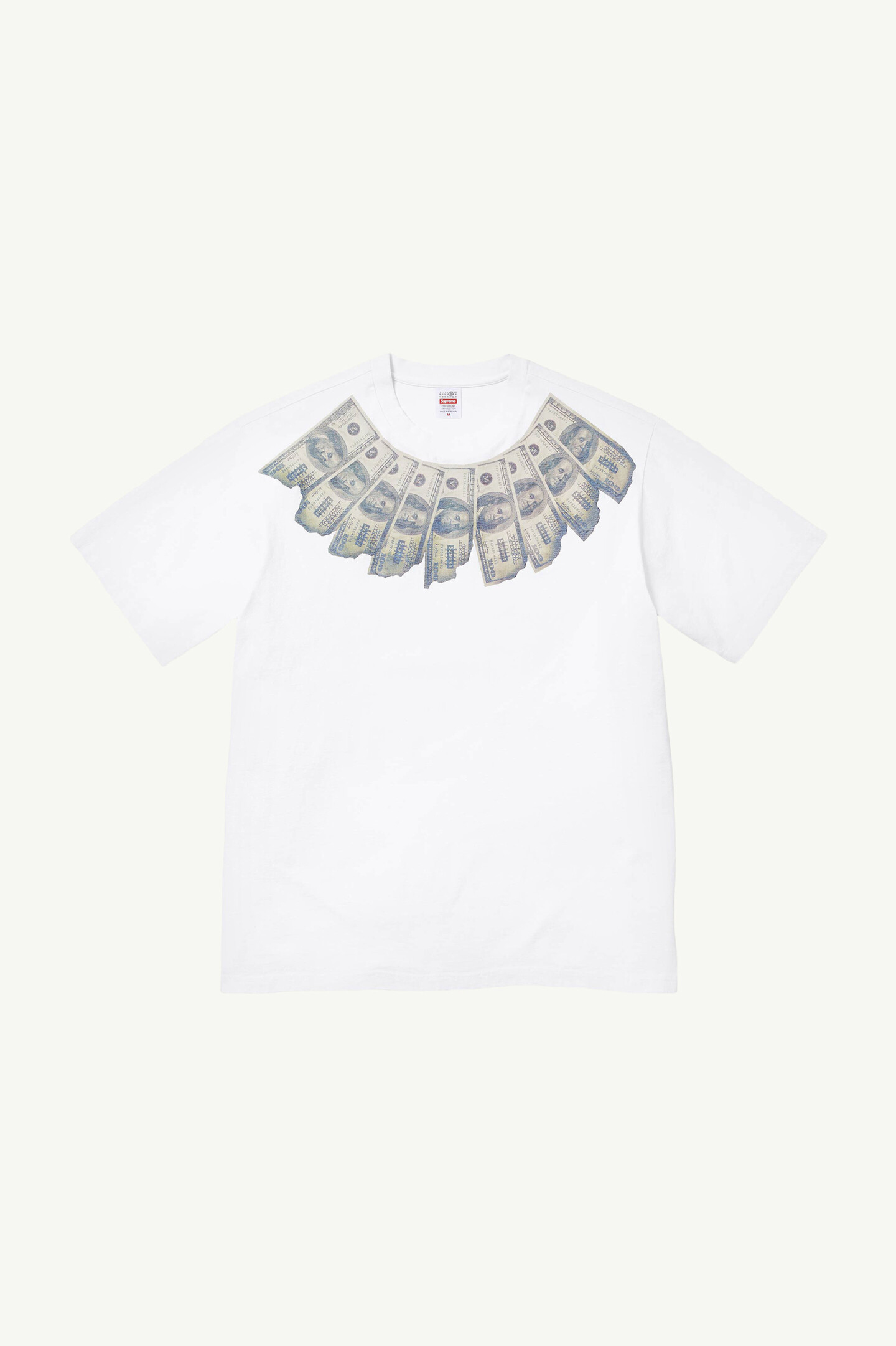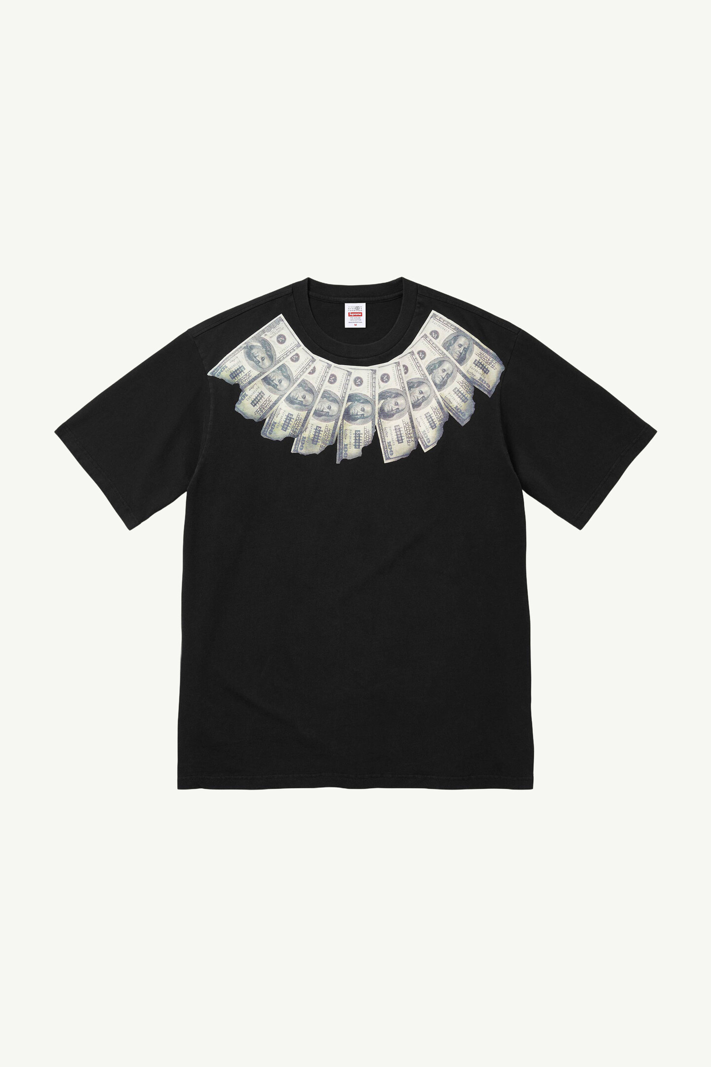 与此同时,这款 T 恤与同步发售的连帽皮草飞行员夹克和 Timberland 三方联名鞋款形成设计呼应,也再次体现了 Supreme 的档案调动能力。其设计谱系最早可追溯至 2008 年推出的 11 Dollar Bill Wallet,曾作为时装界中将日常之物「异化」的范本。