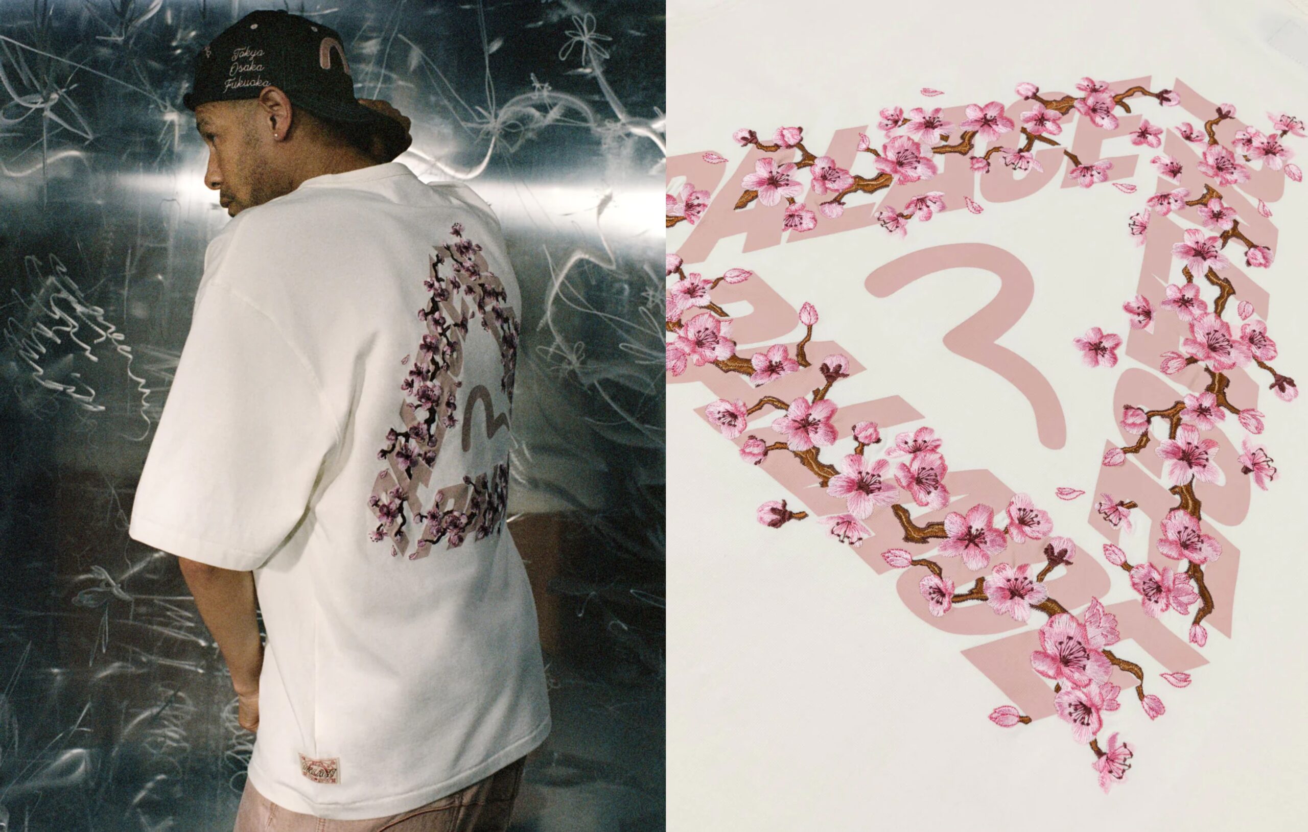 此次合作恰逢是日本的樱花季,双方将这种极具东方色彩的自然景观直接转化为产品语言。 EVISU 设计团队说到「日本正在经历樱花季,于是我们的产品上也开出了樱花。粉红色真的很特别,但也很难。」