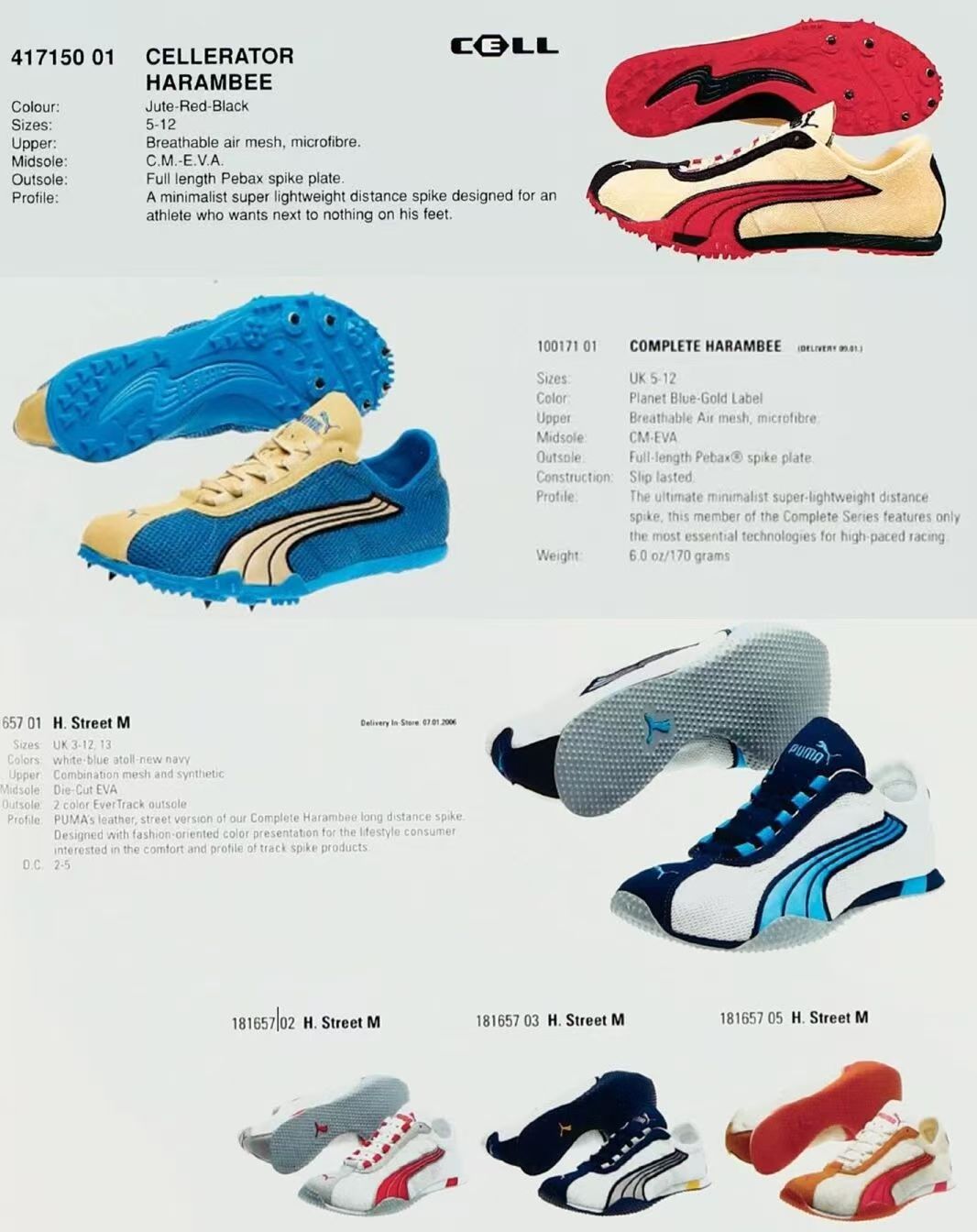 H-Street 系列的设计灵感,来自于 90 年代末的竞速钉鞋 PUMA Harambee,它保留了后者的轻量化性能和修长轮廓,并且通过 EVA 大底、透气网眼等细节,将原本属于田径场上的专业跑鞋,改造成适合日常出街的休闲鞋款,这种将「赛道速度感」与「日常松弛感」融合的独特设计,正是它能精准拿捏千禧复古审美,让无数人上脚的真正原因。