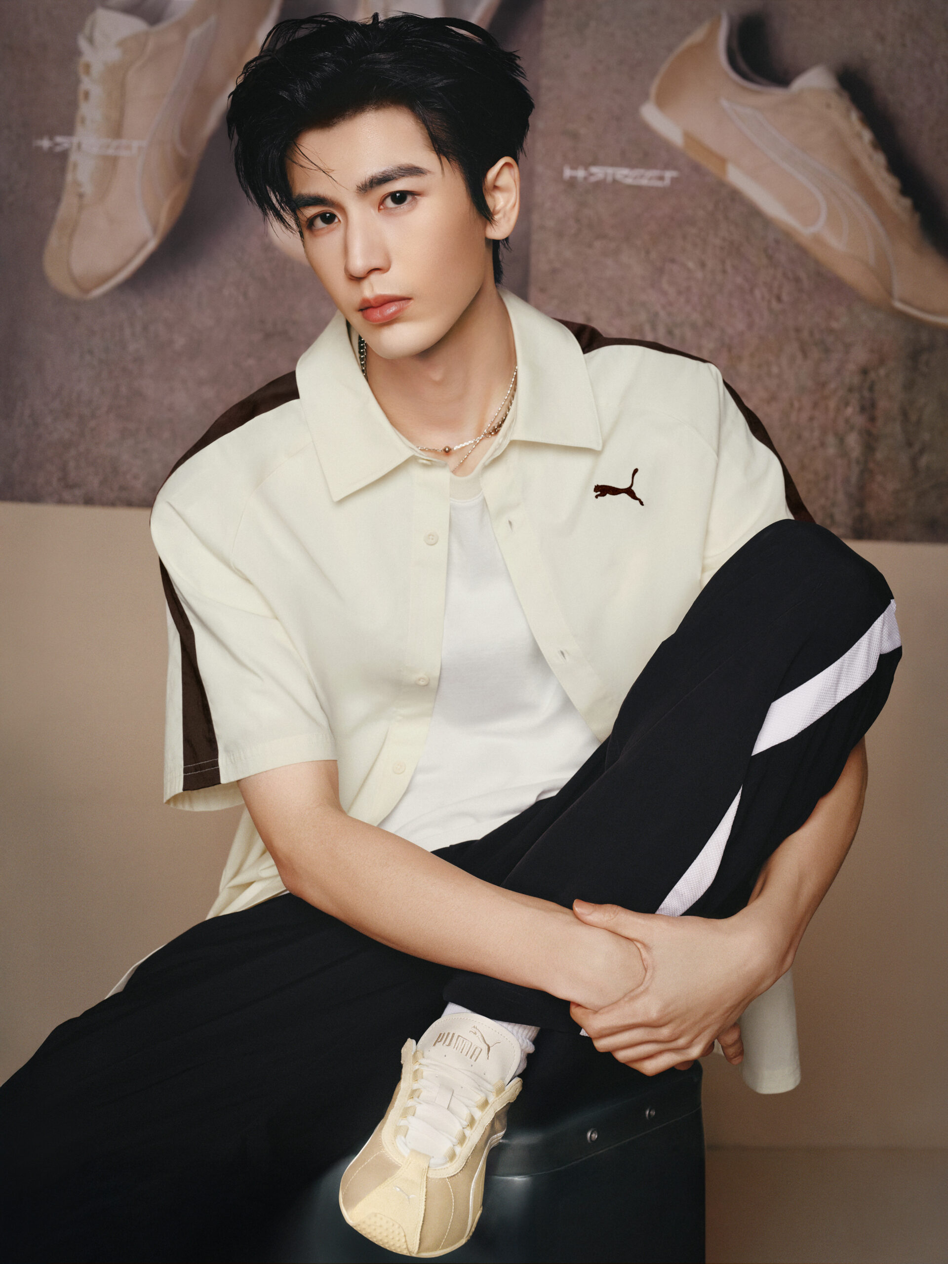 张凌赫就以简约又有细节的逻辑带来 H-Street 造型。PUMA T7 系列的浅色衬衫和白色 T 恤搭配黑色长裤,通过经典的轮廓和干净的配色,凸显高智运动风的魅力。