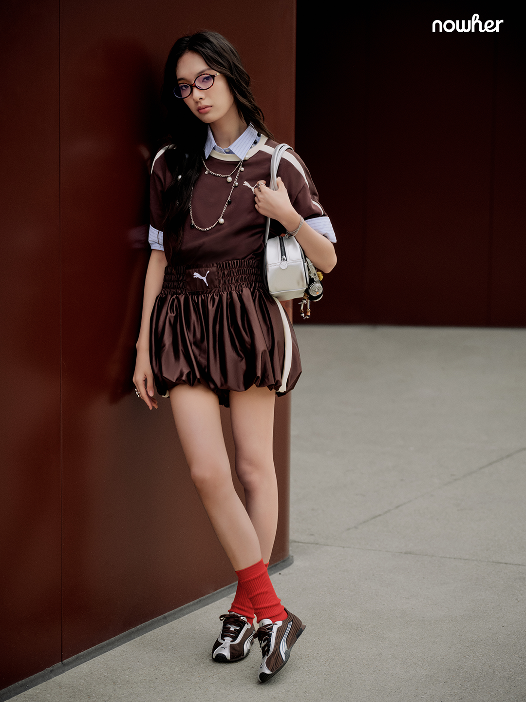 棕色 T7 运动短袖内搭衬衫,下配短裤,整体勾勒出利落又知性的女性轮廓。而脚下的 PUMA H-Street,则成为点睛之笔,其纤薄修长的鞋身与干净利落的线条,不仅在视觉上延伸了腿部比例,鞋身配色更与服饰形成了巧妙的呼应。