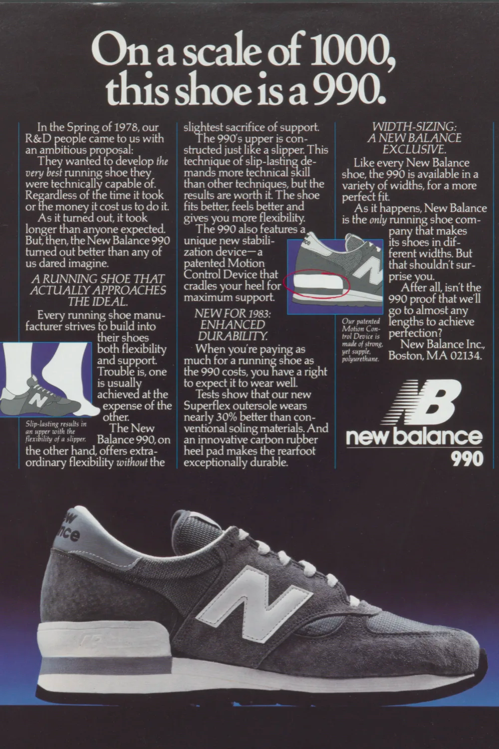1982 年,品牌推出首双 990,并打出那句经典的广告语——「On a scale of 1000, this shoe is a 990.」在当时跑鞋仍以性能为核心竞争力的年代,一双售价 100 美元的跑鞋几乎不可思议,但也由此确立了 New Balance 在高端跑鞋领域的标杆地位。