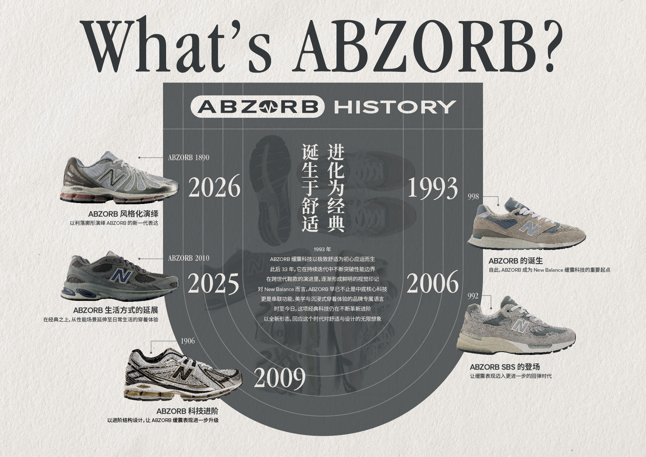 所以当 ABZORB 2010 和 ABZORB 1890 登场时,是不是就更容易理解了?它们是站在 998、2002、990 等一众经典作品肩膀上的当代延伸,也回应着当下消费者对复古轮廓与日常穿着舒适感的双重需求。