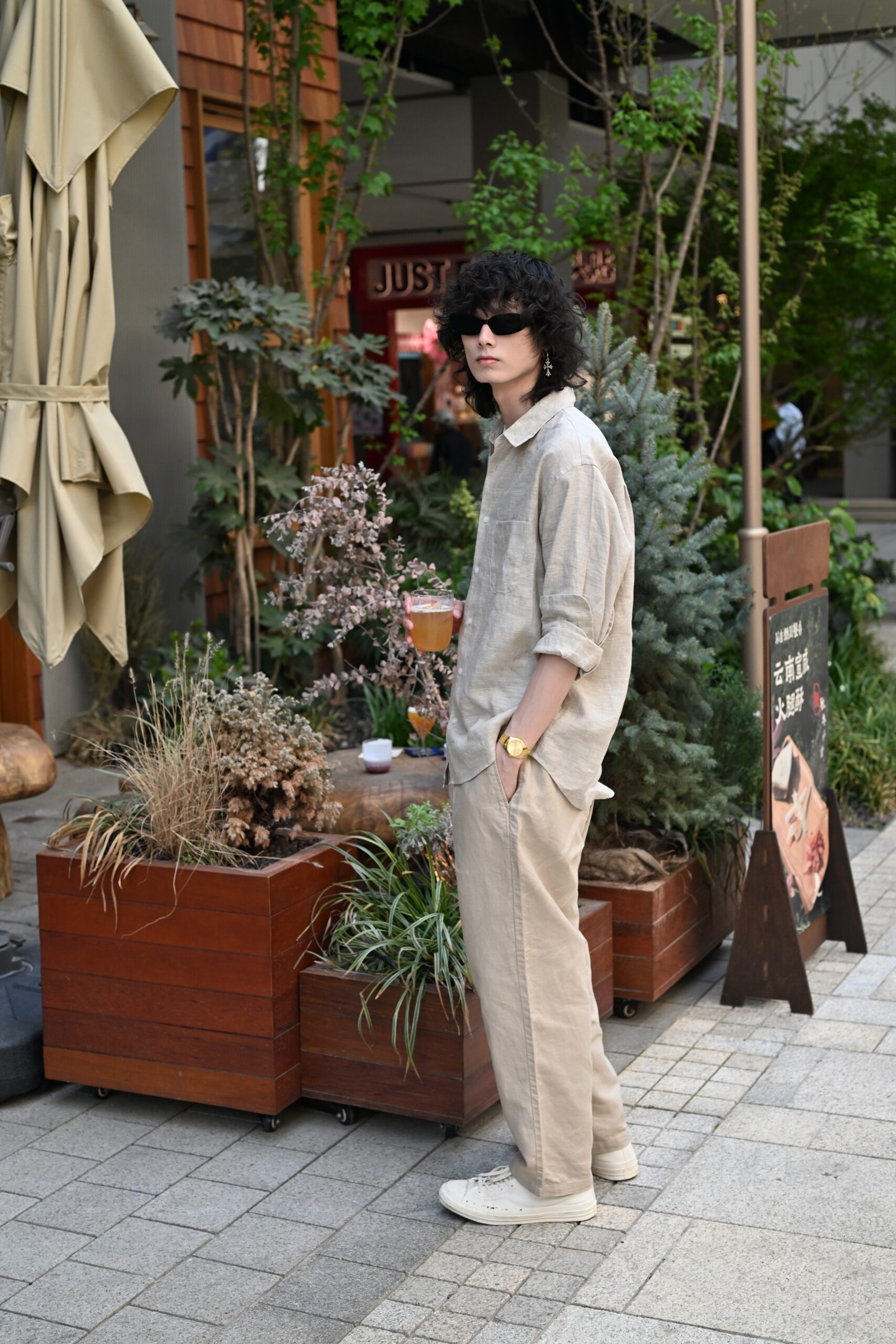 原色汉麻水洗衬衫经典简约,淡黄色汉麻水洗锥形裤呈自然的宽松垂感,两件单品融合为同色系穿搭,干净随性的极简穿搭营造毫不费力的时髦感。
