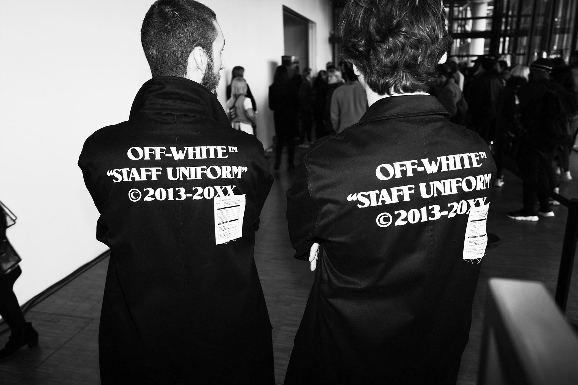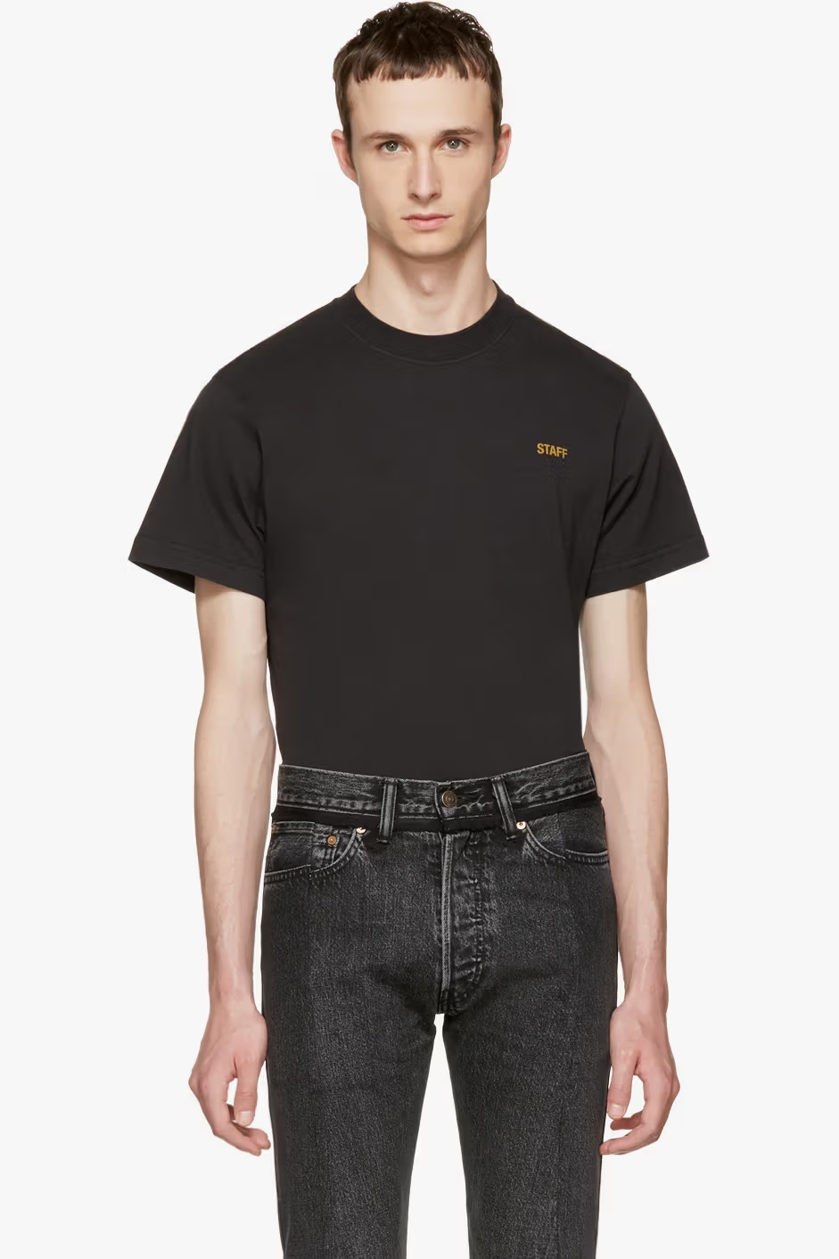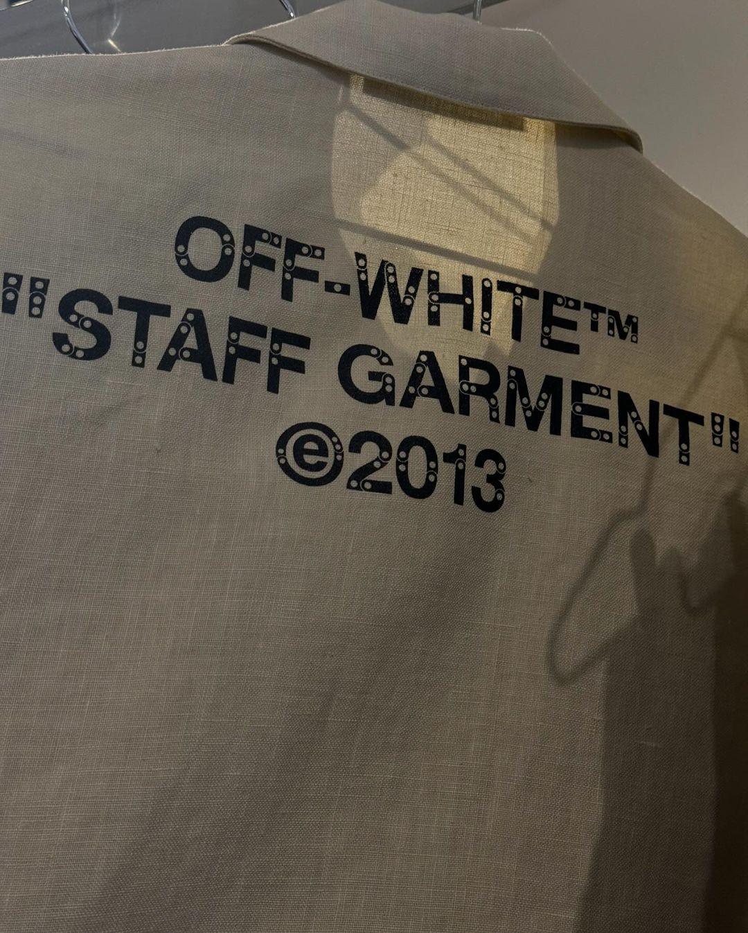 与川久保玲一起在巴黎站稳脚跟的山本耀司,其品牌 YOHJI YAMAMOTO 也曾发售 Staff Coat,背后同样带有品牌和系列信息;到了近十年的潮流圈,Staff Coat 成为一种趋势。Virgil Abloh 曾在时装周和迈阿密 Art Basel 推出 OFF-WHITE™ Staff Uniform 和 Staff Garment,以长风衣、卫衣和衬衫的形式呈现。还记得那件售价 160 美元的 VETEMENTS「Staff」Tee 吗?这件以日常元素为灵感,专为品牌忠实拥趸打造的时尚单品,过于直白的 Logo 在互联网掀起一场病毒式传播。
