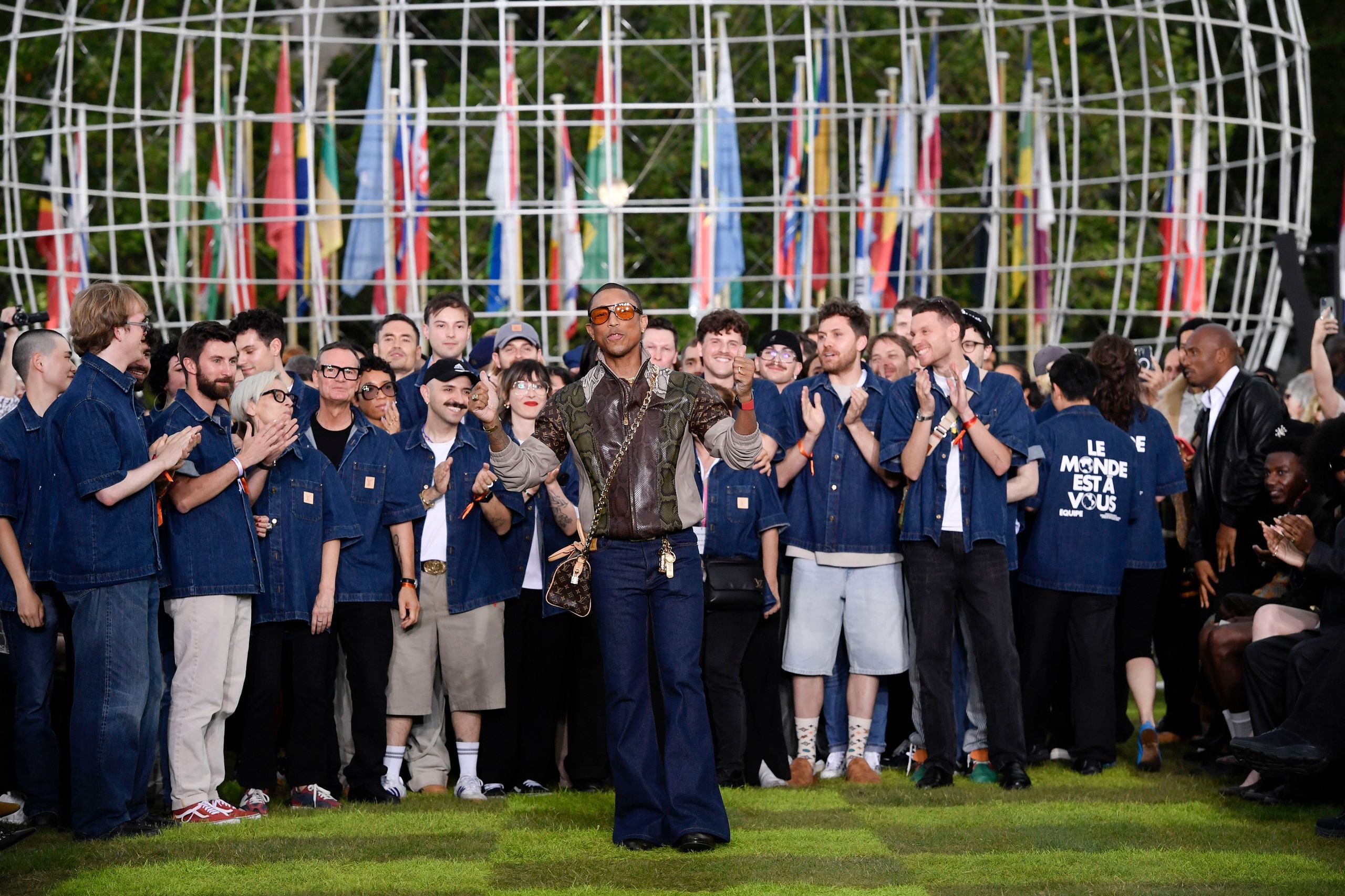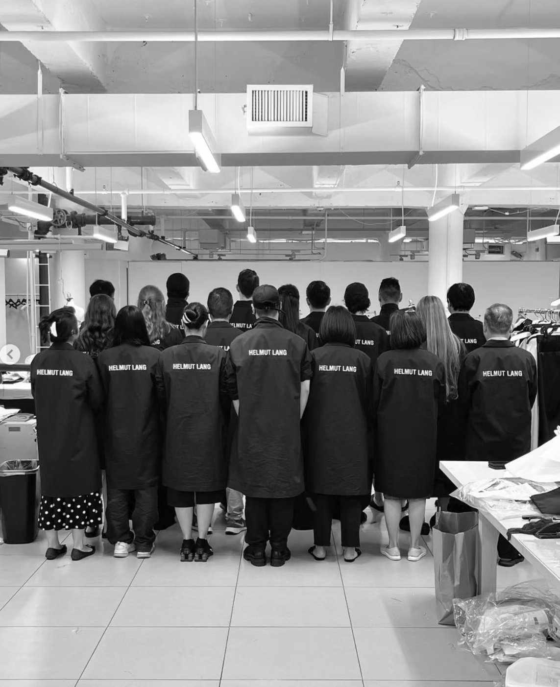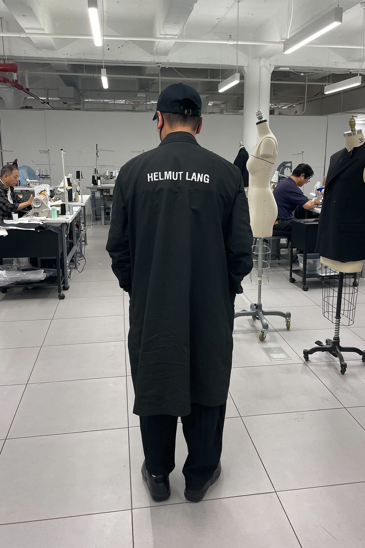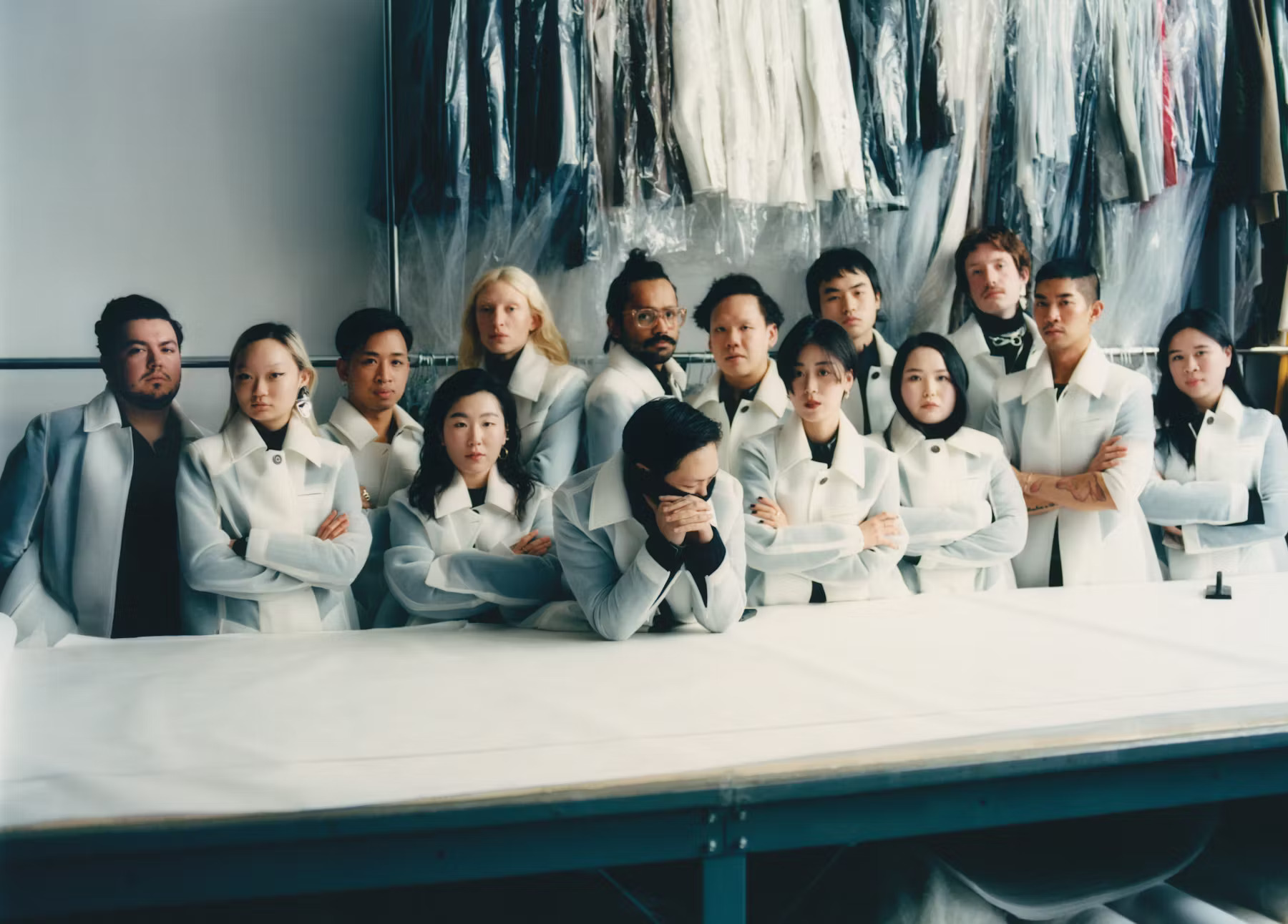 在近几年的时尚圈,设计师/创意总监似乎还将员工制服视作流动的品牌名片。除了 Peter Do 自己同名品牌的透明 Staff Coat 外,这位设计师入主 Helmut Lang 后,品牌发布团队全员穿着印有「HELMUT LANG」Logo 的 Staff Coat 图片;Alaïa 创意总监 Pieter Mulier 与团队穿着印有品牌名称和日期的 Staff Coat 一起工作;以及去年 LOUIS VUITTON 2025 春夏系列,Pharrell Williams 打造一系列 Staff 牛仔衬衫,背面印有「Le Monde Est À Vous」(世界是你们)诉说 LVERS 爱与和平、团结与尊重的概念。
