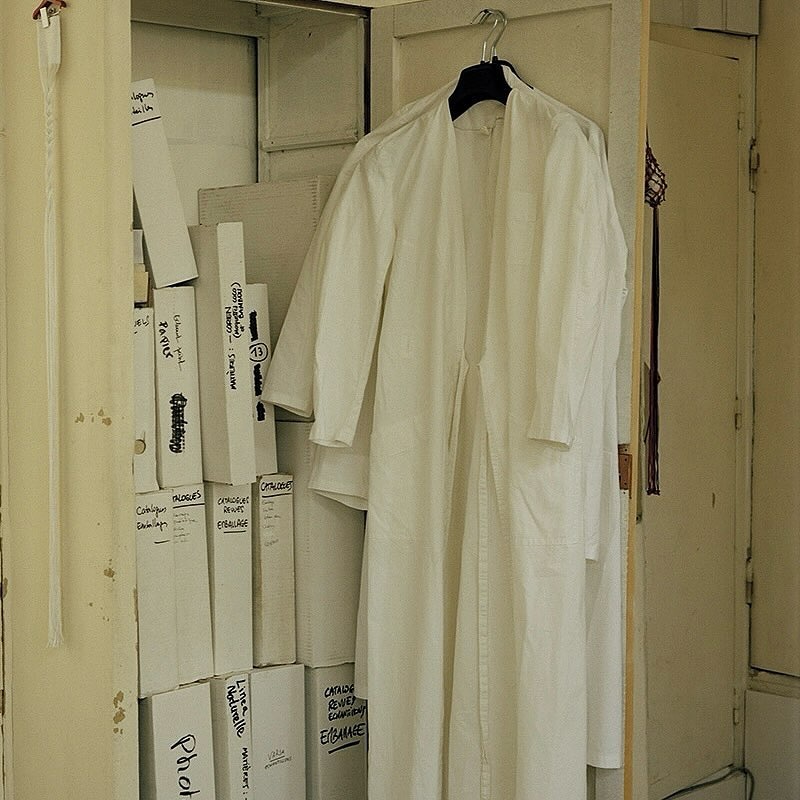 有意思的是,比 COMME des GARÇONS 晚几年活跃在巴黎时尚圈的 Maison Martin Margiela,其 Staff Coat 对粉丝、时尚爱好者而言,也如同信仰一般充满神圣感。不同的是,神秘的 Martin Margiela 采用标志性的纯粹白色打造 Staff Coat,对品牌员工推行「实名制」使用,即员工离职后需要归还员工制服,因此这款 Staff Coat 在市面上并不流通。