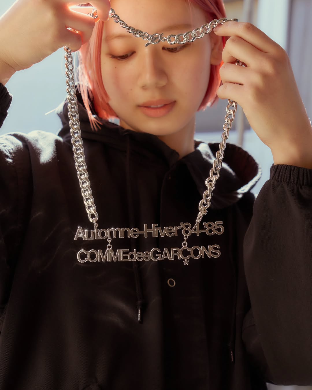 前段时间,CDG 发布全新系列,其中就包括印有粉色和白色的「Automne-Hiver 84-85」字样的夹克、派克大衣、T 恤、项链等单品。由此可见,COMME des GARÇONS「员工制服」已不仅限于长外套,而是拓展至不同的单品矩阵。就算聚焦于 Staff Coat,CDG 也会采用不同材质拼接在一起;而 Staff Jacket 则有教练夹克、绗缝夹克等多个版本…