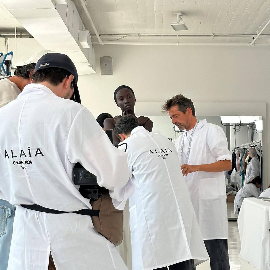 在近几年的时尚圈,设计师/创意总监似乎还将员工制服视作流动的品牌名片。除了 Peter Do 自己同名品牌的透明 Staff Coat 外,这位设计师入主 Helmut Lang 后,品牌发布团队全员穿着印有「HELMUT LANG」Logo 的 Staff Coat 图片;Alaïa 创意总监 Pieter Mulier 与团队穿着印有品牌名称和日期的 Staff Coat 一起工作;以及去年 LOUIS VUITTON 2025 春夏系列,Pharrell Williams 打造一系列 Staff 牛仔衬衫,背面印有「Le Monde Est À Vous」(世界是你们)诉说 LVERS 爱与和平、团结与尊重的概念。