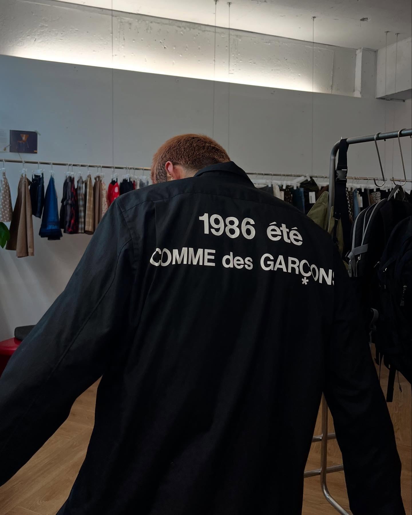 最初,COMME des GARÇONS Staff Coat 仅仅是品牌团队的专属,简单的长外套设计背后印有品牌 Logo 和季度信息:Automne-Hiver(秋冬系列)83-84/84-85/85-86、Printemps-Été 1986/1987(1986/1987 春夏系列)。整体设计可以说是「言简意赅」,也正是如此,这些「OG 级别」的 Staff Coat 在二手网站上售价极高,接近 2 万的价格甚至比主线单品还要贵。