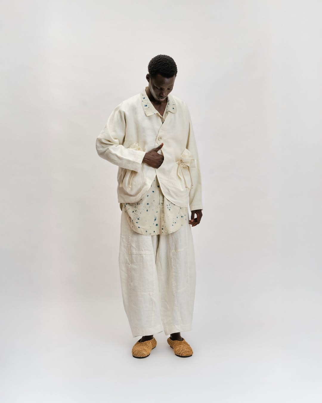 GATHERING 在廓形设定往往以部落或牧场的传统功能性服饰为发想,从受英式审美影响的印度农场夹克到非洲吉拉巴长袍均有涉猎,地理上的跨度也让 Gathering Textiles 在矛盾与统一之间不停平衡,所以为了连贯性大部分单品以 Boxy fit 呈现。因为手工艺的局限性 Gathering Textiles 每一季的产能十分有限,单品也寥寥无几,但在纺织与染色工艺上的深度挖掘却总能带来惊喜。