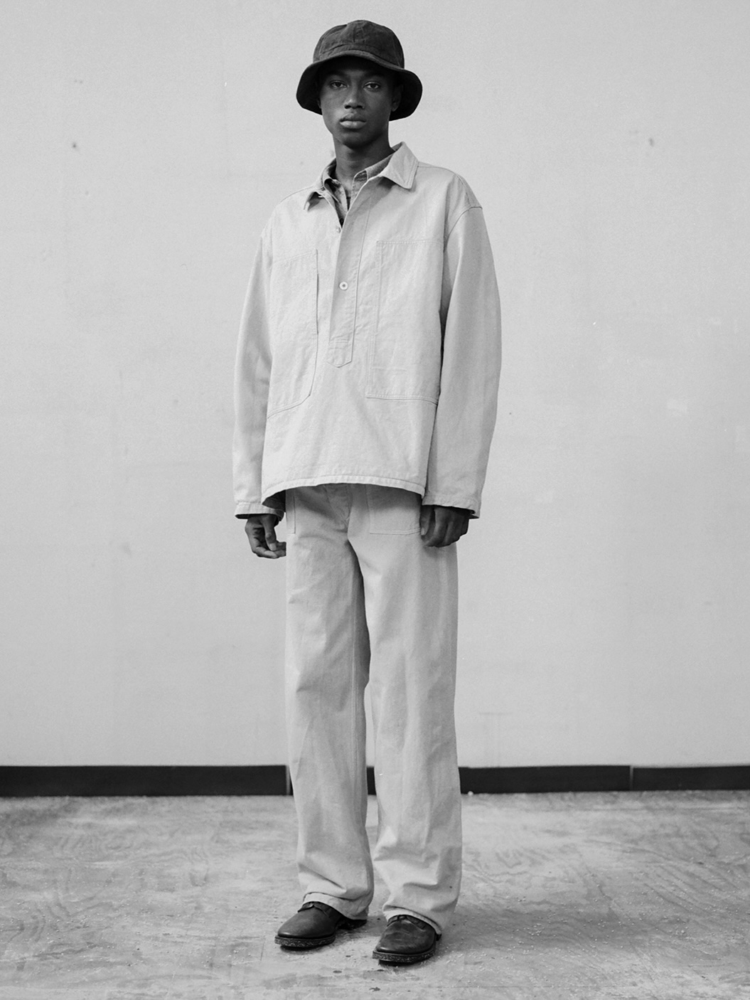 女装设计科班出身的 Taiga Takahashi 坦言自己更像是服饰领域的考古工作者,对于百年前欧美尤其是北美的功能性服饰十分着迷,经过了几年的实验性尝试在 2021 正式推出 T.T。T.T 对于世界大战期间北美功能性服饰的复刻不同于 Warehouse 等忠于元年细节的品牌,在保留整体风貌与五金细节以及面料肌理的同时辅以日本传统纺织与染色工艺,同时注入些许正装剪裁考量,让美国百年前社会文化风貌以全新的形式呈现。