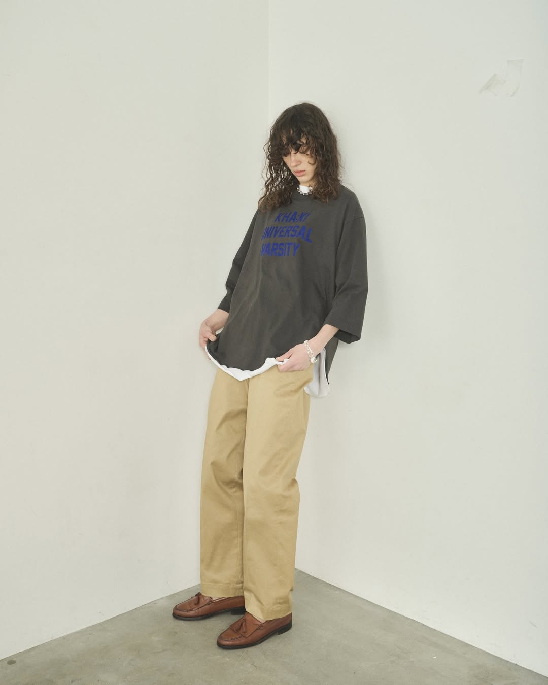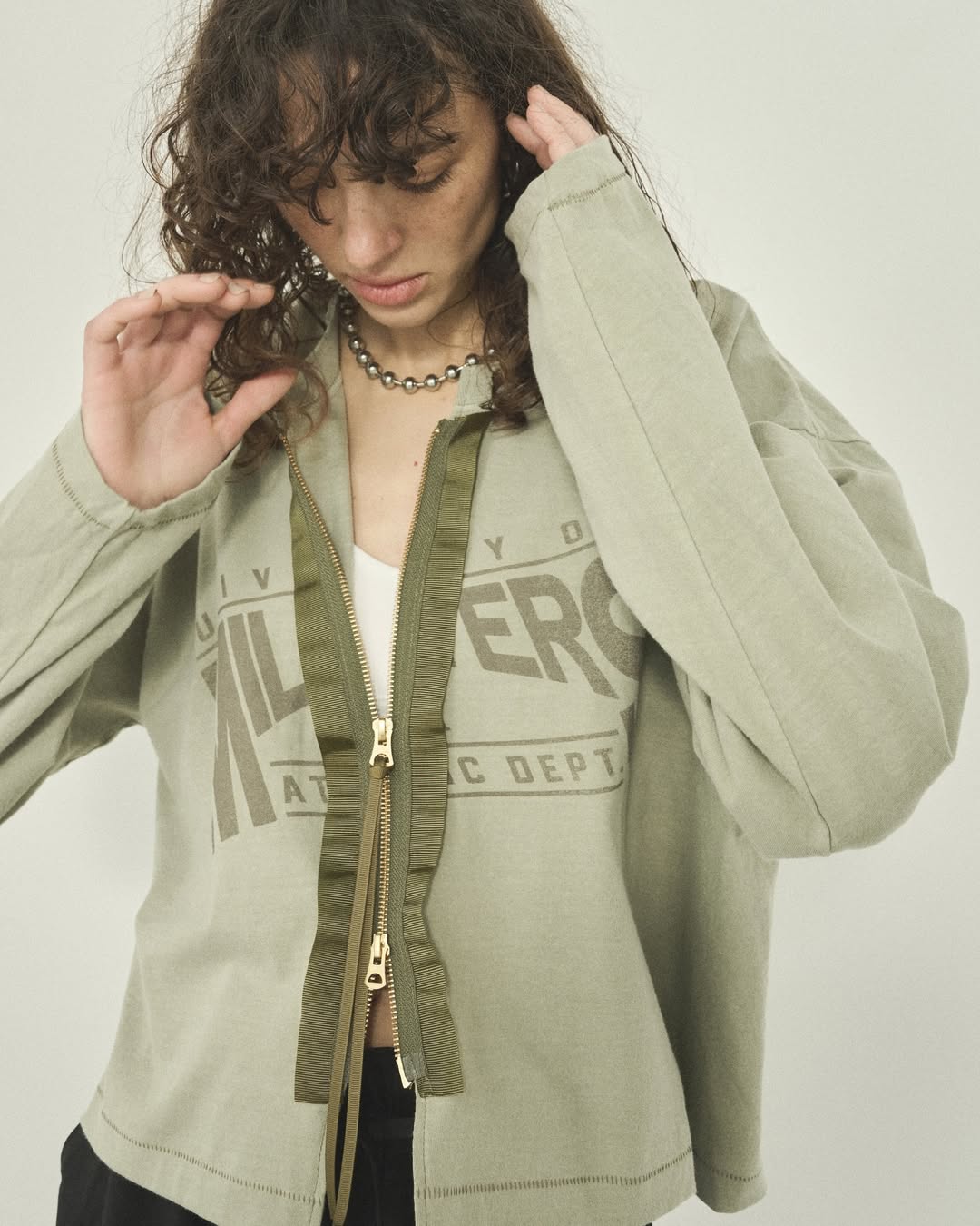 作为当下为数不多深耕女装领域的复古品牌,KHA:KI 在军工装之外也有相对日常的基础款单品呈现,但在基础的轮廓下一系列工艺要求更高的复古工艺穿插其中,就比如双锁链的车线细节以及竹节纹质感的面料,均来自日本本土存留的古董机器打造,这种对于过往与现在的链接感让 KHA:KI 探索到更远的街头女装边界。