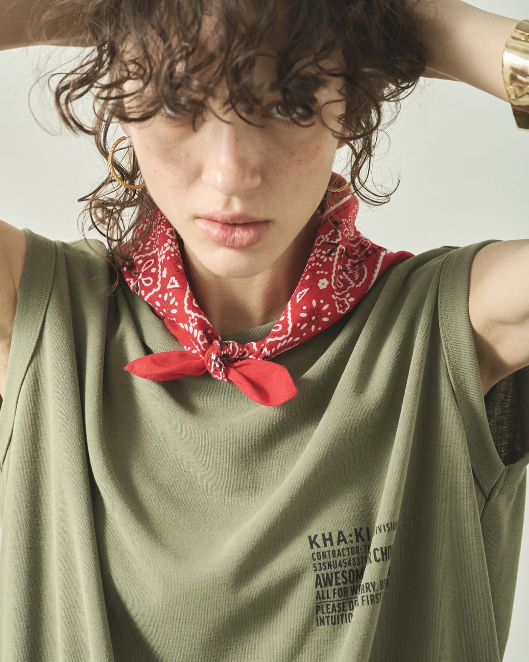 对于军工装的复刻与解构当然是 KHA:KI 的轴心,但在此之外将上世纪 80、90 年代的古着中具有穿透力的面料肌理纹路配合军装细节融合呈现成为 KHA:KI 令人眼前一亮的美学标签,加之流行审美趋势下的短宽廓形等剪裁带来一系列 remake 质感的穿搭万金油单品,从衬衫夹克到连体军裤再到斜纹布面料的法式长裙等等一应俱全,天马行空的想象力持续为街头女装注入灵感。