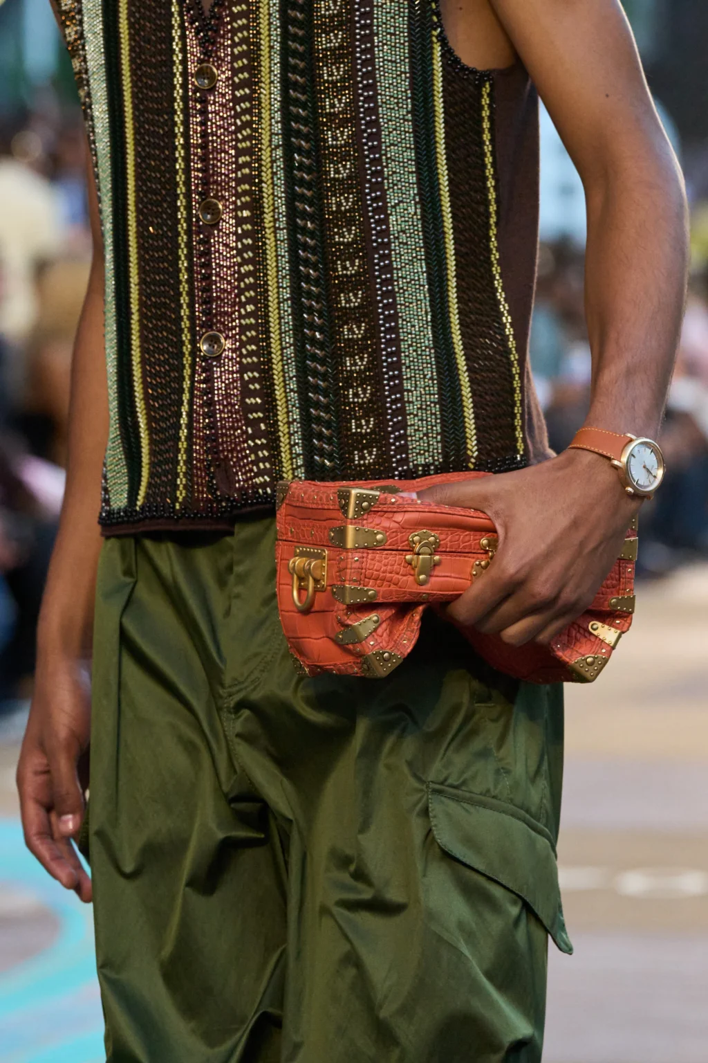 菲董操刀下的 LV,自然还是以其奢华与街头并存的审美为主基调;本季新作中多款工装裤通过经典裤型与真丝、丹宁、西裤面料等多种材质的「冲突感」混合,以及诸如明线立体装饰等精致细节设计,打造出优雅调性和自由感融合的风格面貌。