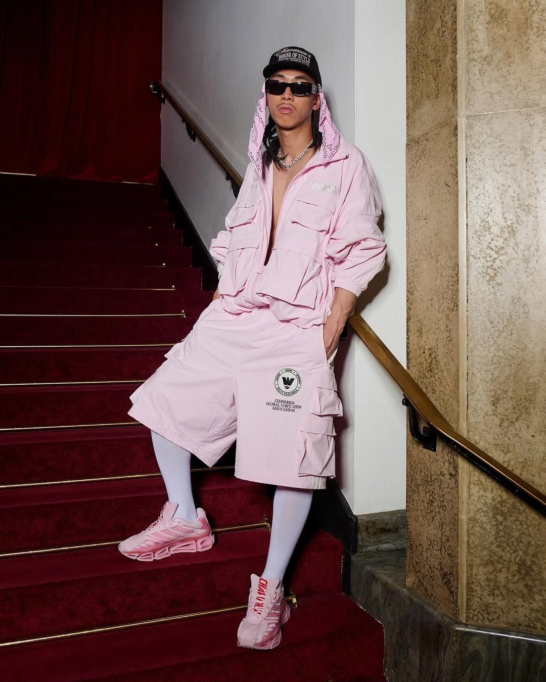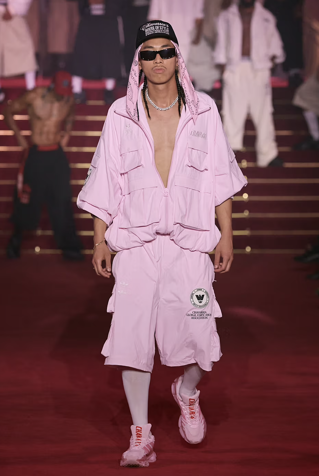 Willy Chavarria 以萨尔瓦多监狱制服为灵感,用鲜亮的纯色色调、立体感的层次结构和标志性的廓形剪裁,为工装裤的干练线条赋予更不羁的反叛气质,也勾勒出移民群体的身份困境。