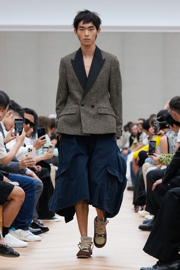 另一位对工装裤款式作出破格诠释的设计师品牌,便是韩国的先锋代表 Juun.J——品牌 2026 春夏系列中,创意总监 Jung Wook-jun 大胆地玩起了工装裤的「双生」概念——一条正经穿着,一条如披风般垂落;既挑战传统穿着逻辑,又巧妙映射了当代青年的多重身份焦虑。