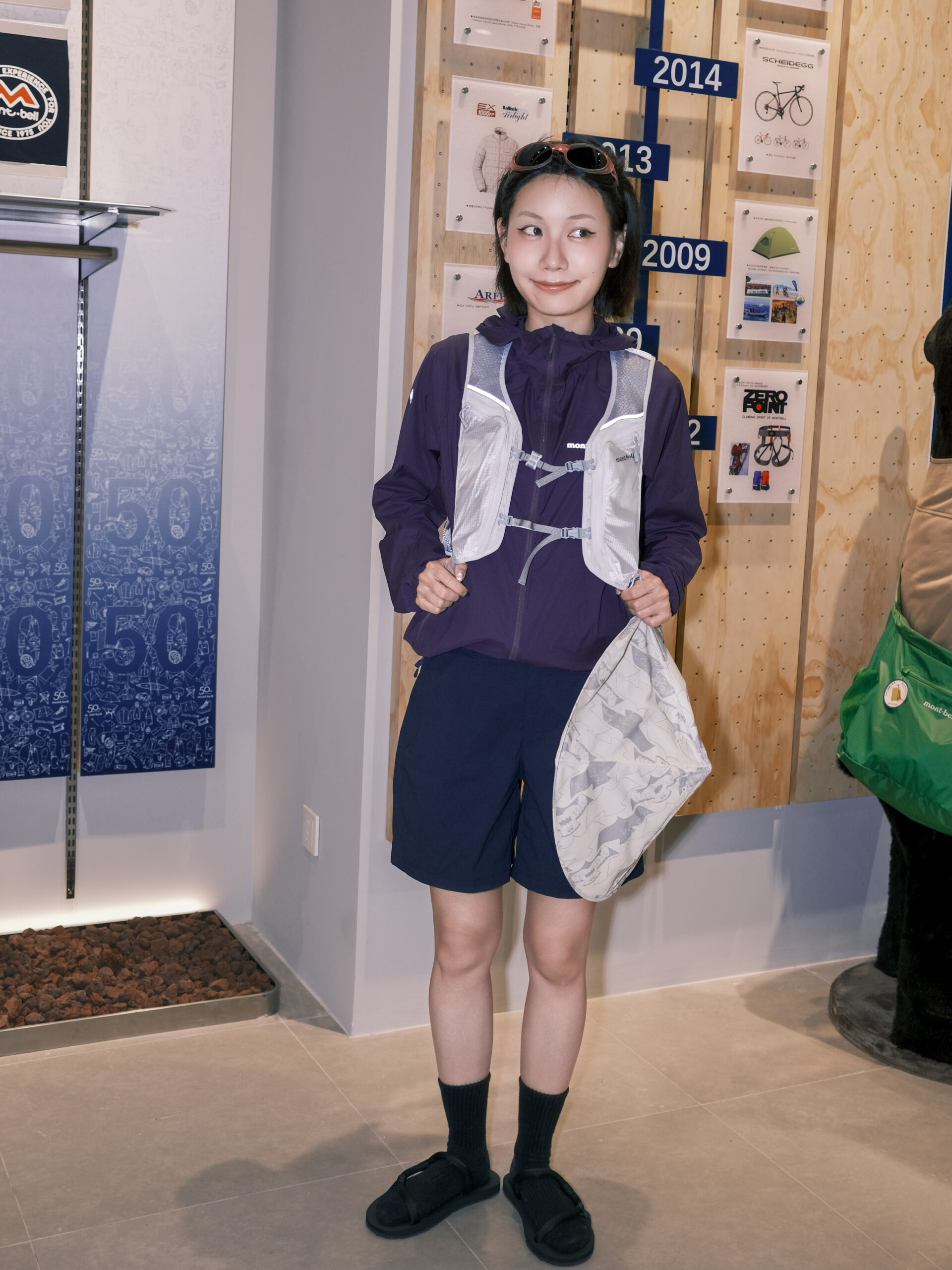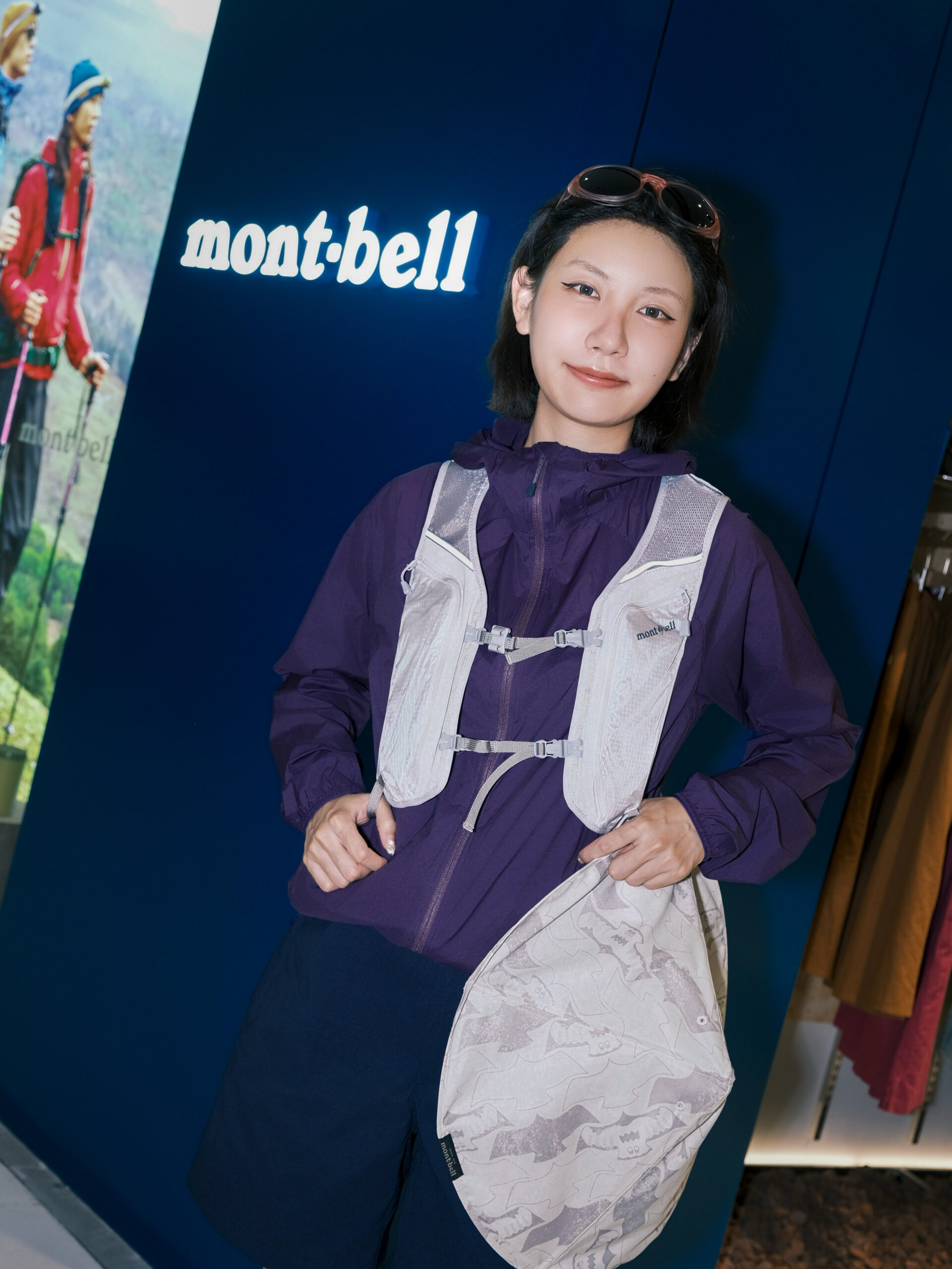 ZAZA 的另一套山系穿搭则巧妙融合功能性与浪漫色彩。紫色 mont·bell 防晒外套搭配同色系蓝紫色短裤和黑色凉鞋,外面套了一件浅迷彩风斗笠,整体干净利落,但又不失层次感。一套兼顾功能性与高颜值的完美出行装备,从城市街拍到轻户外都能轻松驾驭。