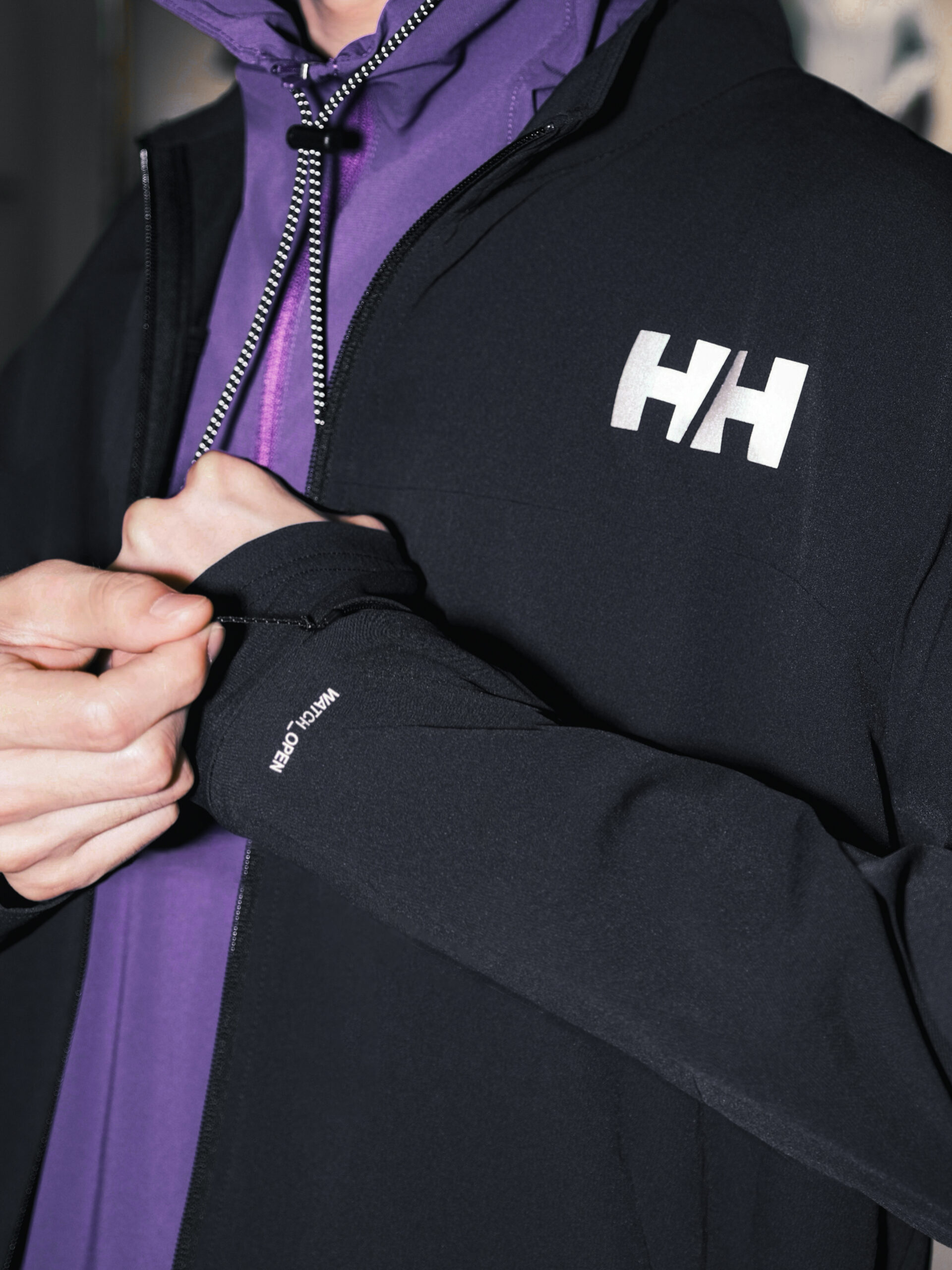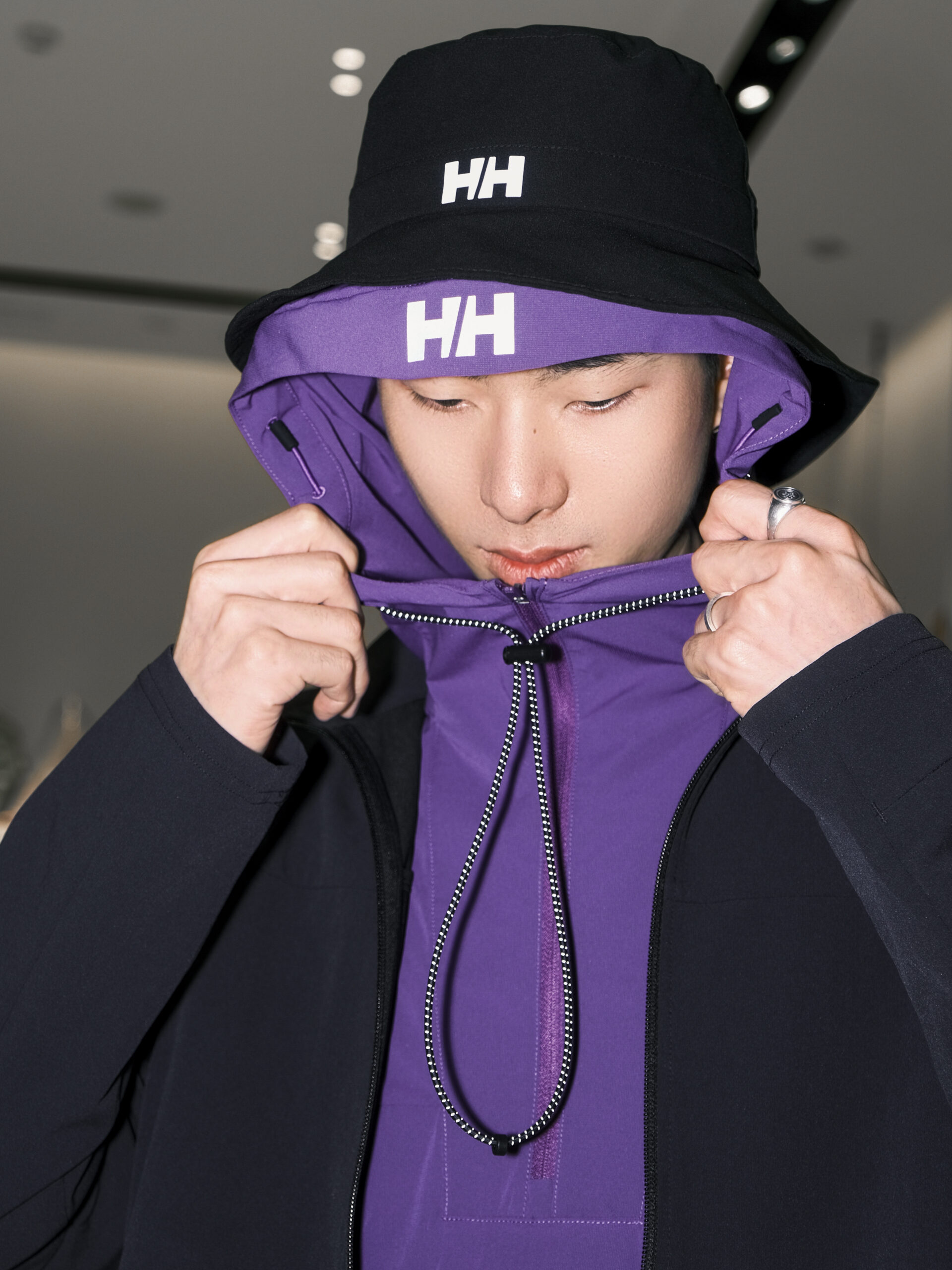 大董的另一套 Gorpcore 造型更偏向于都市机能风,神秘而独特的紫色 HELLY HANSEN H2Explorer 系列连帽梭织短袖成为点睛之笔,为整体户外着装注入一丝浪漫玩味,轻盈透气的上身感,夏天穿着毫无负担,「以风为引」的形容恰如其分。
