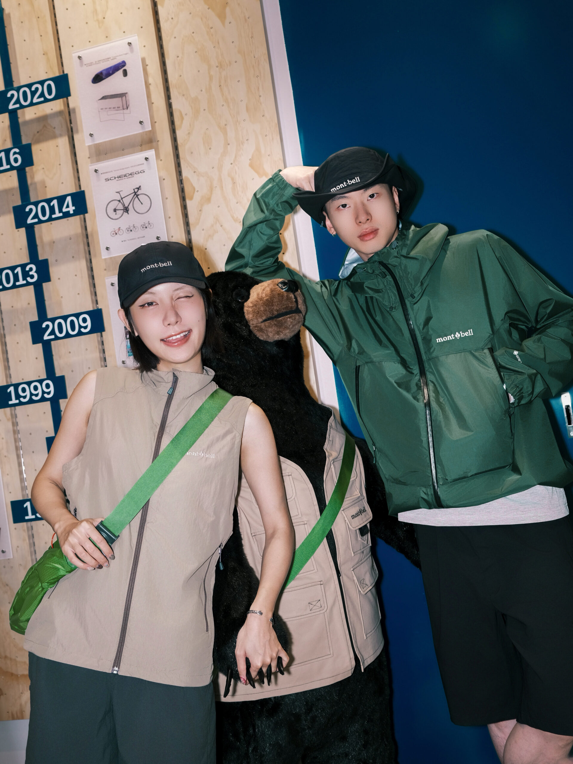 首套情侣造型的核心单品是轻装上阵的活力草绿色 mont·bell 雨舞者冲锋衣,采用 Gore-tex 面料提供可靠的防风防水保护,告别笨重感。搭配黑色短裤和灰色内搭,整体清爽利落,从容有型,营造丰富的视觉层次感。