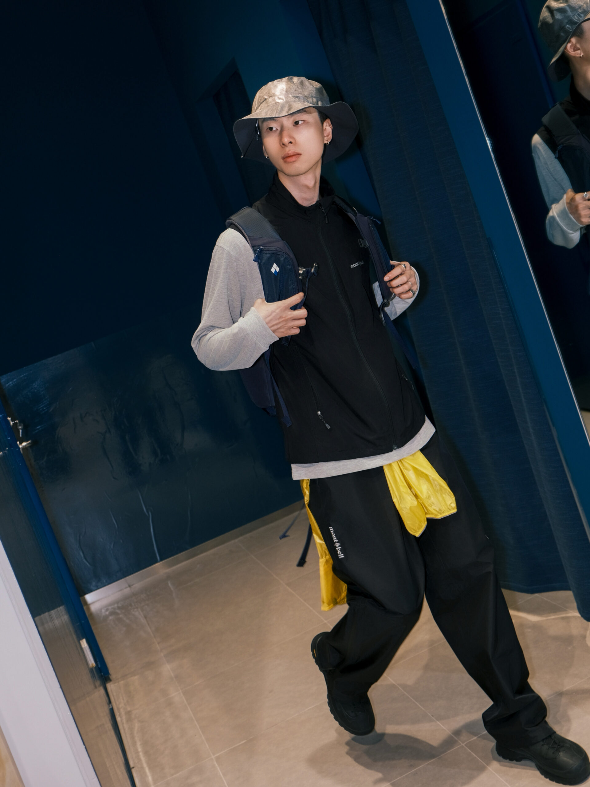 大董的第二套 Urban Outdoor 造型凸显了他的叠穿实力,mont·bell 经典系列马甲内搭防晒的灰色系长袖,下身是舒适兼具耐磨的 Gore-Tex 面料长裤,腰间系了一件亮黄色风壳外套,大胆的亮色系在沉稳黑灰中瞬间跳脱,为造型增添层次感,也可随时穿脱,为应对温差提供保障。