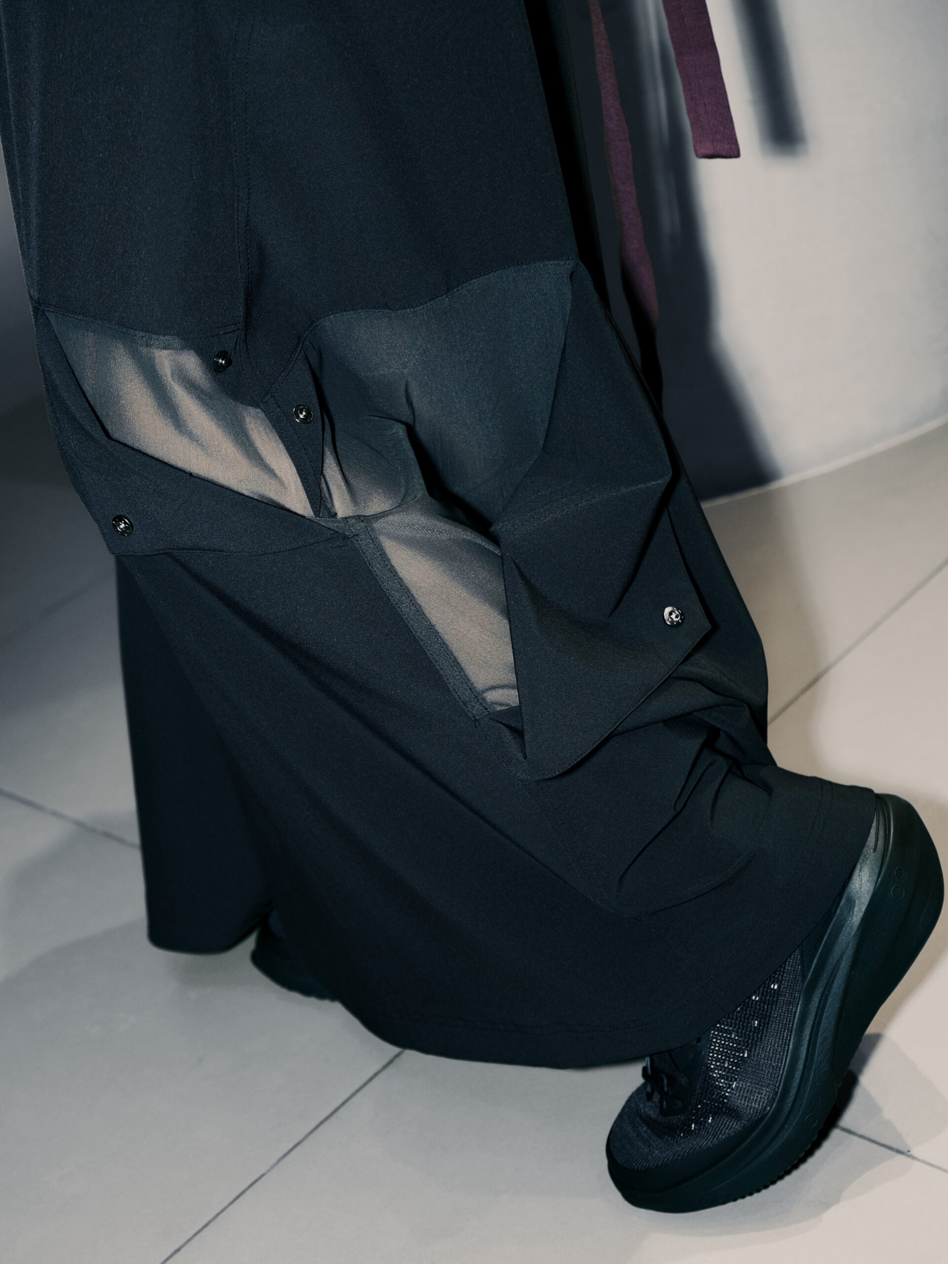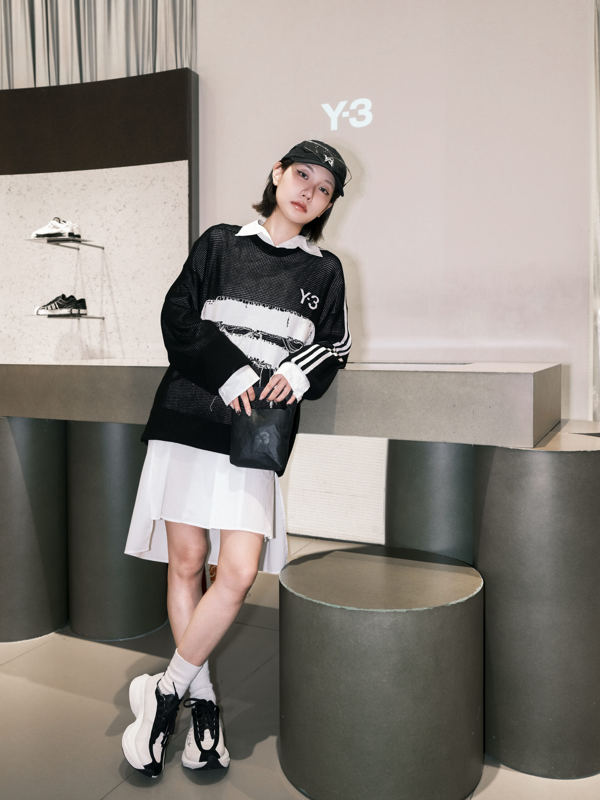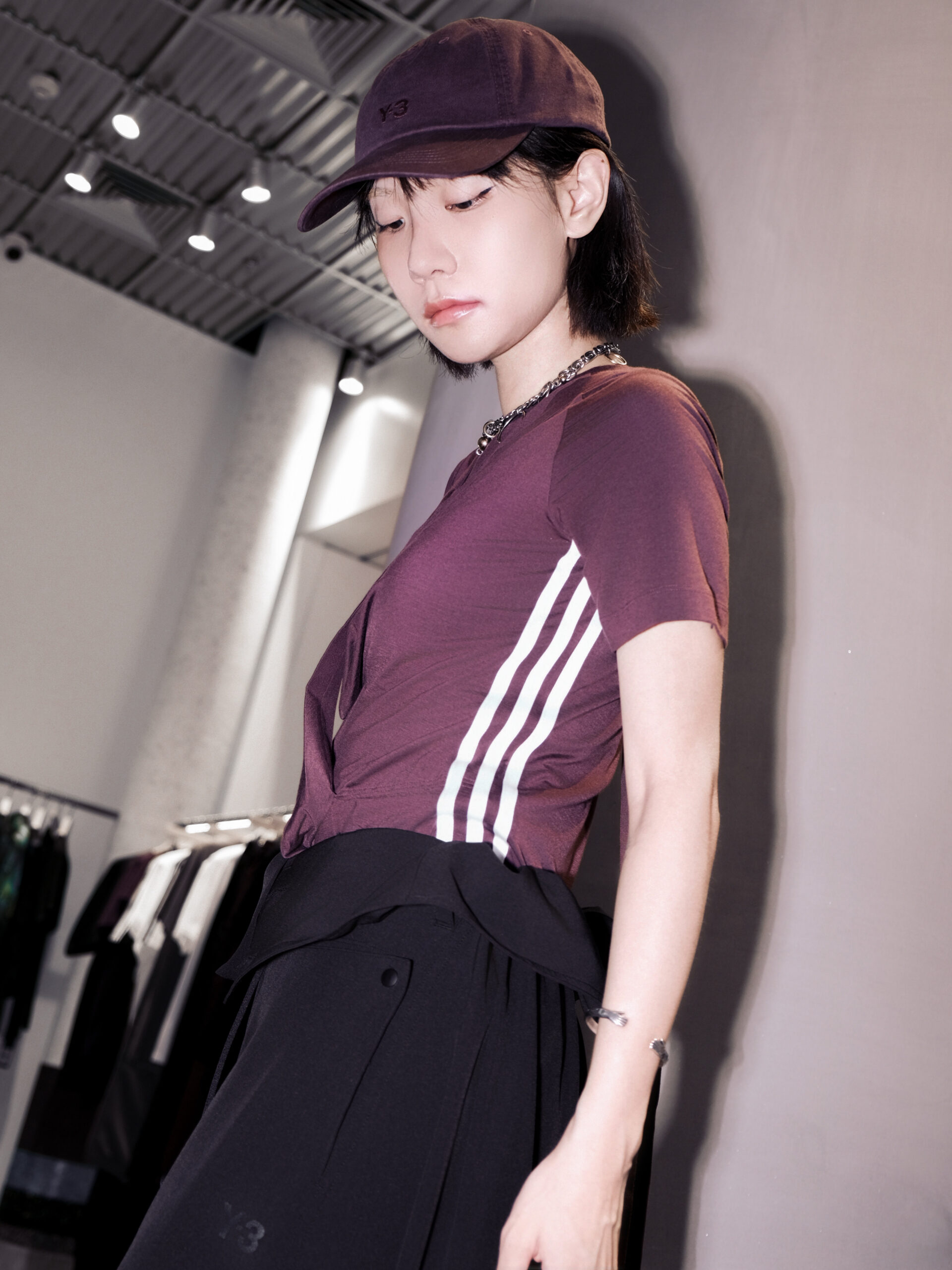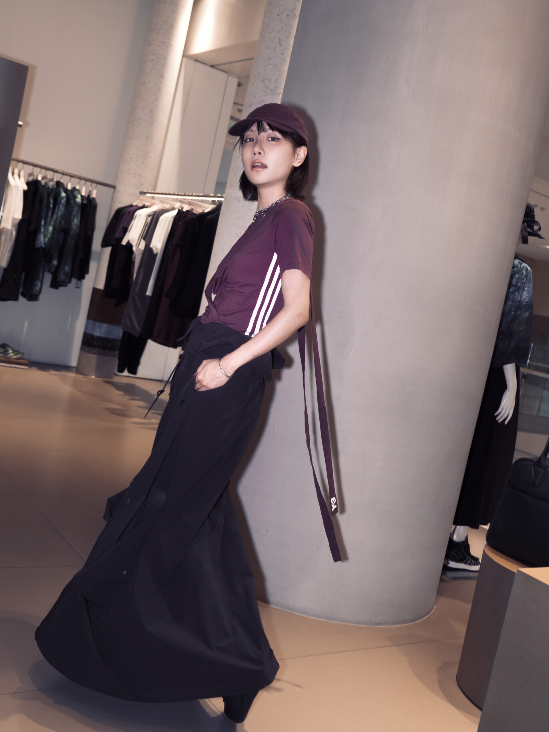 最后一套 Sporty Chic 穿搭,ZAZA 为机能运动感增添一丝柔美力量。酒红色修身 T 恤搭配黑色半身裙,后者独特的工装口袋式设计和翻折的腰部设计凸显 Y-3 的先锋运动感,与修身 T 恤形成柔美与帅气的平衡,诠释兼具时尚与运动的 Sporty Chic 风格。