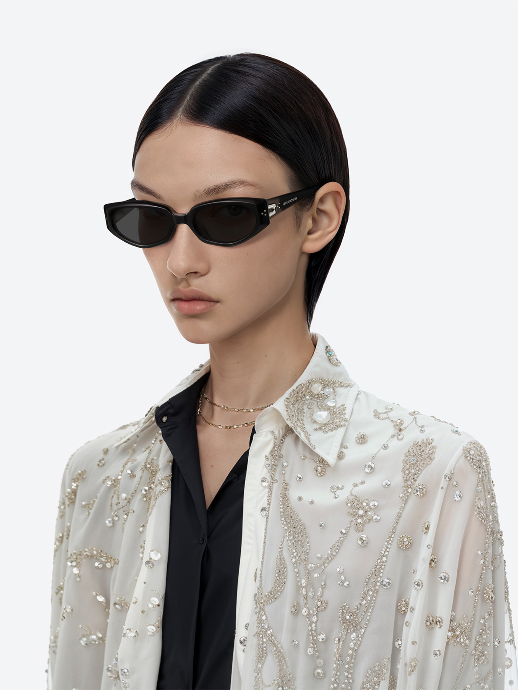 另一款是 GENTLE MONSTER 2025系列 Devon 01,这款由黑色板材打造的前卫猫眼墨镜,廓形被赋予利落线条的现代诠释,复刻 Y2K 时期对夸张廓形和未来主义风格的迷恋,是打造个性 Y2K 造型的点睛之笔。