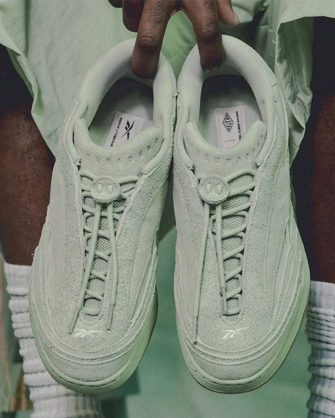 双方仍然将代表着个人元素的薄荷绿贯穿于整个系列当中,而聚焦于鞋款上,这双鞋款 Chukwu ABUO 的灵感实际上来自于 Reebok 品牌档案中的 BB 4000 II 鞋型。采用绒面革、磨砂皮及织物拼接打造颇具质感的鞋面,此外有着特别的线条结构和系带系统。