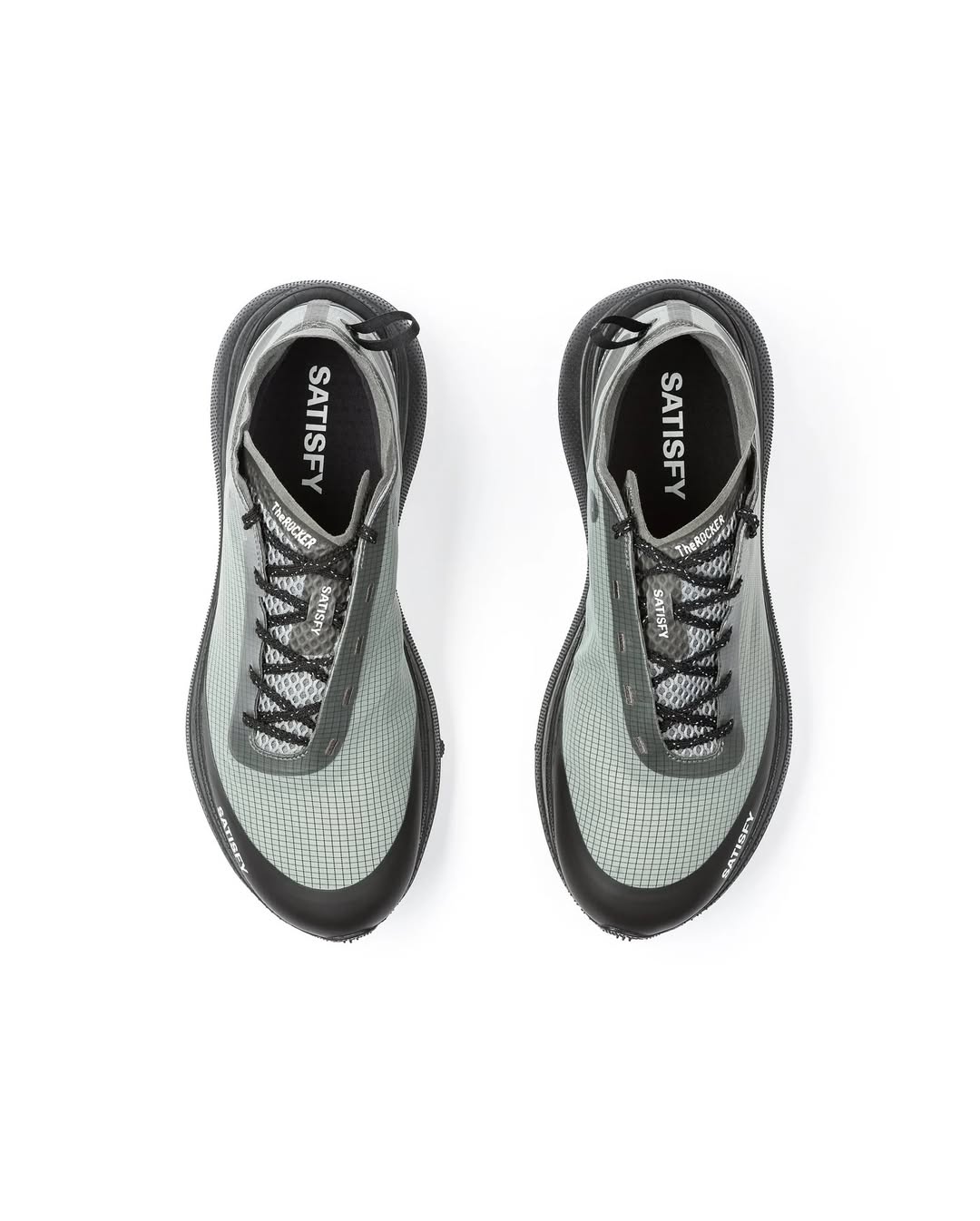 这双名为 TheROCKER 越野跑鞋专为应对崎岖山脊、曲折小径及湿滑地面而设计。在外观上符合跑鞋的一贯流线型经典轮廓,采用非对称的系带系统,延续 SATISFY 一贯特色,其在功能性上有着诸多看点:Rippy™ 66 Monomesh 鞋面由一种名为 Nova® Nylon 66 的材料制成,具备出色的强度与韧性,并且能够有效排出湿气,保持舒适的同时提供高强度保护,应对长时间的越野挑战。而创新的 TuneLug™ 外底设计能确保鞋底在各种地形中提供强力抓地力,Euforia™ 中底则为跑者提供能量回馈,使步伐更加流畅有力。