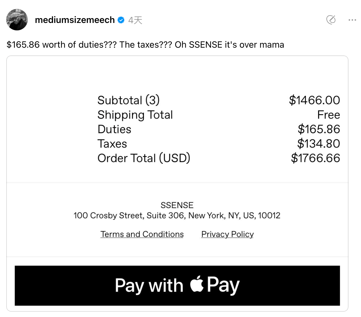 在这次给员工的内部信中,SSENSE 首席执行官 Rami Atallah 将破产归因于贸易政策的突变。美国对来自加拿大的进口商品征收 25% 的关税,同时取消了此前允许 800 美元以下包裹免税的「低值免税额」政策。这一变化直接推高了跨境电商的运营成本,使 SSENSE 的商业模式遭遇重创。