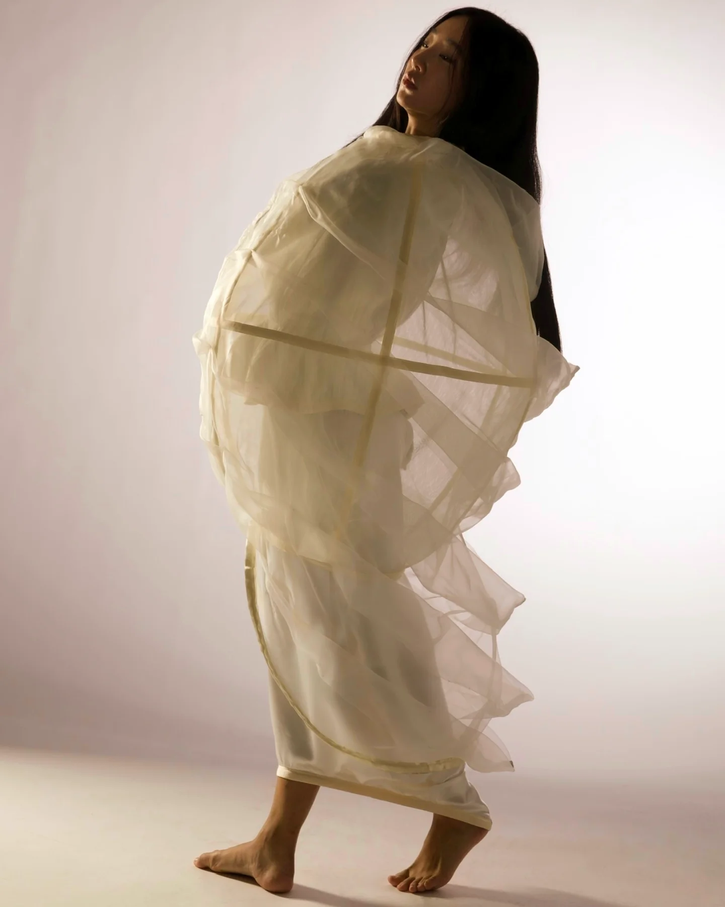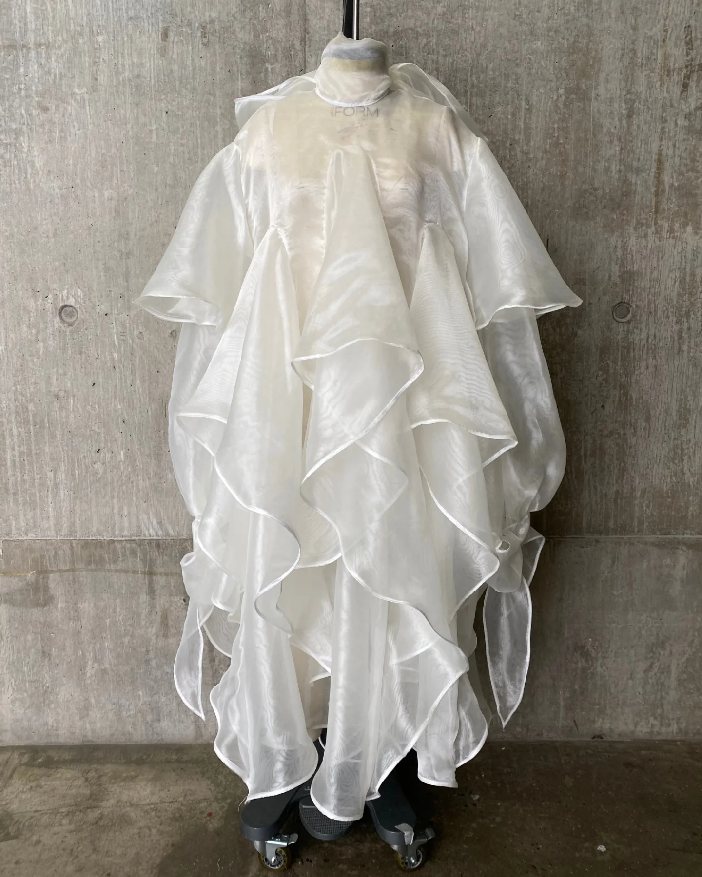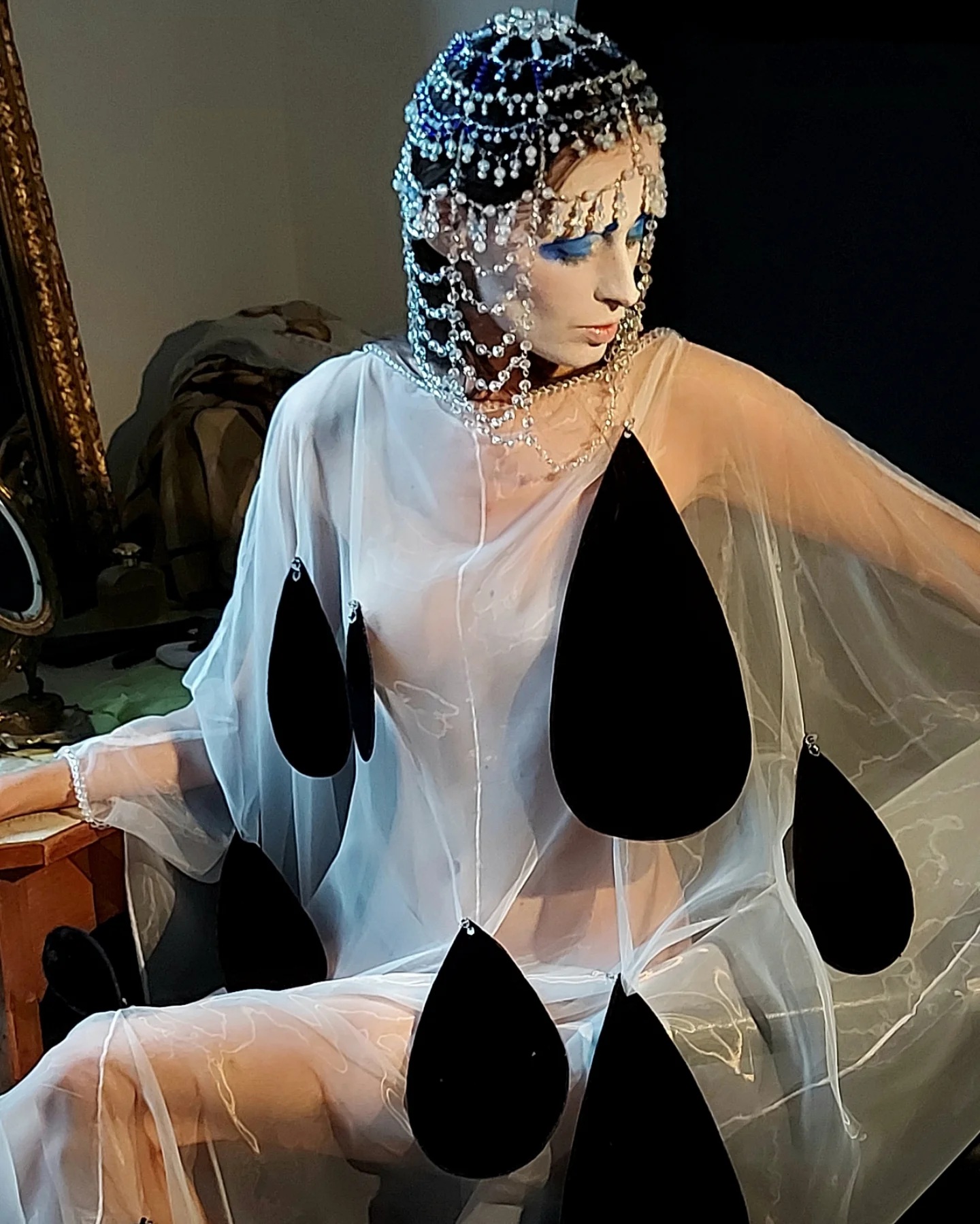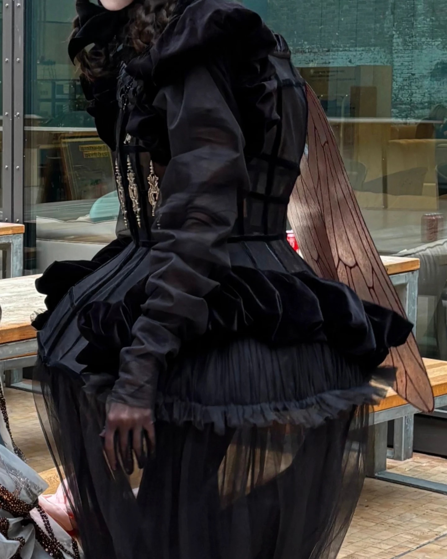 此外,Lady Gaga 在《星期三》第二季中饰演的角色是一位传奇的、具有通灵能力的、像渡鸦一样的 Nevermore 学院教授和幽灵,「Fly Witch」造型亦十分契合剧中角色的气质,既有巫术般的神秘,又带着戏剧性的奇观效果。这一件作品出自比利时年轻设计师 Anton Femia 在今年春季发布的毕业系列,也在此刻正式被全球看见。