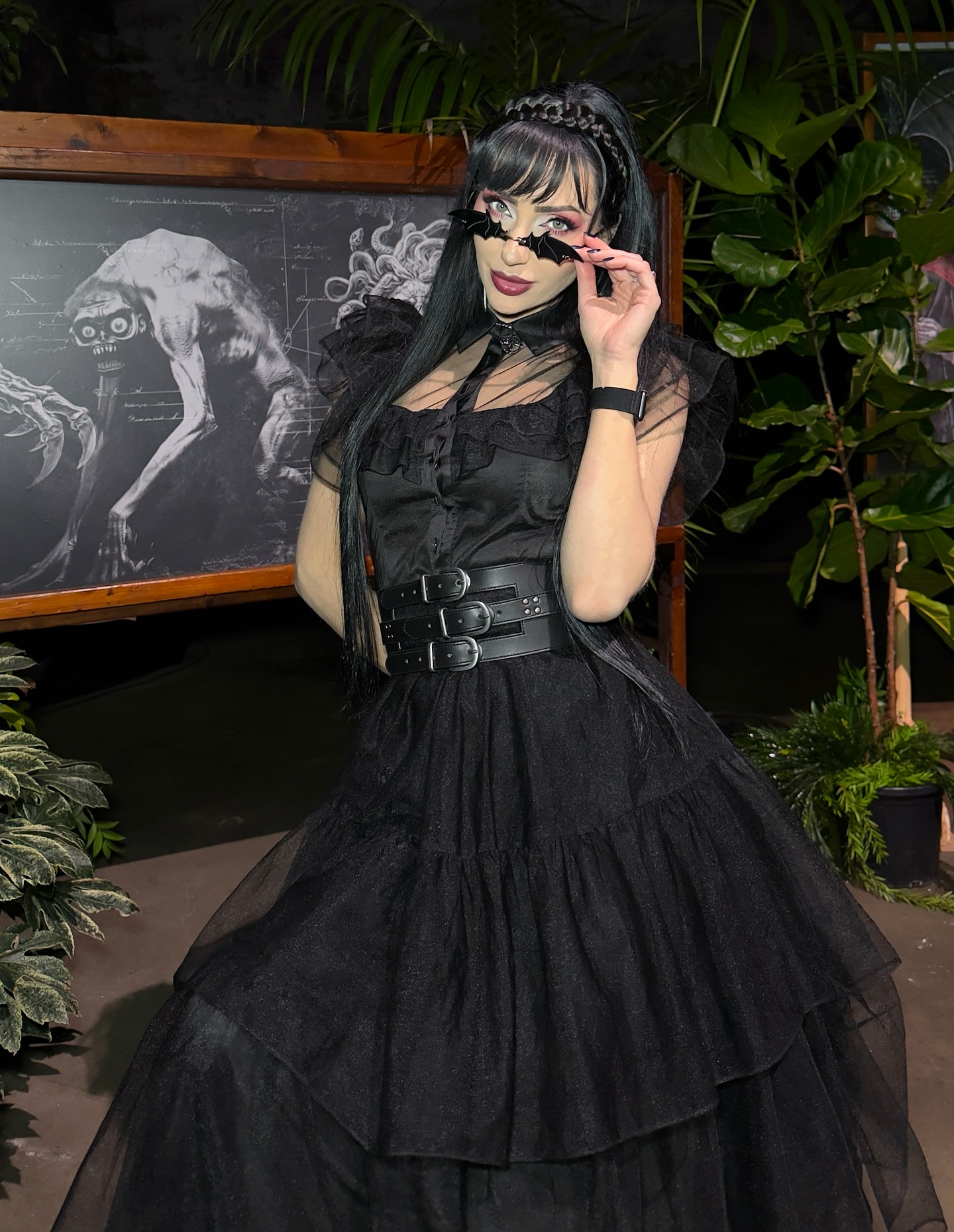 《星期三》第二季的发布聚会以「Graveyard Gala」(墓地盛会)为主题,整个现场布置仿佛置身哥特风格的舞台:昏暗的灯光、墓碑般的装置与神秘的氛围,让嘉宾们仿佛走入了蒂姆·伯顿的电影世界。在这样一个视觉氛围中,Lady Gaga 的亮相堪称全场最高潮。