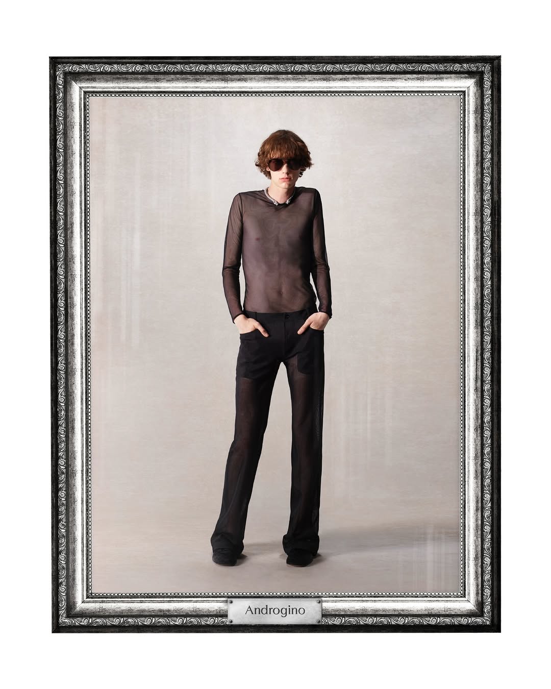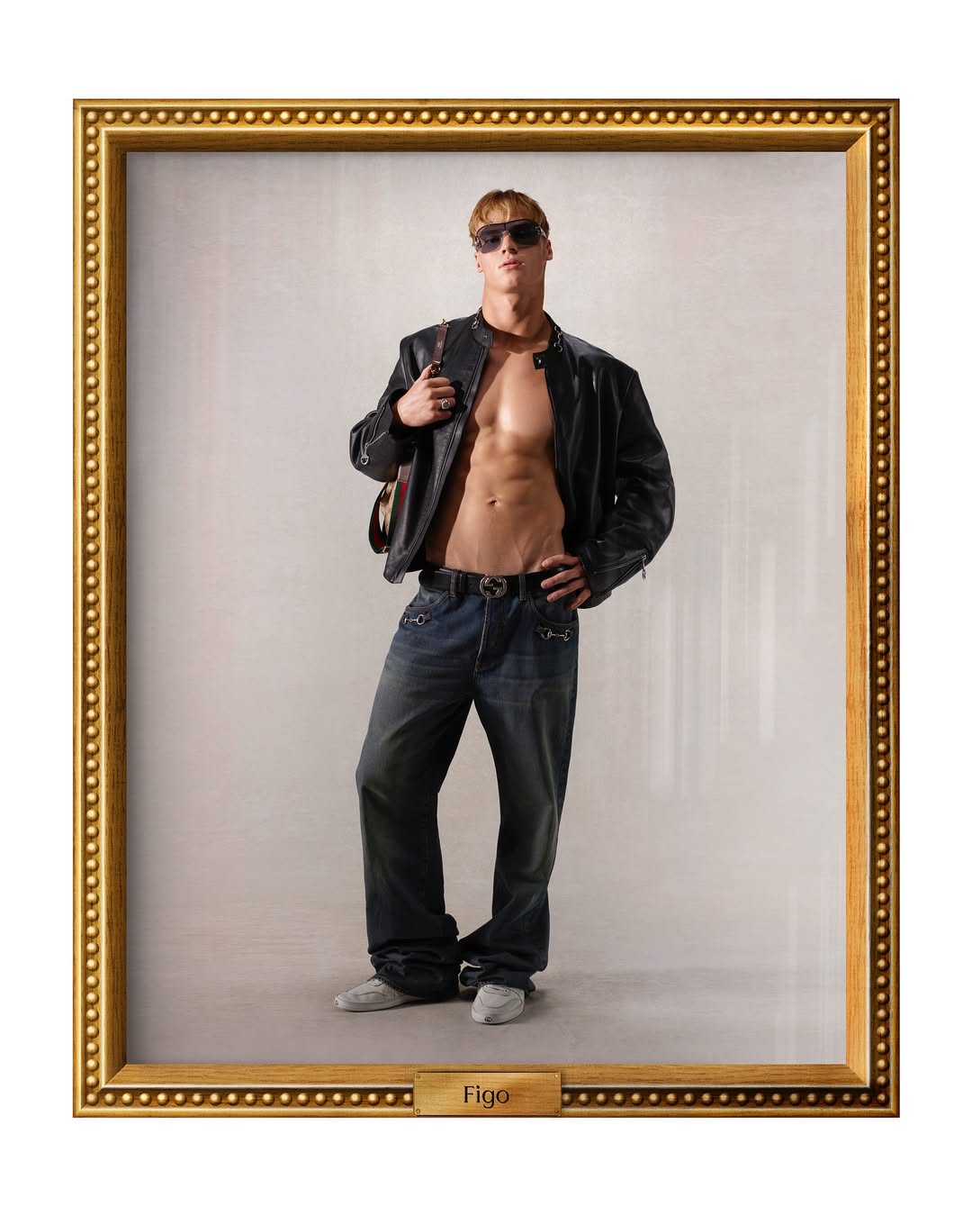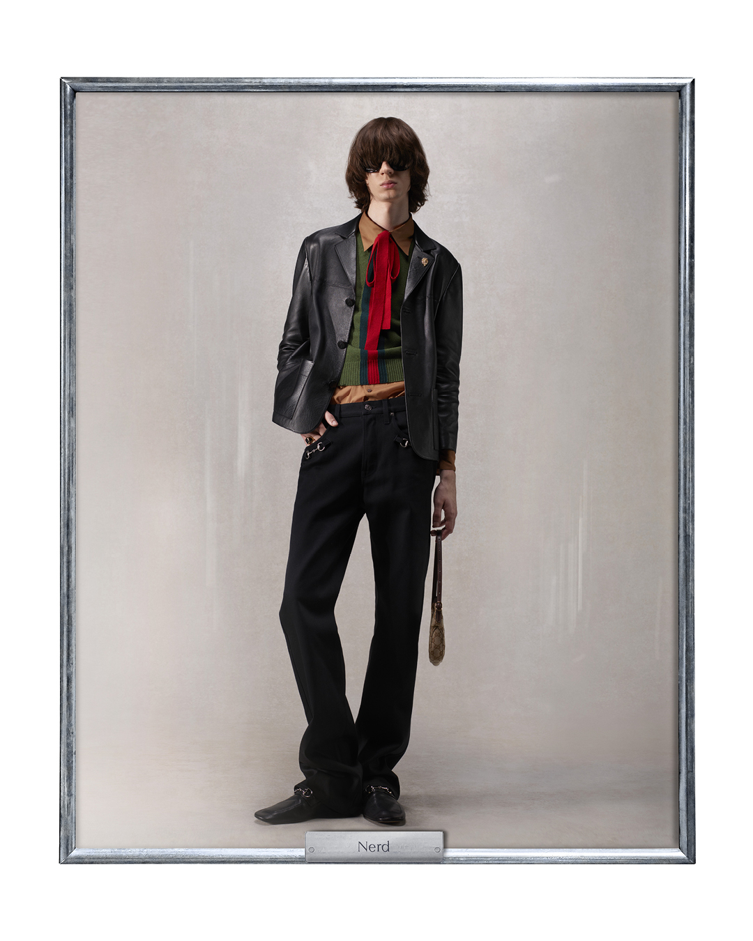 观看型录,Demna 为不同造型塑造的角色,标志着 GUCCI 回归品牌叙事,展现毫不妥协的性感、奢华和大胆,这也是对 Tom Ford 时代 GUCCI 的致敬方式。比如「PARTYBOY」「FIGO」「NARCISISTA」以及「ANDROGINO」等角色,造型充满性感活力,展现出层次与个性。我最喜欢的一套是「NERD」,呼应 GUCCI 70 年代绿红条纹的复古风格,和 BFRND 上身那套的氛围感非常像。