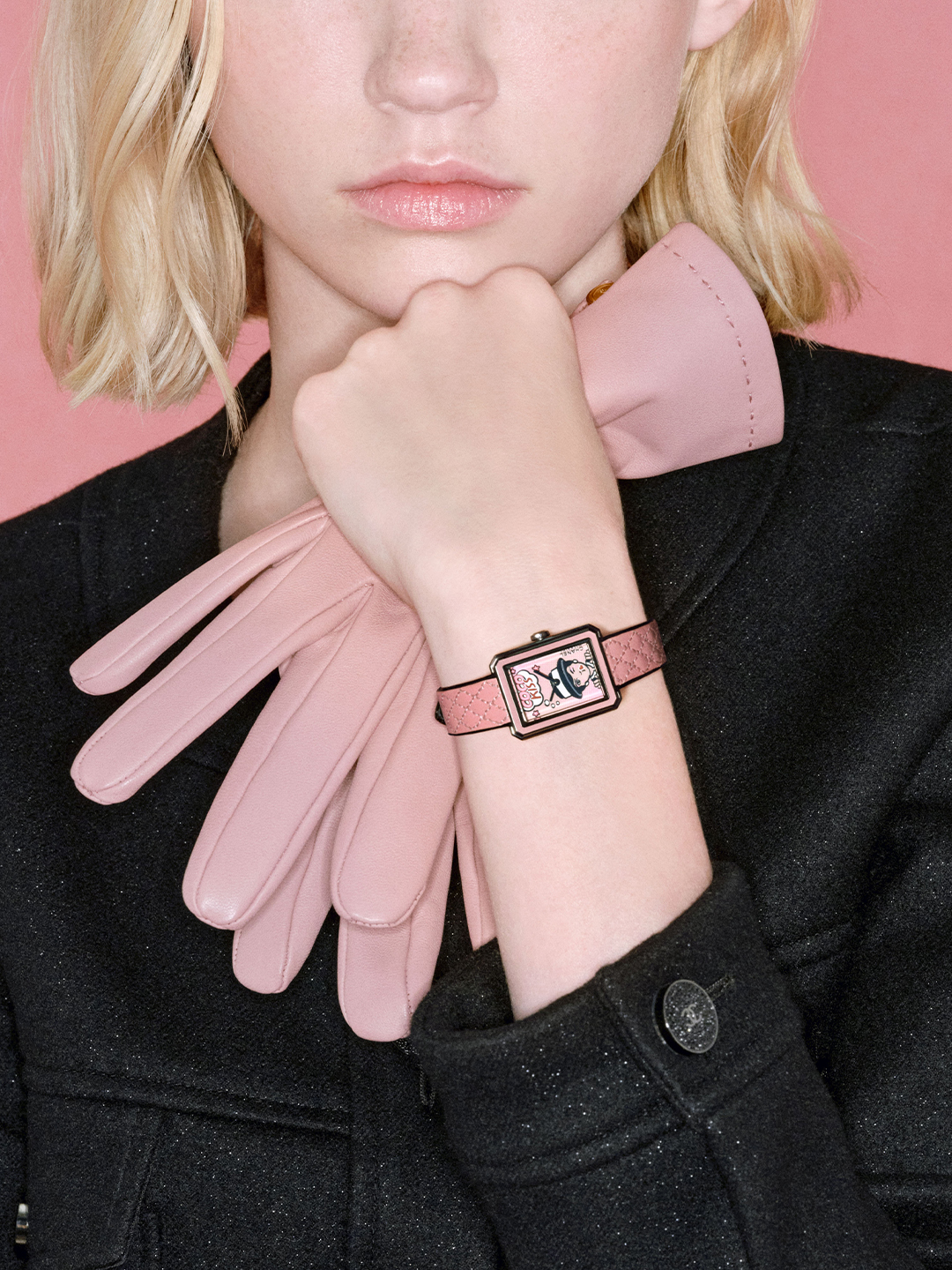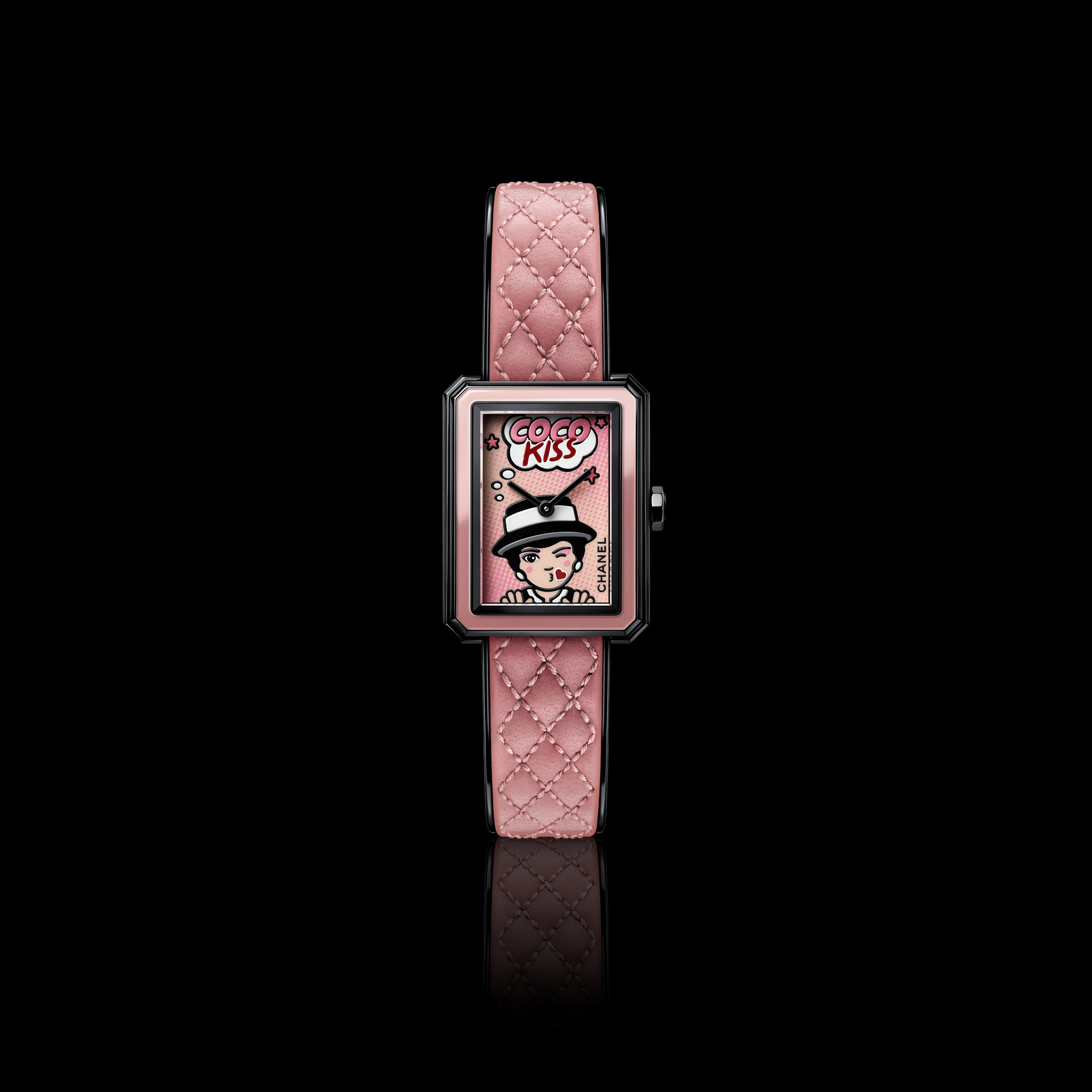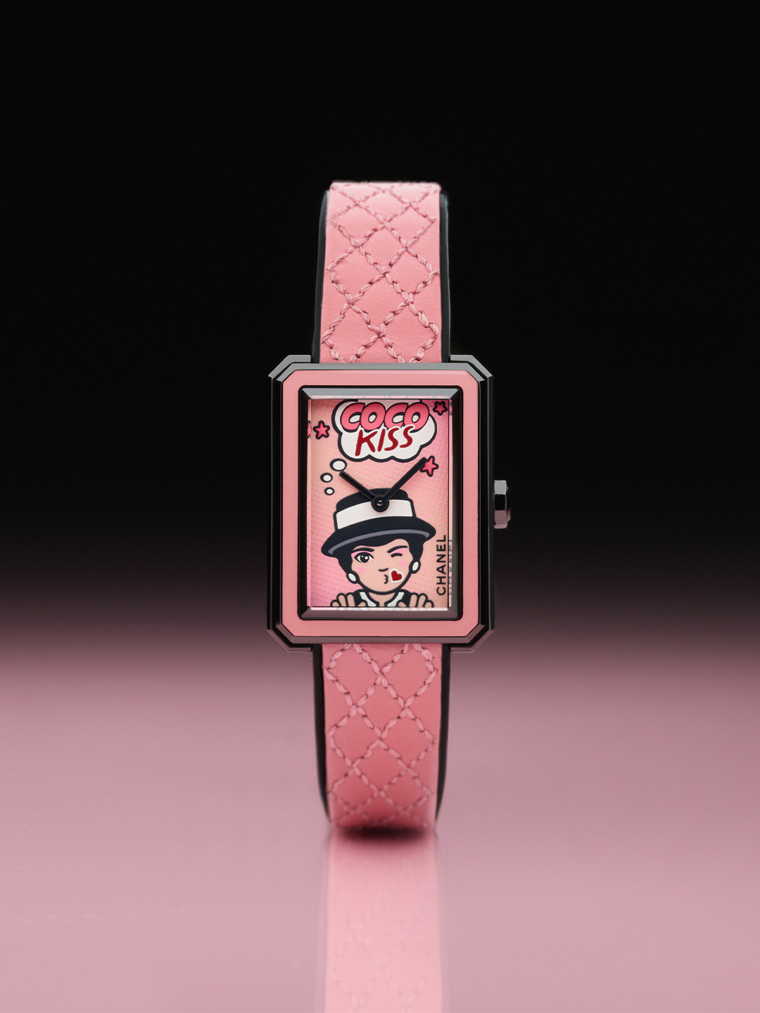 而波普艺术风格的鲜明视觉和美学也在 BLUSH 系列表款中被致意,BOY·FRIEND BLUSH 腕表将香奈儿女士的飞吻图案以卡通笔触勾勒,与粉色渐变的“COCO KISS”字样,结合成表盘基调,粉色表圈与黑色表壳的对比,致敬当时香奈儿女士将美妆产品配以黑色漆面外壳的创举,打破传统制表的严肃感,仿佛「有趣的表情包闯进高级制表工坊」。