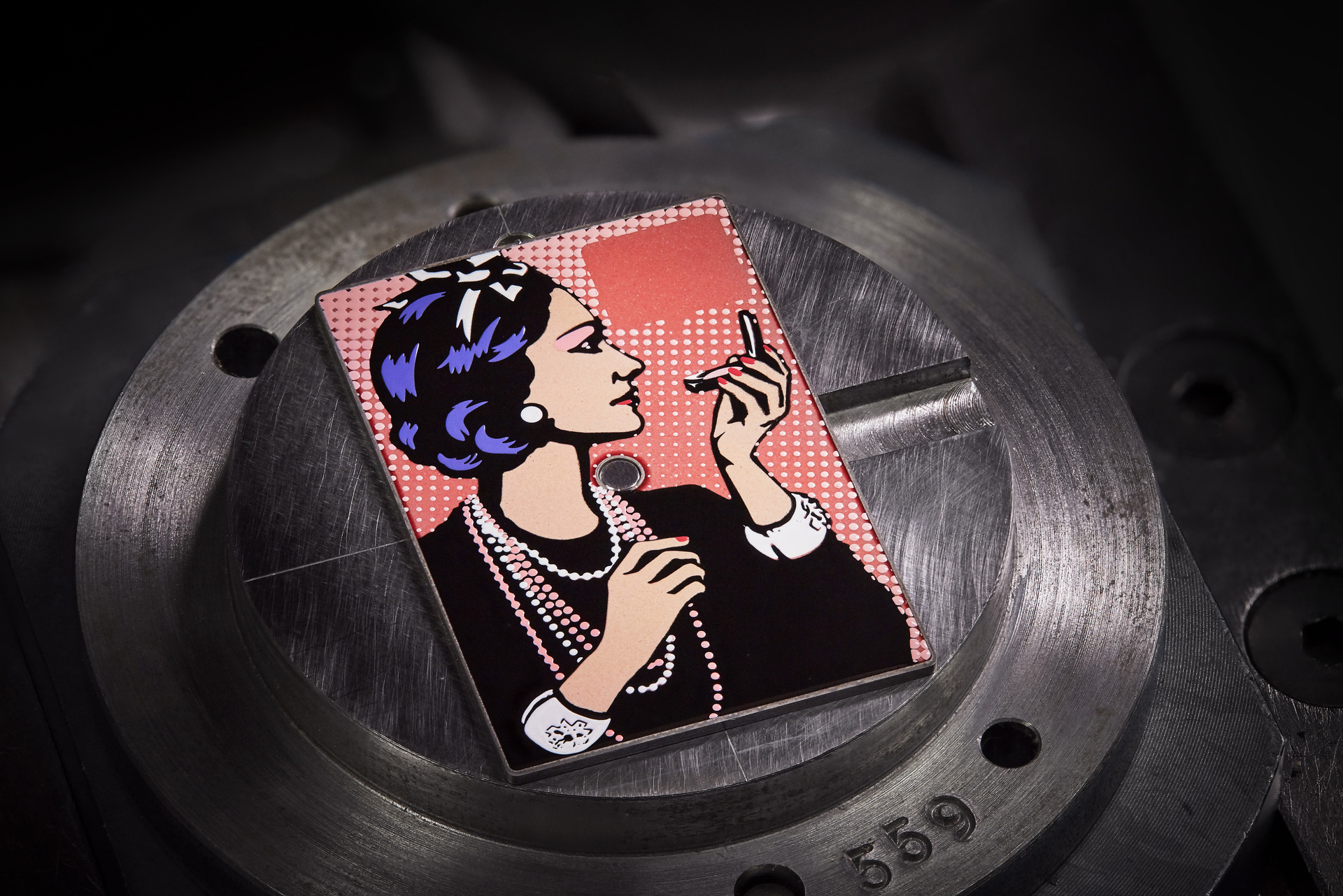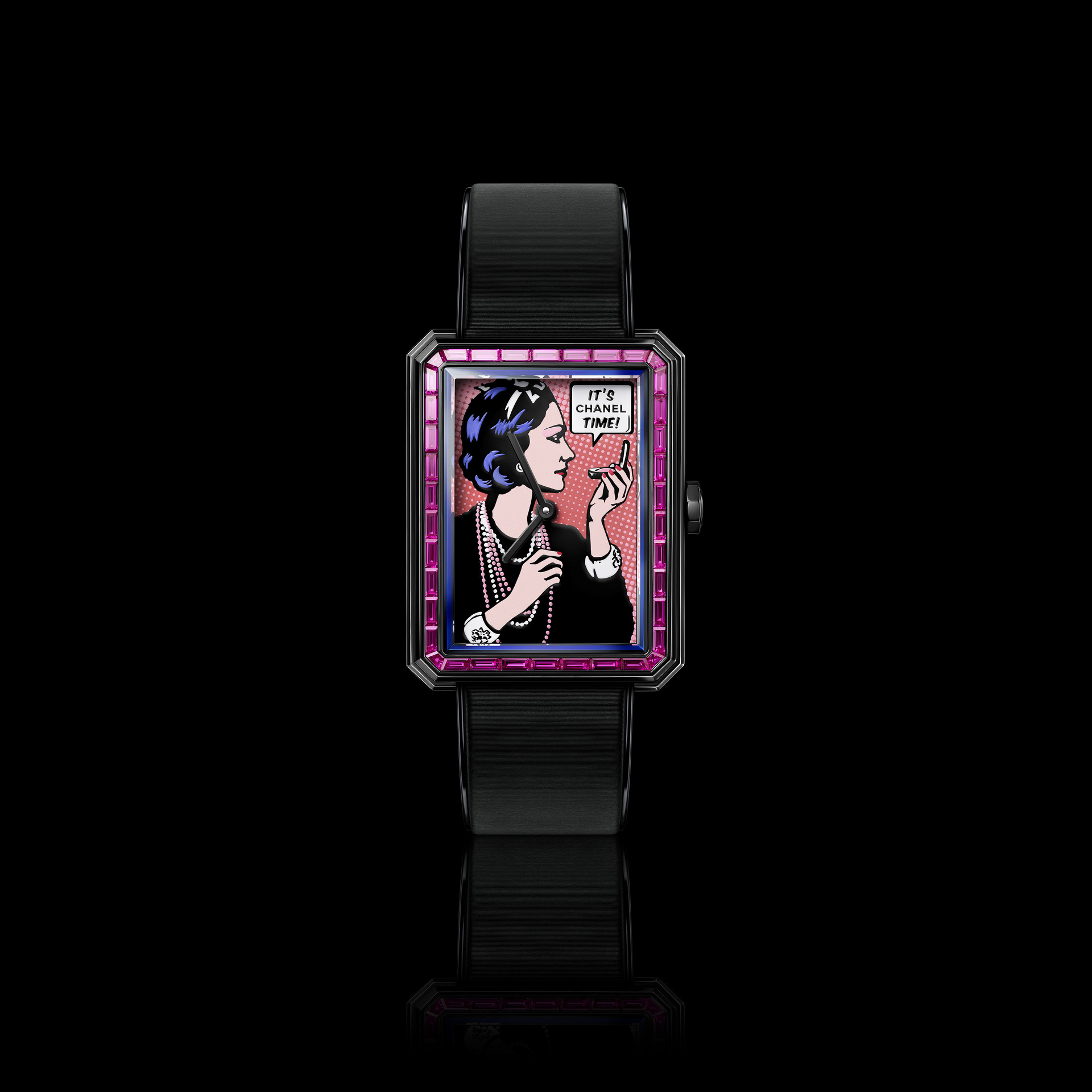 在 BLUSH 系列之中,CHANEL 更把如网版印刷般多层次拓印的工艺放大到极致,BOY·FRIEND “COCO ART” 腕表,在延续波普艺术审美的基础上,表盘是香奈儿女士凝视粉饼盒镜中自己的形象——色彩与风格呼应美妆启发。它以拓印技术在白k金表盘上,通过手工压印12层图案制作而成,并用大明火珐琅工艺制成粉色调背景,粉色调的表圈更镶嵌了 38 颗长阶梯形切割蓝宝石,呈现出深邃的立体层次。
